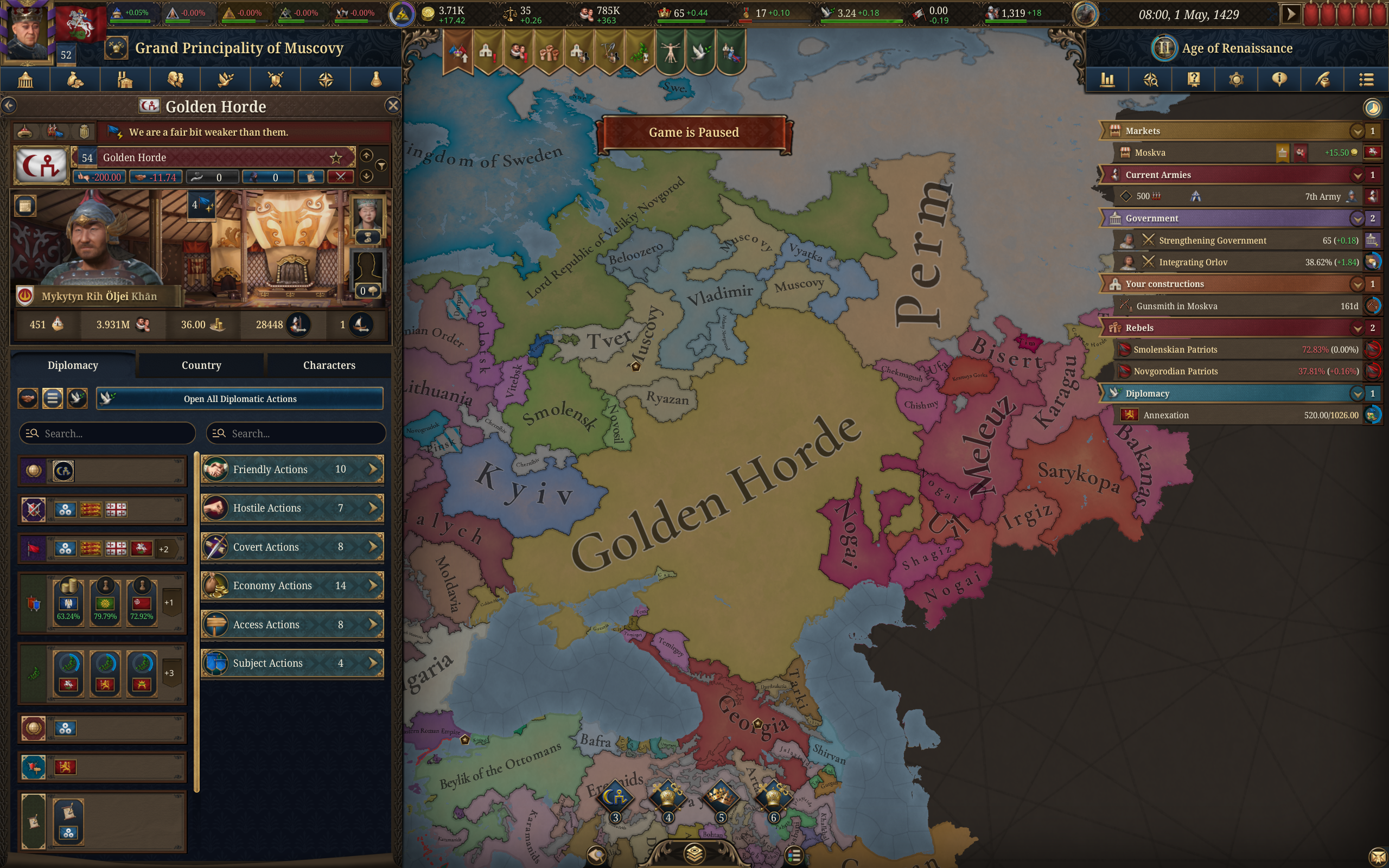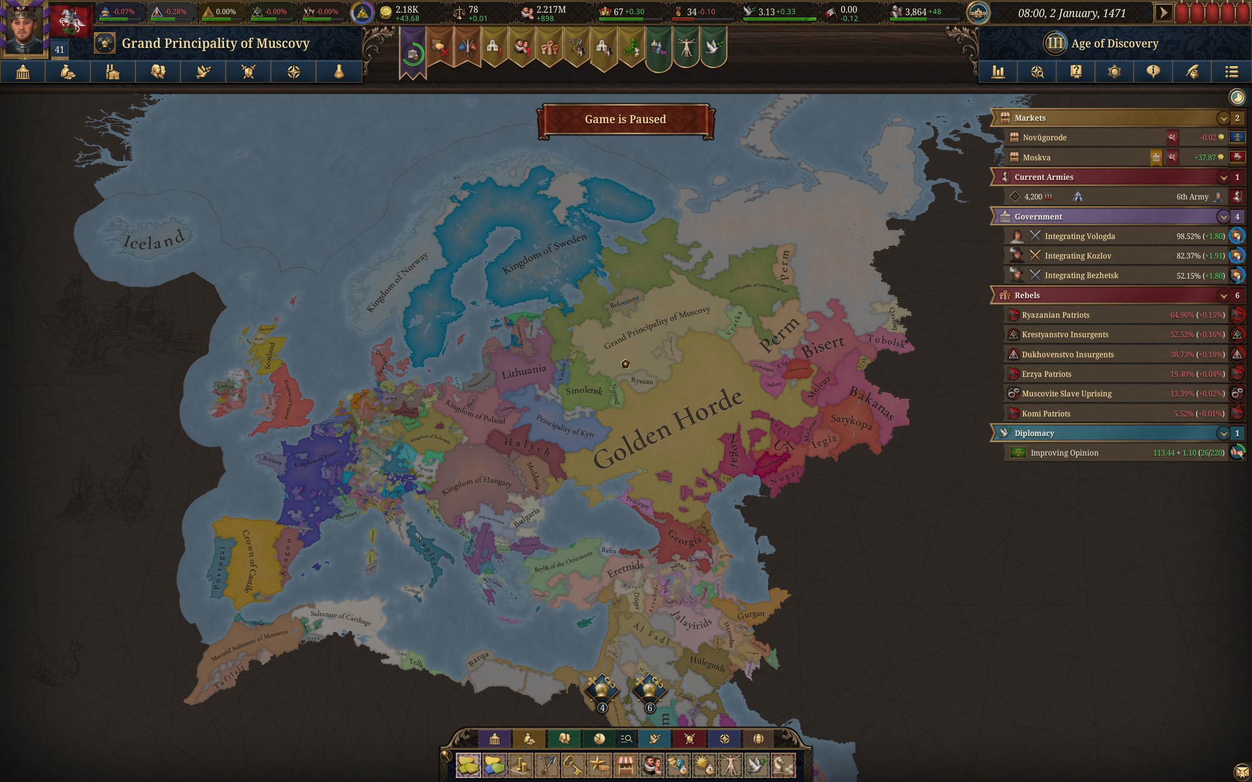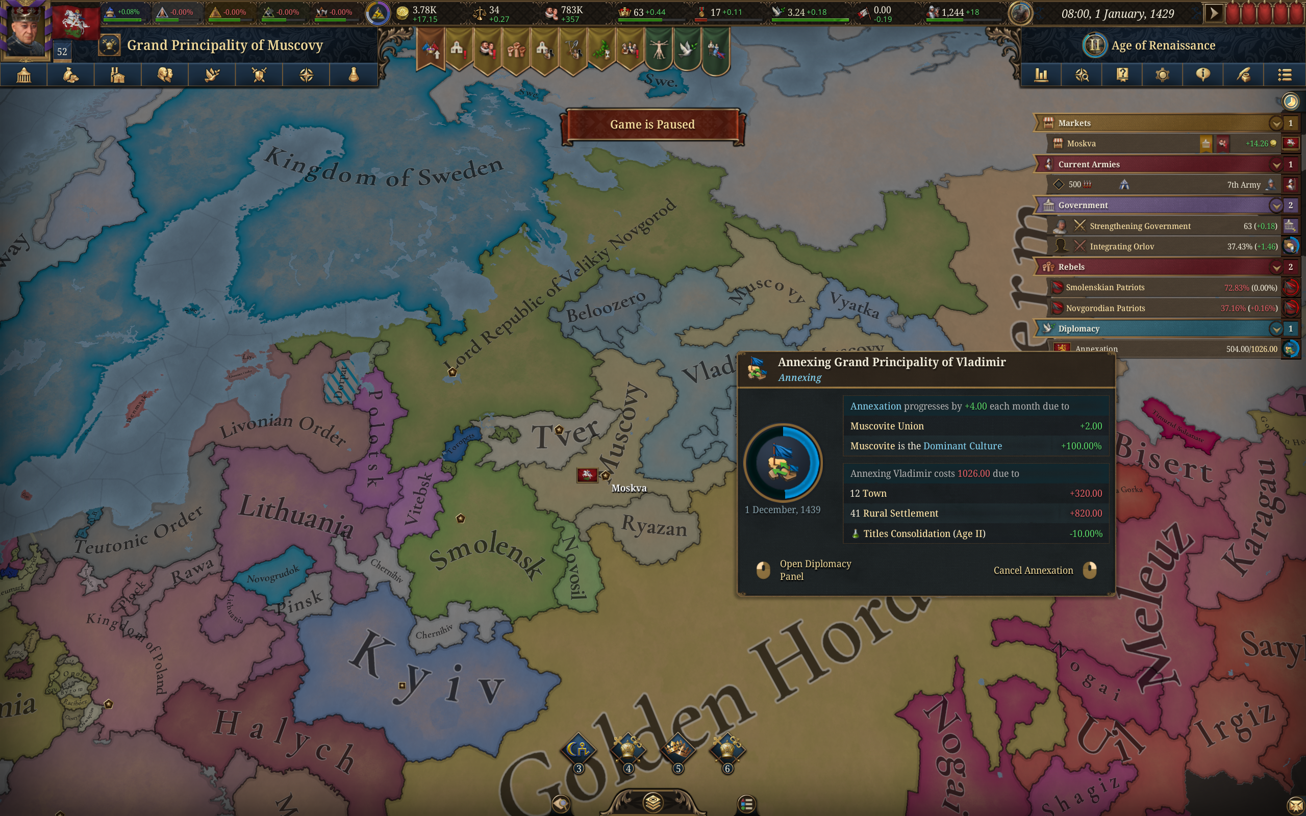 Унии - игрушка дьявола, ежжи. Если играете за Москву, то старайтесь их делать своими вассалами. Ведь чтобы присоединить членов унии нужно проголосовать за законы, позволяющие это делать. А не факт, что все за них проголосуют, ведь если кроме тебя ещё 3-4 ии болванчика голосуют против закона, то ты его никогда не примешь. И чтобы принять законы на интеграцию нужно ждать 50 лет. К тому же члены унии могут сами устраивать войны, например Тверь влетела в Новогород, который был в союзе со Смоленском. А войск-то сука нет, ибо ордынцы требуют кроме бабла ещё силу мужика, так что приходилось воевать голым ополчением. Но благо Тверь смог сдеоать вассалом, а Владимир сам сделал вассалами или сожрал других членов унии и оставшись с ним вдвоём я смог протащить нужные законы. В общем покрас не радует глаз из-за этой ебли с унией, зря я начал с ней играться. Долго ещё шли институты, недавно совсем профессиональную армию открыл, щас изучу войска и пойду карать орду, блашо их тиур покусал.