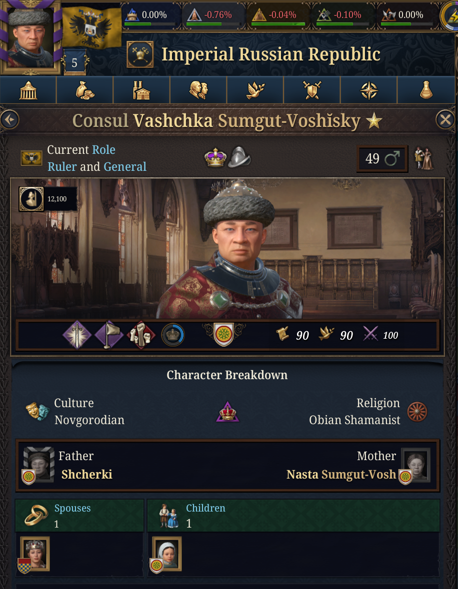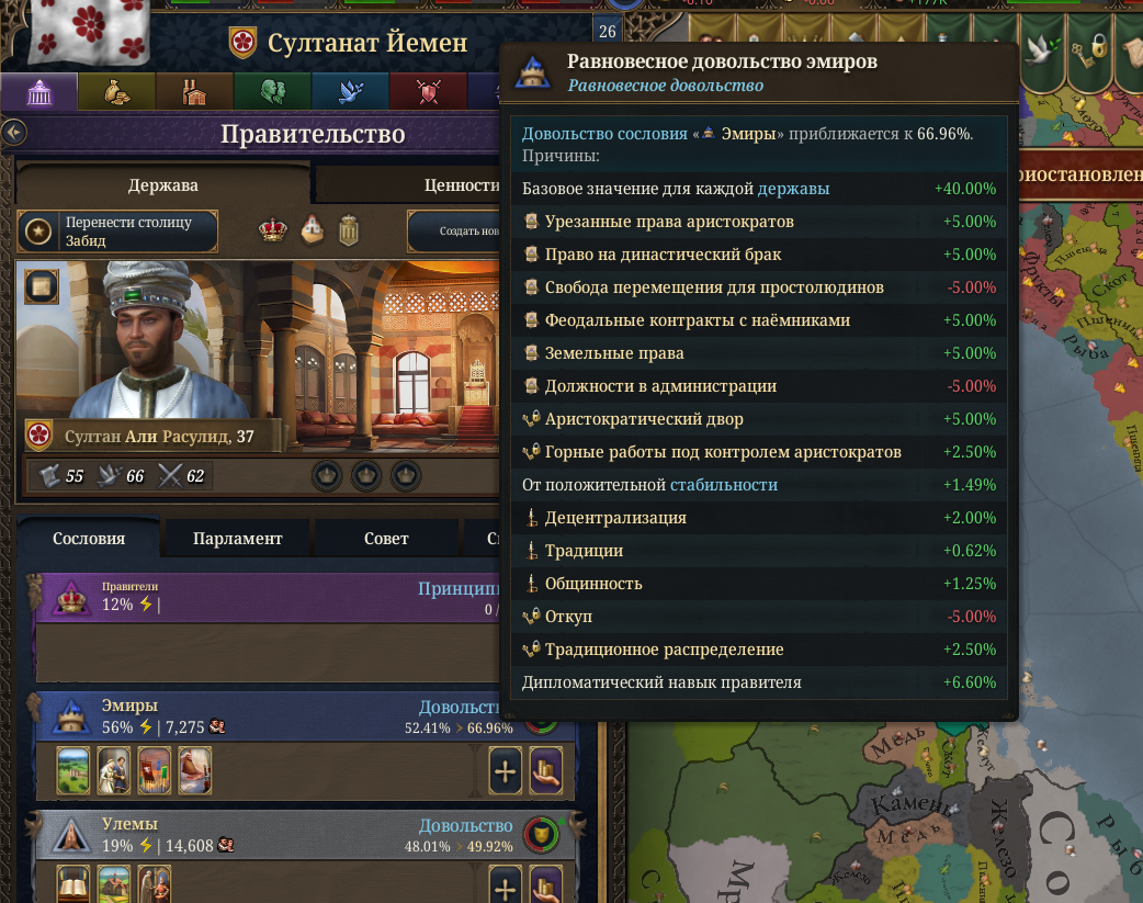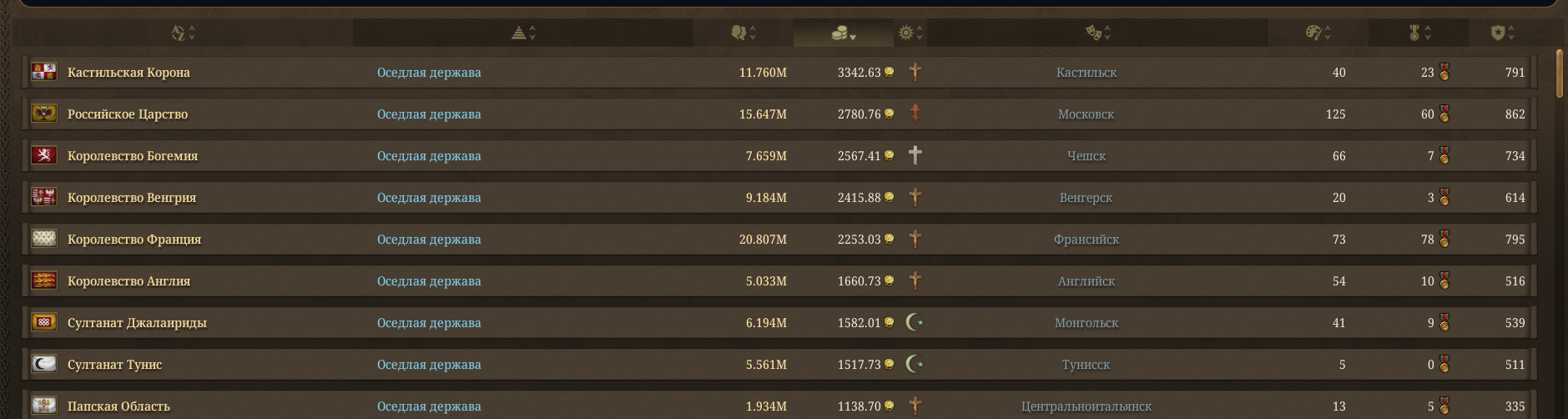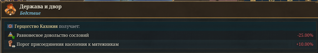 >>50450428 Сословия не обижаются от того что ты им даешь привилегии, но обижаются когда даешь привилегии другим сословиям, в подсказке даже пишется сколько лояльности будет утеряно. Зная это у тебя вообще не должно быть восстаний. Другой важный момент это ценности в стране, а именно те которые дают равновесную лояльность, например традиции, общинность и децентрализация. Еще важна легитимность, ее надо держать на сотке, и стабильность, ее надо держать в районе 50 потому что чем ее больше тем ниже прирост и ~50 это оптимально. Третий важный момент это парламент, во время его все сословия получают дополнительный прирост лояльности, если она ниже равновесной. Четвертый важный момент это сила короны, которую можно повышать благодаря принципам и представительству коронных людей (чаще всего родственников правителя в случае монархии) в совете, в генералах и адмиралах. В идеале все советники, генералы и адмиралы должны быть членами правительственного сословия, а один из правительственных советников главой совета (пкм по советнику и "сделать главой совета")