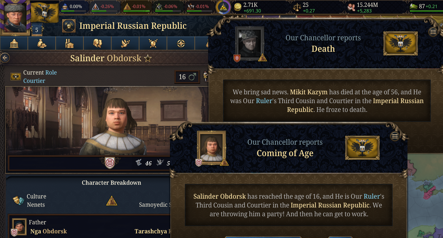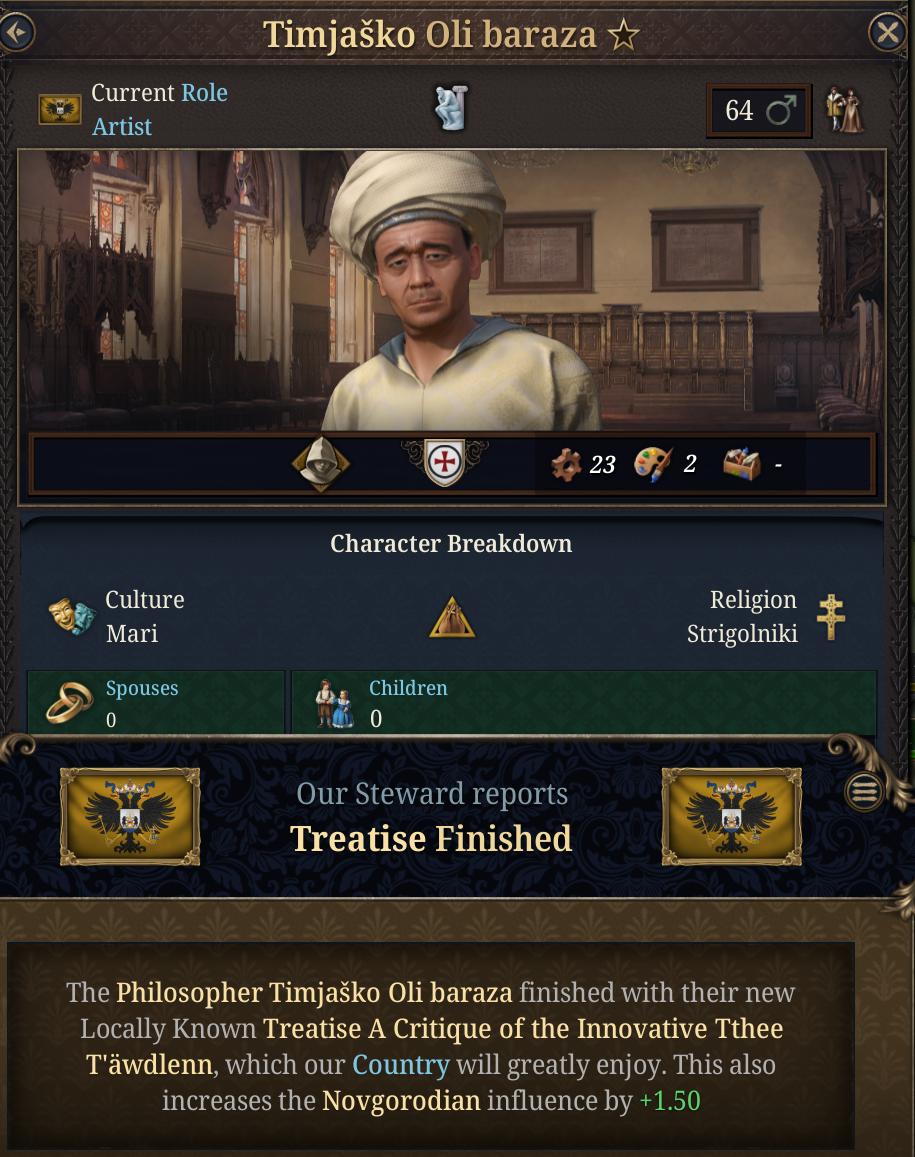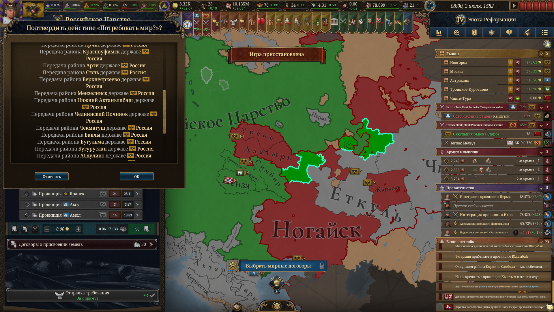 >>50450499 Я хотел посмотреть что будет если дворяне восстанут, будут ли какие-то интересные ивенты или вообще какие механики восстания есть, что вообще будет при восстании дворян и как это дело пойдёт дальше... ну типа уменьшится ли сословие дворян по итогу, смогу ли я отобрать у них все права в свою пользу или в пользу сословия горожан скажем, то есть мне был интересен процесс этого всего... в итоге я получил 8 лет тягомотины и восстание завершилось..... 1 окошком, где мне написали, что я победил и пришло время наказывать виновных, но никого наказать и казнить не дали