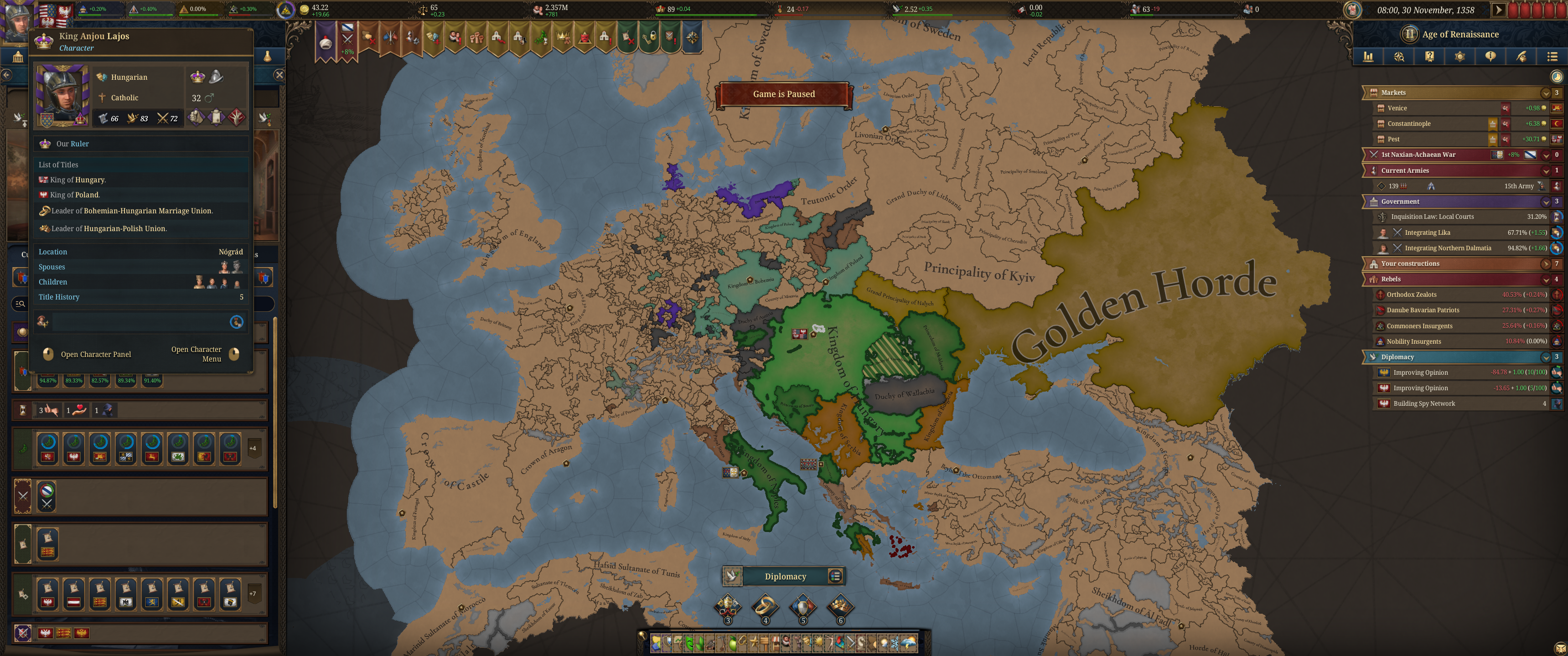 Венгр решил повоевать и у него все шло хорошо, пока не кончились регуляры. Потом он слил 300 тыщ пополчения. Круто все-таки сделали, что война прямо по экономике бьет.