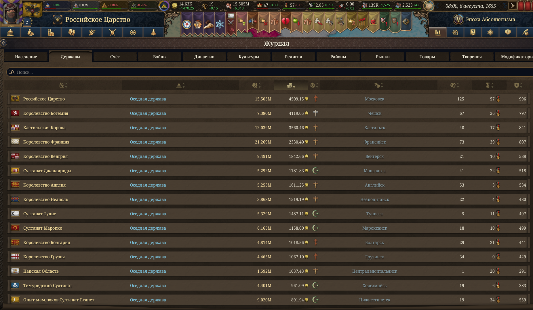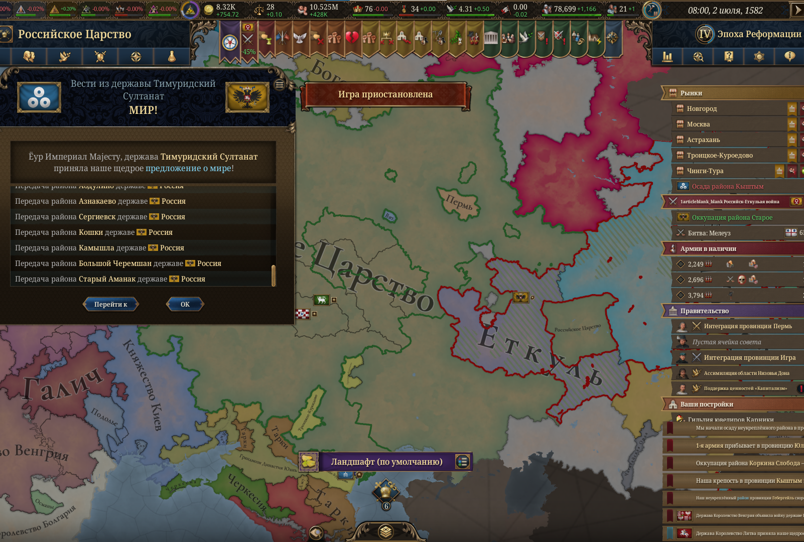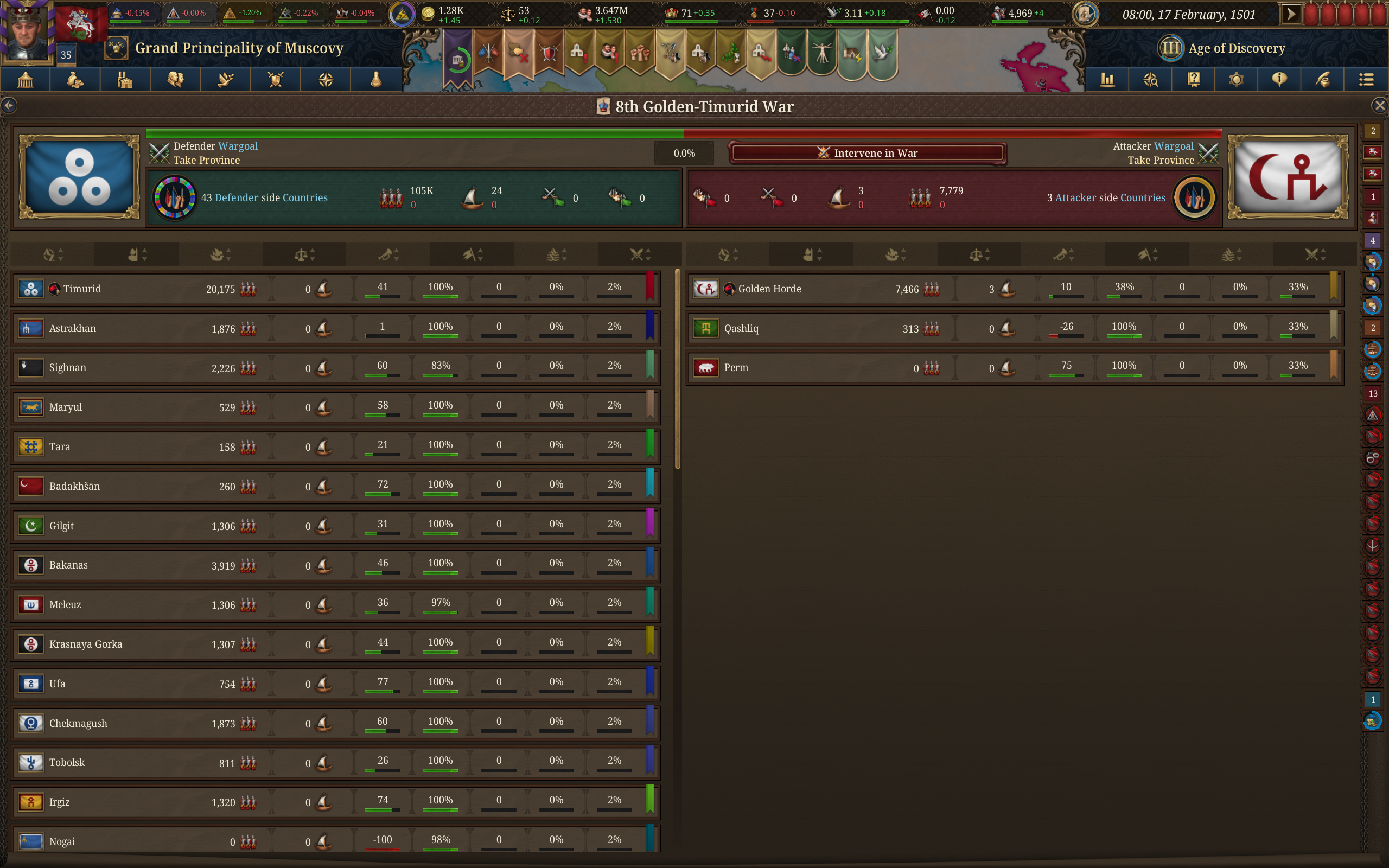 Надеюсь поправят пассивность ии. Сосман не сожрал византию. Былл войн 5 или 6 между ордой и тимуридами, но они заканчиваются ничем кроме самой первой, когда орда потеряла земли на востоке. В остальном всё как-то тихо-грустно. Надеюсь дальше разгонится.