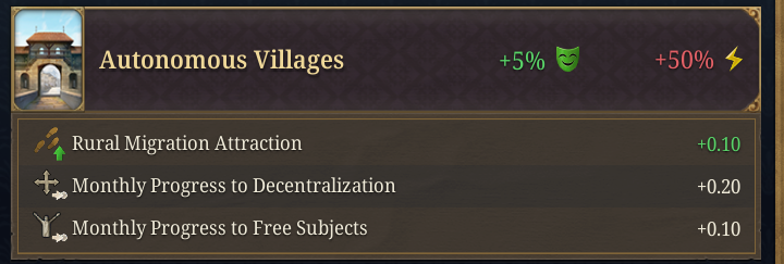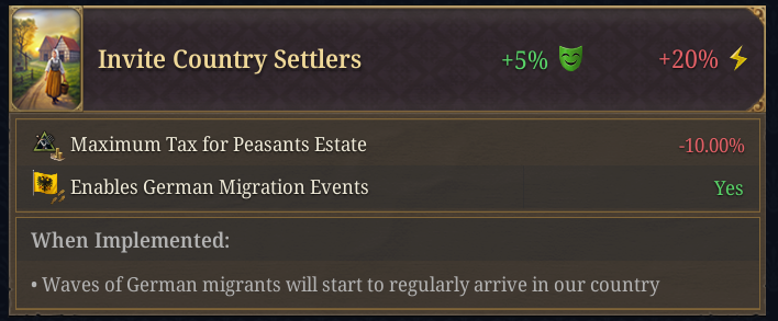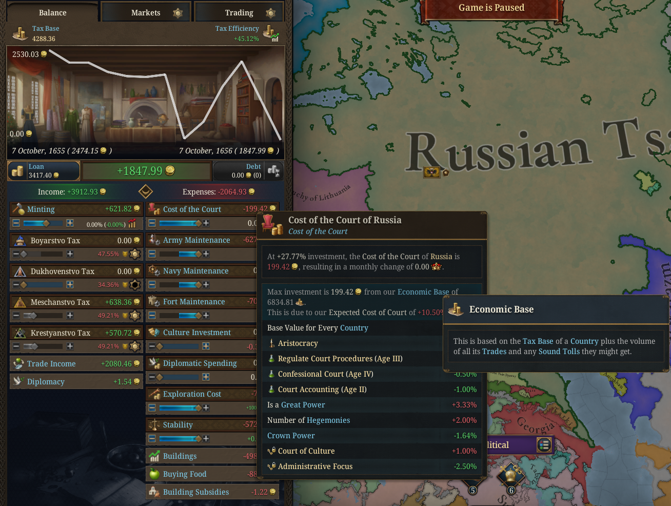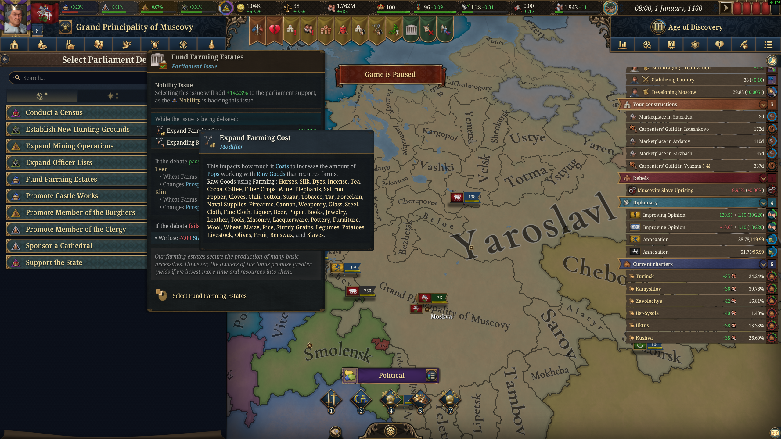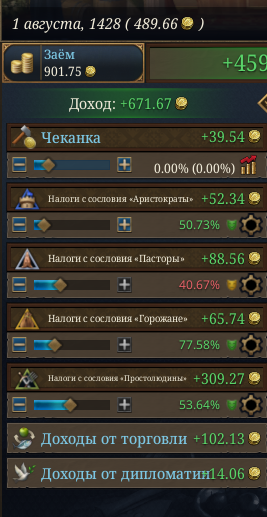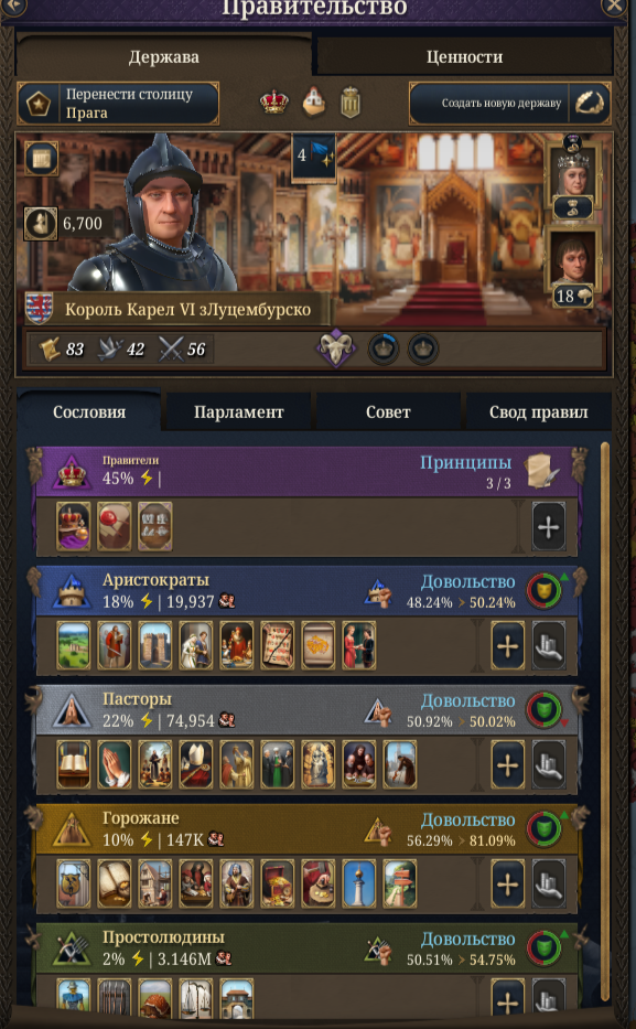 >>50450433 >>50450428 И еще важны правила, особенно правила дающие бонусы лояльности для аристократии и простолюдин. Простолюдины главный источник дохода, в сословных правилах надо дать приоритет им. Аристократы самое опасное сословие, но еще и второе по доходности после простолюдин, им тоже в идеале выдать правила типа горных прав или необразованных масс. Правила меняются во время парламентского собрания, руками за стабу правила не меняются - безумно дорого.