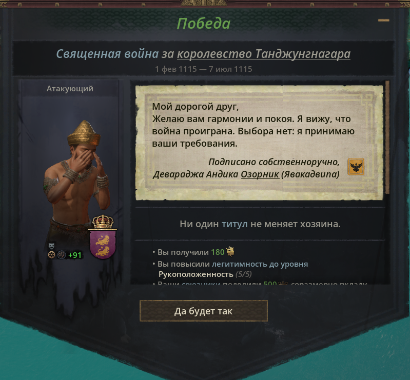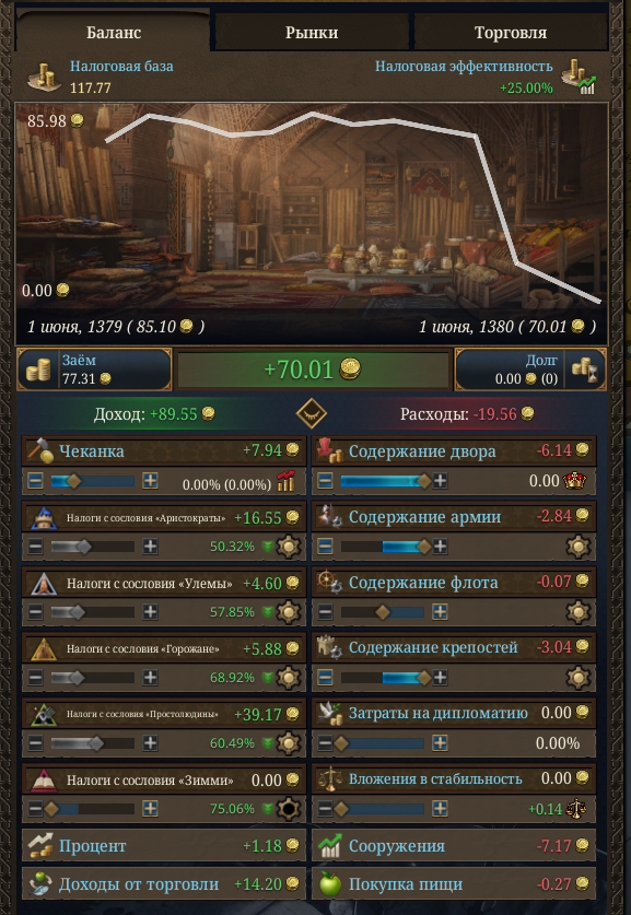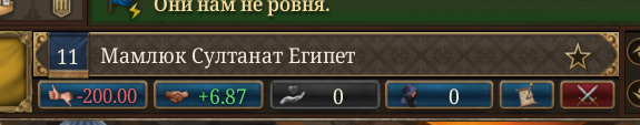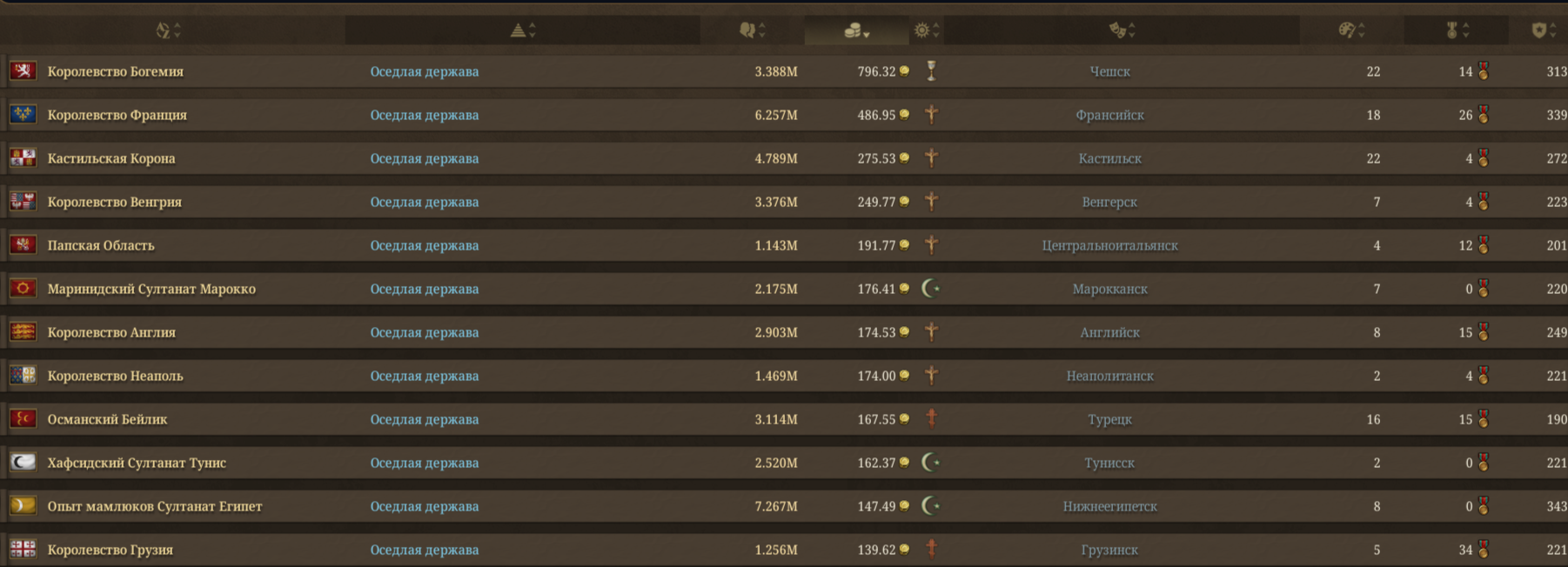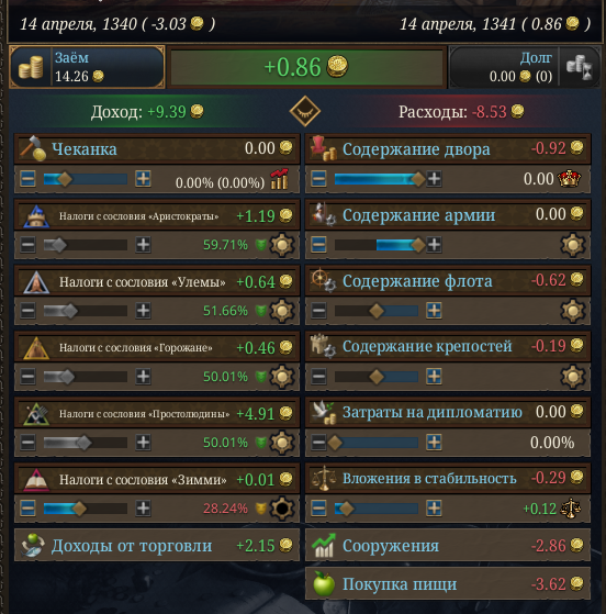>>50450437 Заметно как ты знаешь что делаешь. Я даже не полинился в игру зайти и перепроверить что ты там понажимал. >султан разрешил им охотиться в угодьях дворян В стране где нет ни 1ой провки с дичью. >горожане обиделись, что их допустили до контроля чеканки Очень мудрое решение словить сразу -10 макс налога и минус чуть чуть инфляции в стрене без единого рудника. Да и с ними это очень спорная привилегия. Ну и как ты умудрился заставить эмиров восстать я совсем в ахуе, у них тут со старта 67 нахуй довольства. Ты явно олд серии который имеет четкий план на игру, а не ослина жмущая всё подряд.