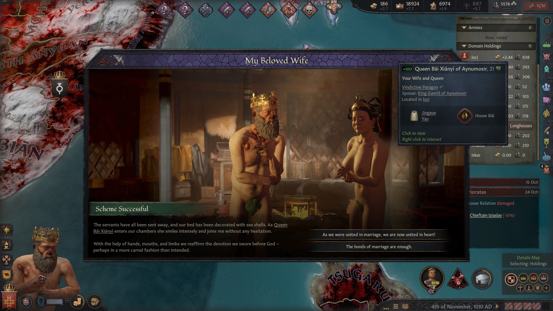 Хризантемовый трон должен быть самой интересной дрочильней из всех потому что именно там раскрывается механика блоков. Ты номинальный правитель японии - импотент без реальной силы и без земель вообще, лол, однако, если ты как следует надрочишь блок и отношения в нем на максимум до 3, предварительно выбрав правильную силу своего клана, то сможешь реальному правителю поднести хуй к носу через решения, сказав что тому пора съебывть, а ты восстанавливаешь реальную силу императора пиздоглазии. Как-то так.