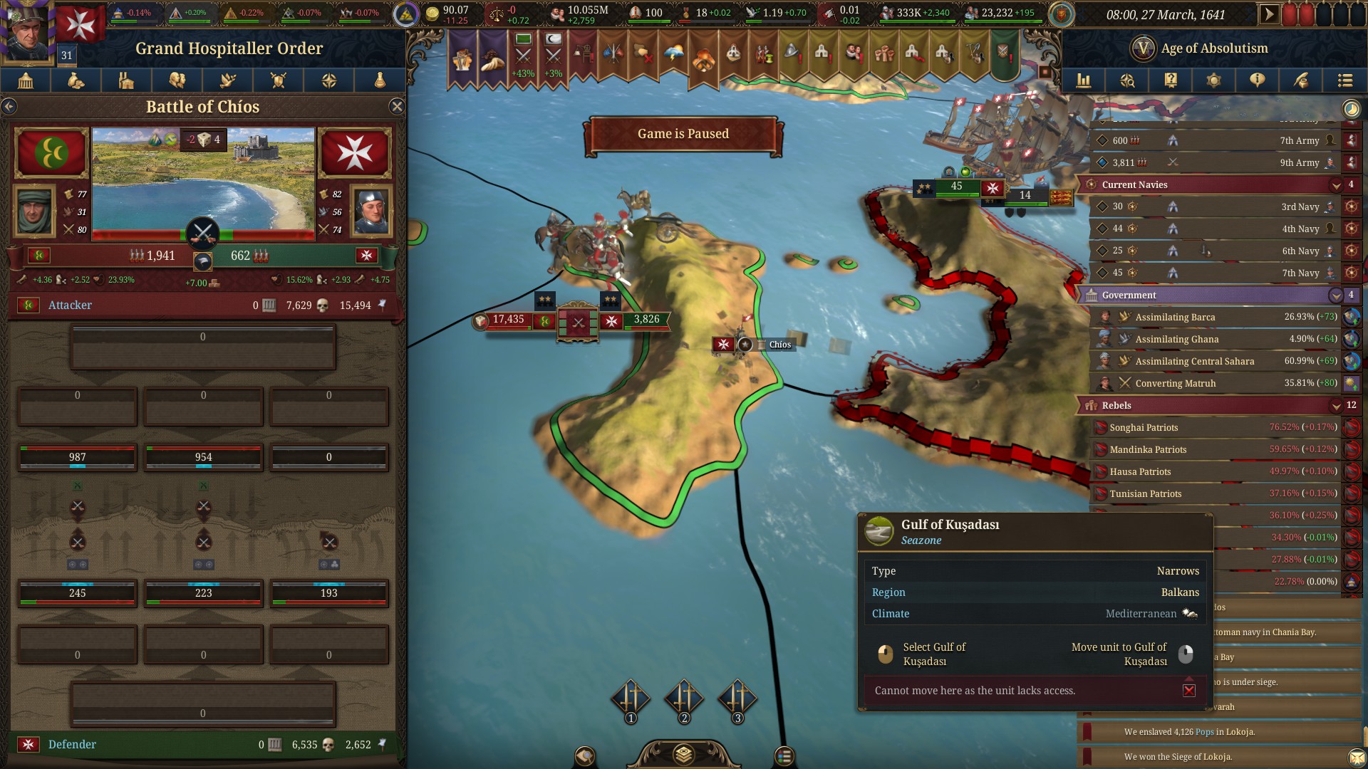 >>50450533 А теперь ещё раз посмотри скрин, там стоит армия на осаде крепости, в свою основную армию я вливал по кд всех ополченцев которых только мог собрать, за армией врага я ходил по пятам не давая ей отдыхать, но она со мной всё время сражалась будто у неё 100 морали, в истории человечества вообще бывало такое что (одна (НЕ ОБЩАЯ АРМИЯ СССР К ПРИМЕРУ, А ВООБЩЕ один легион скажем в 10000 рыл)) армия 100 раз просрала и ходит спокойно туда-сюда пусть даже по своей территории и никто никуда не разбегался, не умирал на марше, не терялся в пустыне? В прошлых частях даже на своей территории армии без морали всирались в нулину или хотя бы несли значительно бОльшие потери