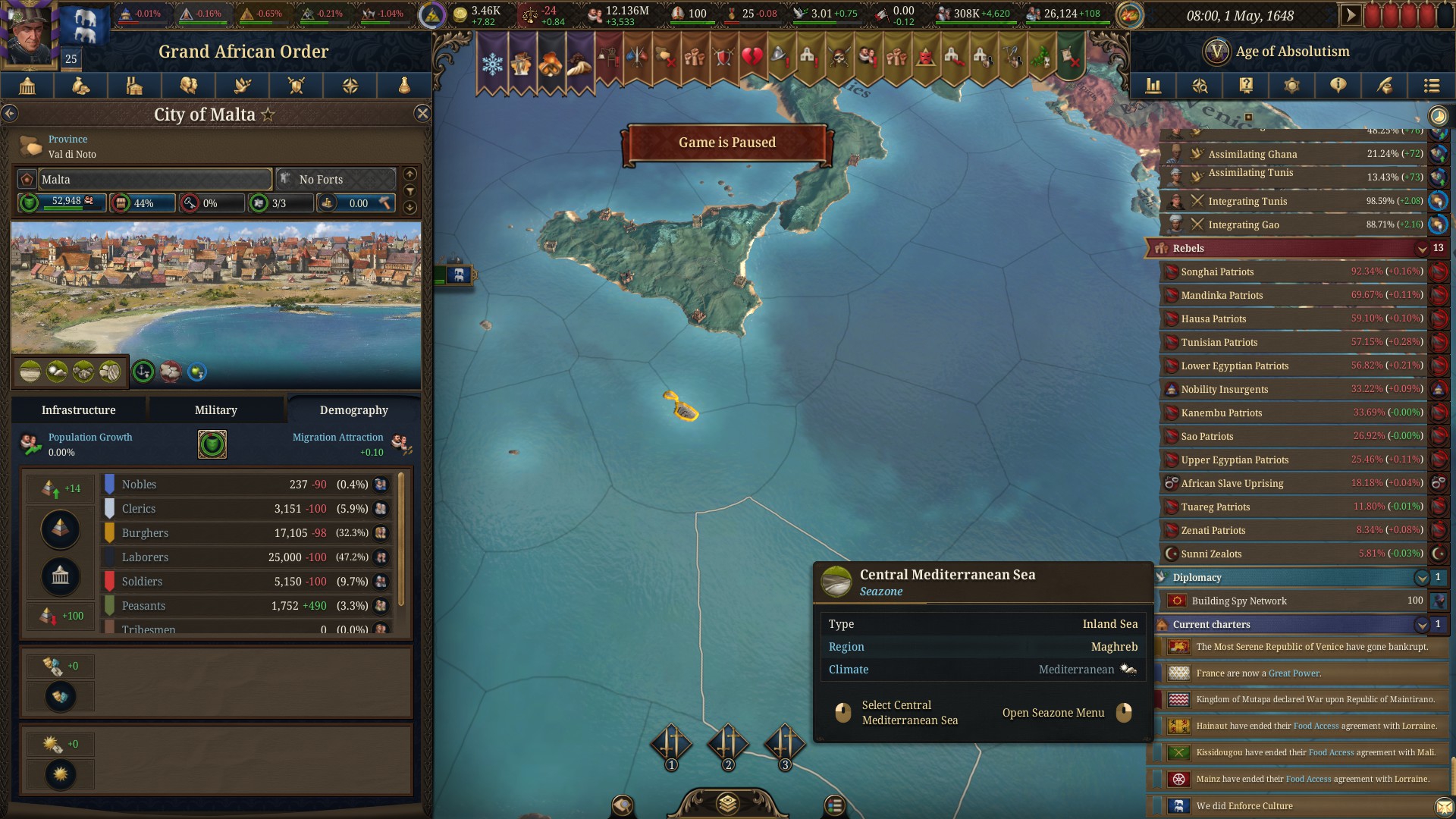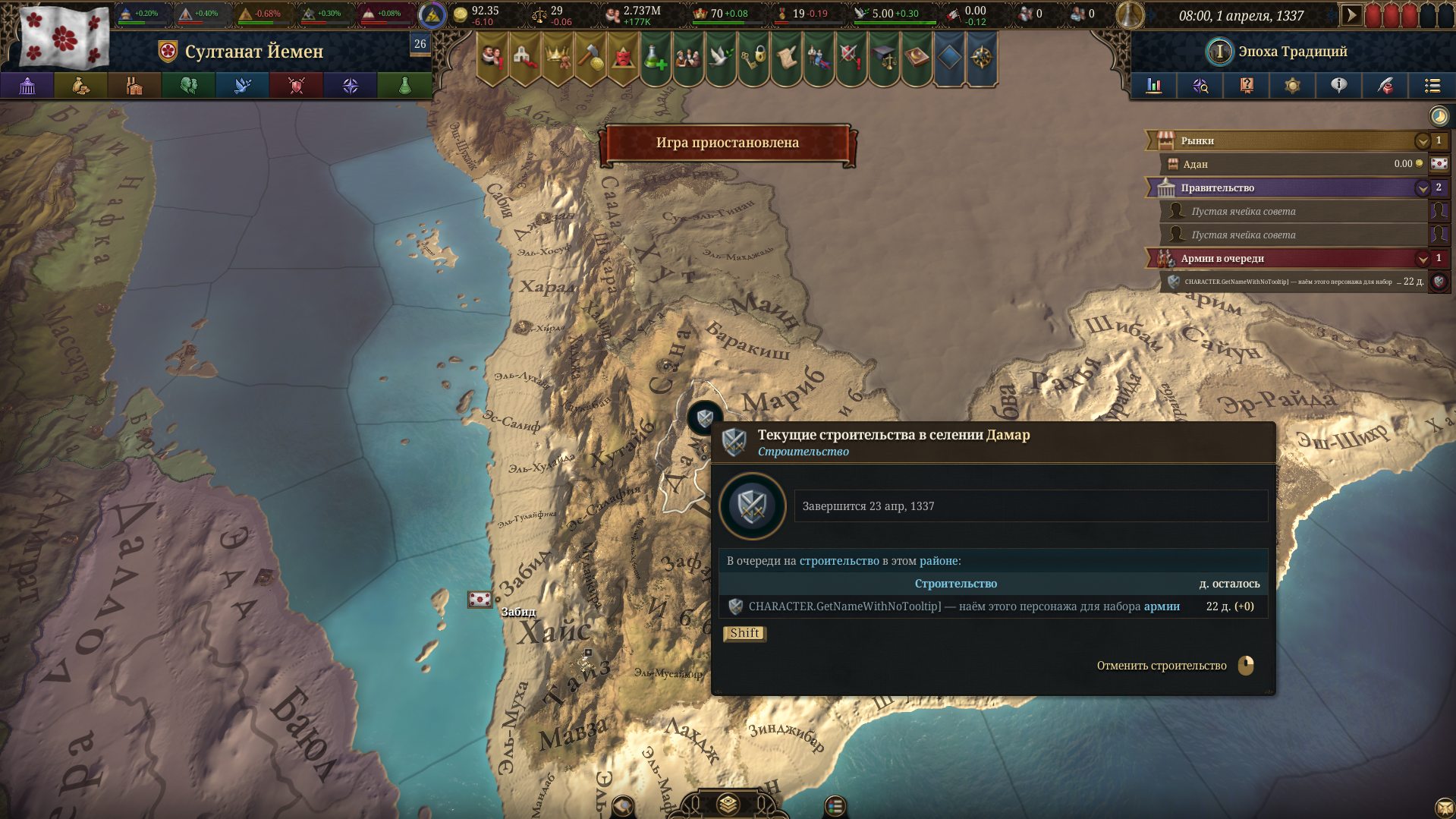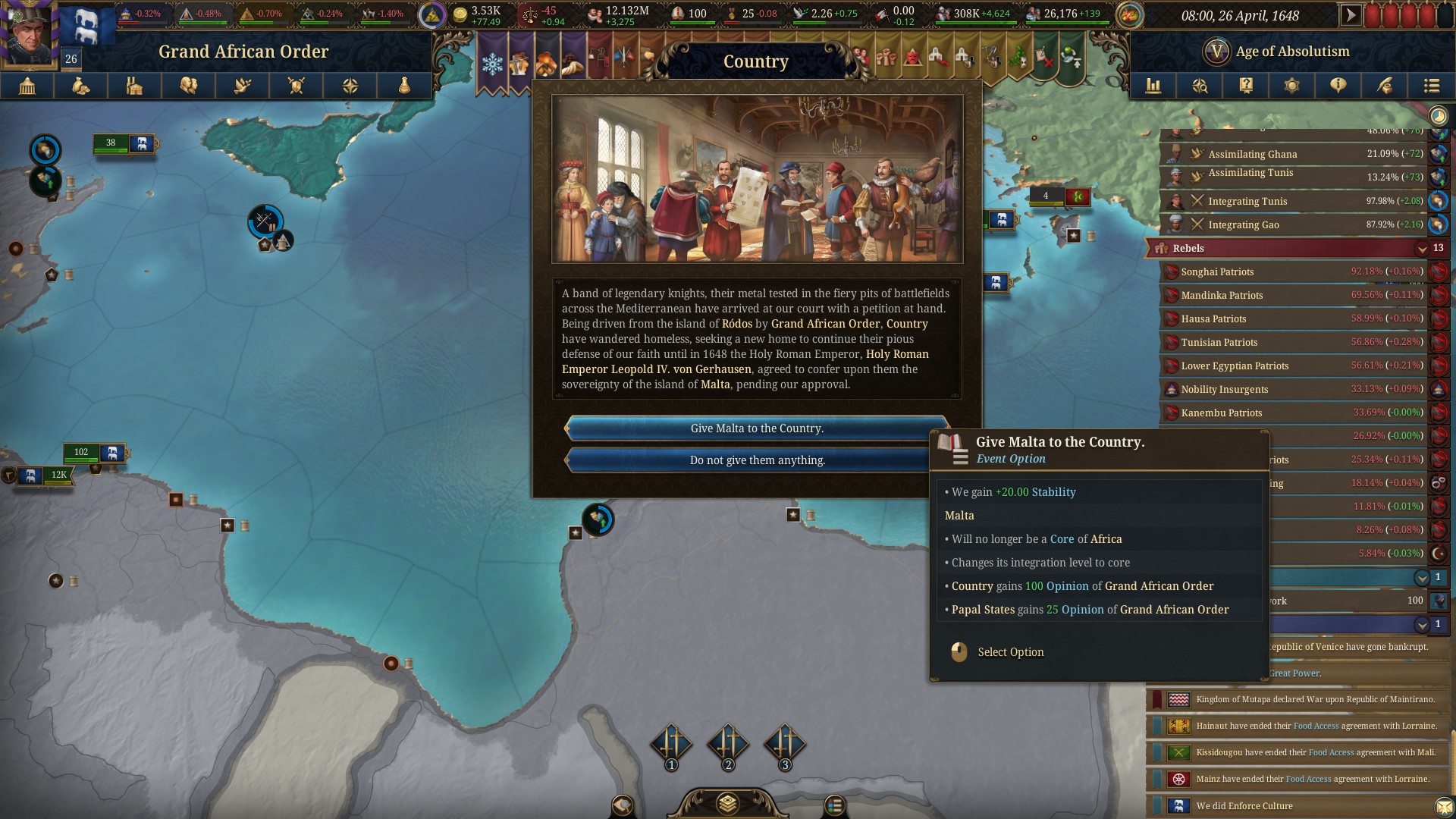 Йухан! Верни мне мои легионы! Как всегда, ни дня без Йуханобесия. Смена тега с Госпитальеров на Африку вызвала новый приступ. Пошёл ивент который спавнится при падении ордена, но Йухан забыл добавить проверку того, есть ли в игре тег который ФОРМЕР ХОСПИТАЛЬЕР. Есть вариантик передать Мальту некой КАУНТРИ. Заспавнить второй орден Госпитальеров игра не смогла, поэтому просто уничтожила провинцию. Теперь это провка без тега, без культуры с невозможностью реколонизации. Как в Стелларисе разрушенная планета. У меня по какому-то ивенту Марокко точно такая же провка организовалась в пустынных оазисах и по пизде пошёл весь автопокрас пустошей.