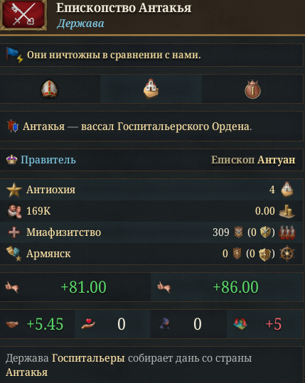 Захватил Антиохию за Госпитальеров и создал из нее ленника. Но он автоматически создается с армянской культурой и миафизитством, хотя правителем я назначил француза католика. Там никак при создании религию им с культурой не поменять? Только дипломатическими действиями?