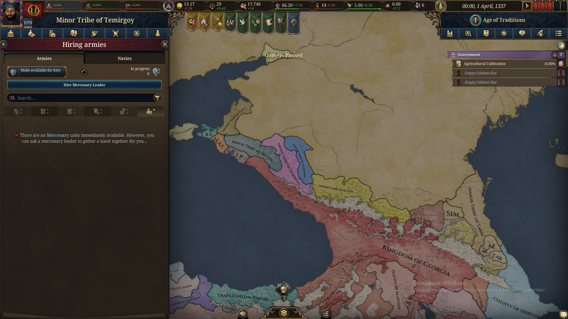 Ну ладно, тут я обосрался, тут я признаю. Я через меню набора армии заходил, там было написано доступно 0 наёмников, я не знал, что их куда-то отдельно ещё засунули, зданий для наёмников не завезли, а учитывая что я даже не мог найти себе жену, то я подумал, что я в какой-то изоляции сижу куда наёмники не захаживают
