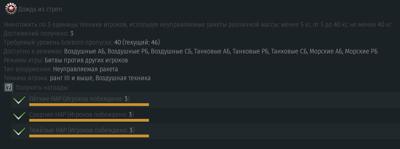 Жидь, вот скажи честно - ты охуел? Какие ещё "НАРы менее 5кг", их в игре полторы штуки, это либо R4M на Me 262 A-1a/Jabo (БР 7.0, V ранг) либо С-5К на Миг-15бис (БР 8.3, ранг V). Мало того, что и тем и другим говном хуй кого убьёшь, но тебя блять не смущает что у тебя все дейлики в батллпасе выполняются на технике от III ранга, а тут блять надо где-то высрать V ранг, да ещё и за строго определенные нации. Нихуя не жмет тебе? Чем раньше тебе не устраивало испытание на НАРы, где надо было убить 5 челиков НАРами до 40кг и 5 челиков НАРами тяжелее 40кг?