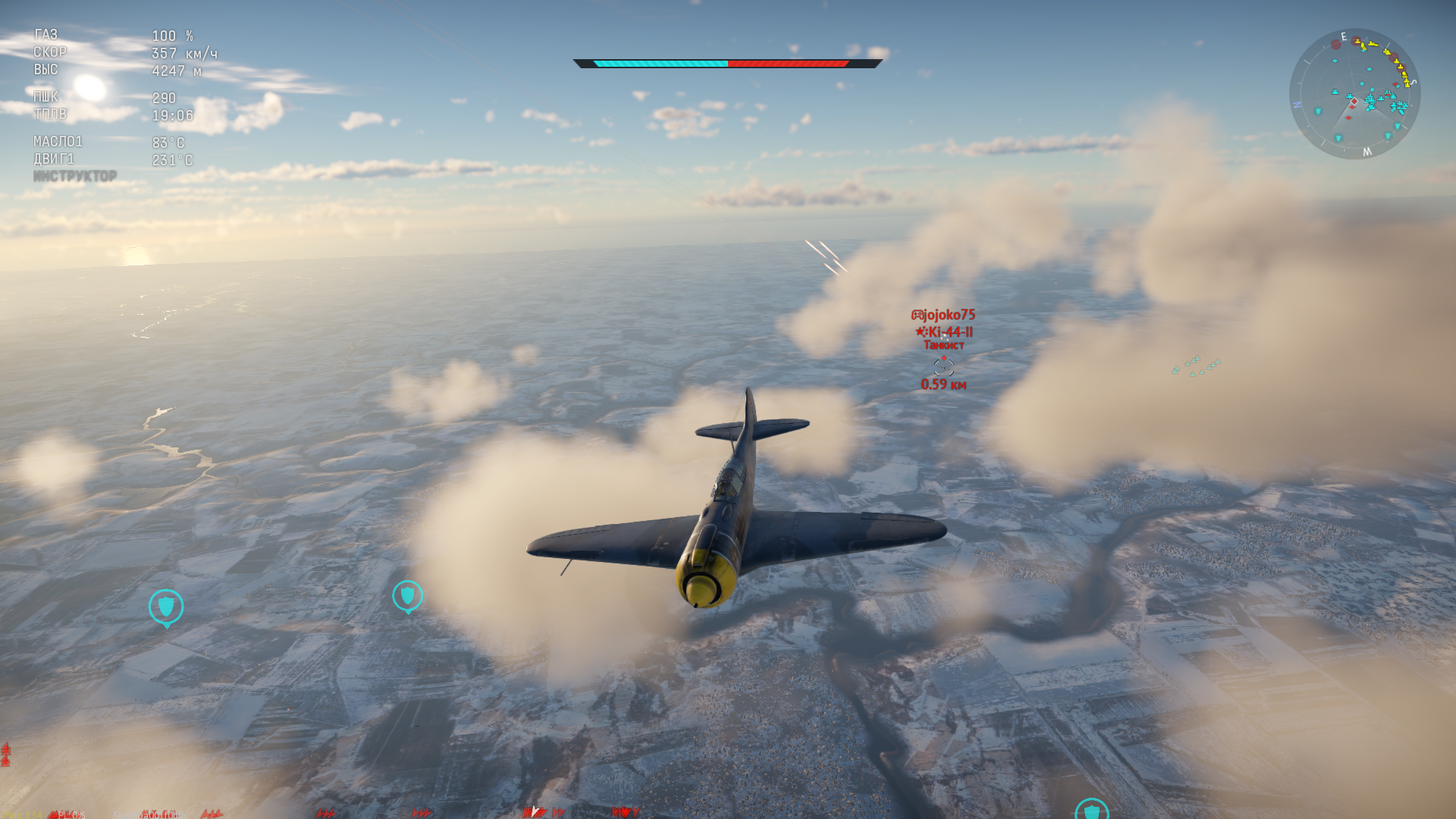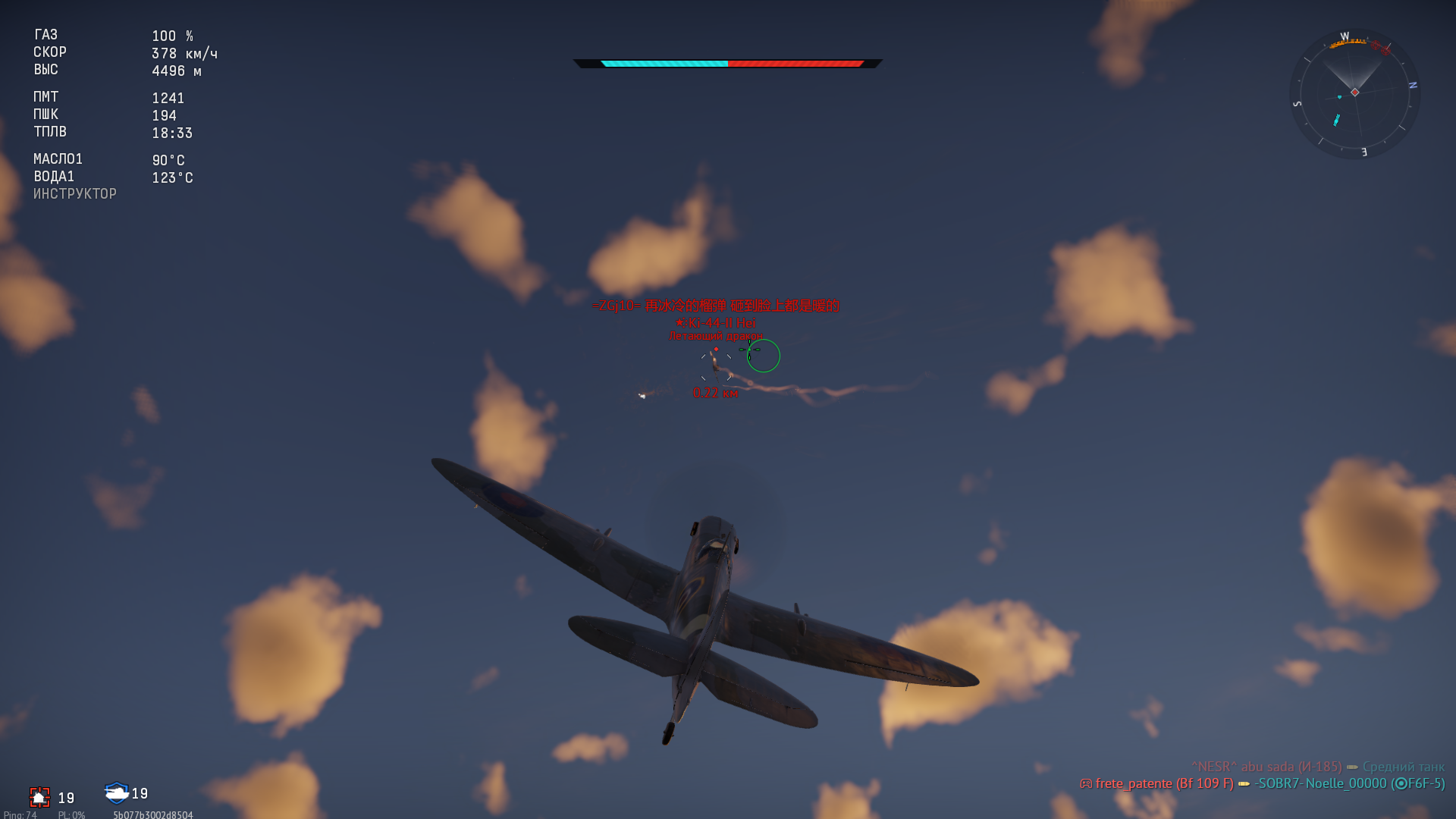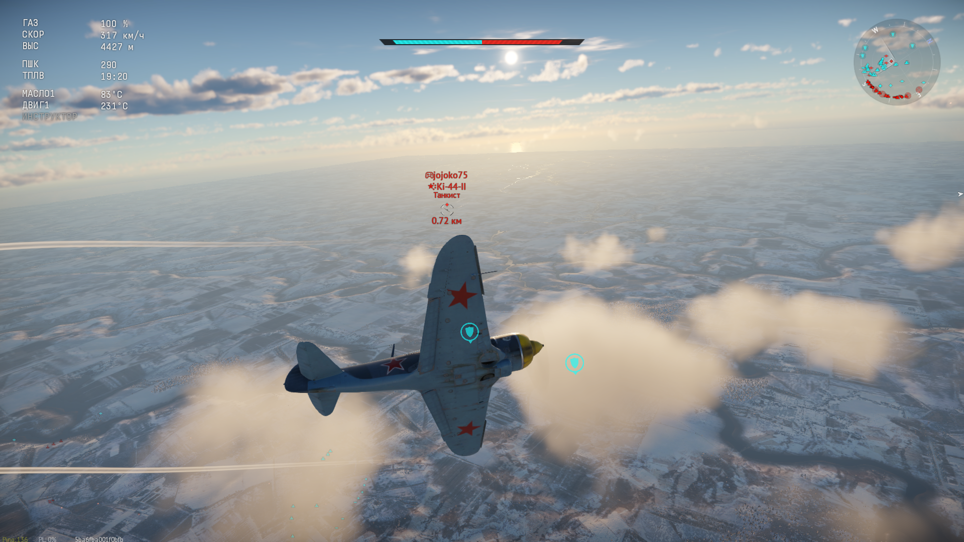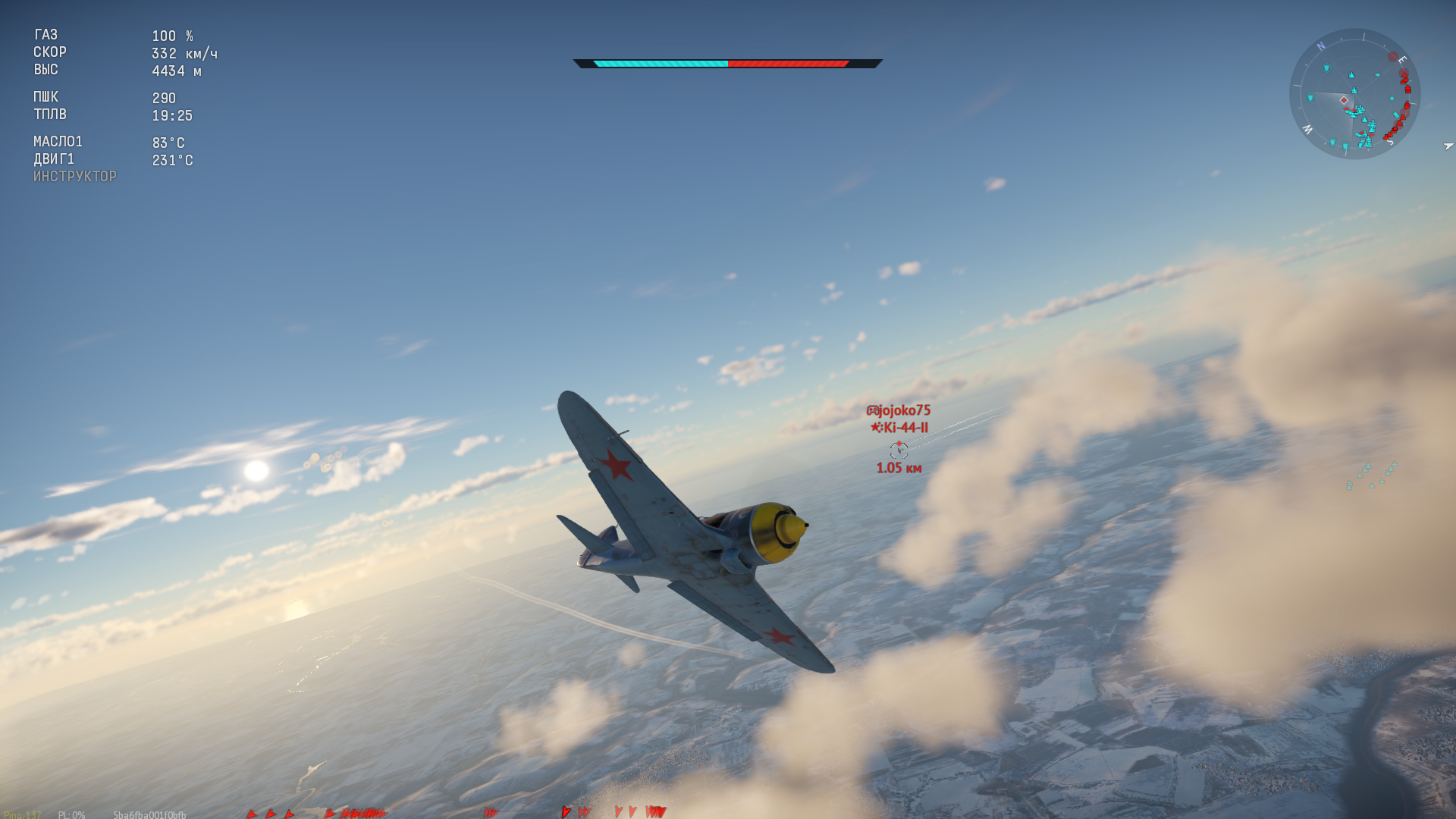 >>50441243 >>50449680 >>50451852 Вот в кои-то веки встретил относительно толкового Ки-44. Ну что я могу сказать, лавка против него действительно в заметном проигрыше, особенно на 4+км. Если бы семёра не помогла, в соло он бы меня ушатал скорее всего, даже не имажинирую, что можно было сделать в подобной ситуации, чтобы гарантированно получить преимущество, разве что надеяться на его ошибки и косую стрельбу. Со стрельбой у него было действительно хуёво, он довольно долго не мог в меня попасть и в итоге откис от Ла-7; стрелял бы он получше - мог бы сбить сначала меня, а потом и семёрочку тоже. Этот бой я по итогу закончил живым, но с нулём фрагов, лол.