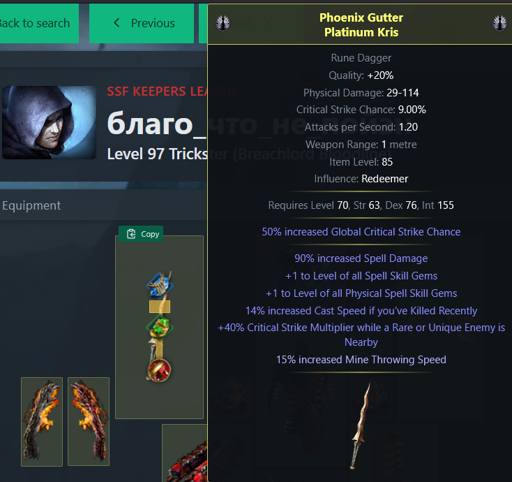 >>50455768 скорее всего спелл дамаг просто лаки прокнул в пушку не выше 82 илвл кидаешь корродед металлик и шаддеринг пока не получишь +1 и какой-то спеллдамаг нужно 2 суффикса и 2 префикса если суффиксов мало то крафтишь чтото в префикс чтоб не насрало и кидаешь экзи потом крафтишь кеннот атак и адд-ремув физ молишься чтоб не ебнуло +1 и спеллдамаг чистишь суффиксы через вейлед ищешь в них полезное критмульти там или даблдамаг можно вейлед хаос но может насрать лишним если не хочешь то вейлед экз потом кидаешь веританию если хочешь эффект хатреда или смотри сам что тебе нужно там шанс маленький вон пчелу со скрина насрало
