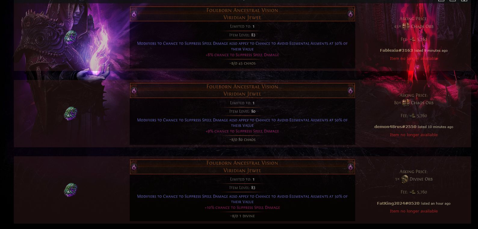 Пытаюсь себе подешевле купить анцестрал вижен фолборновый и там новички частенько цену не зная ебашут его за 50 хаосов - диван. Так боты подчищают настолько быстро что как только лайв сёрч апдейтит появления предмета - его там уже нет. И тут же релистят диванов за 16-20. Теперь ты на рынке не только с ботоводами конкурирушь на картах, но и в трейде. Поепанк который мы заслужили.