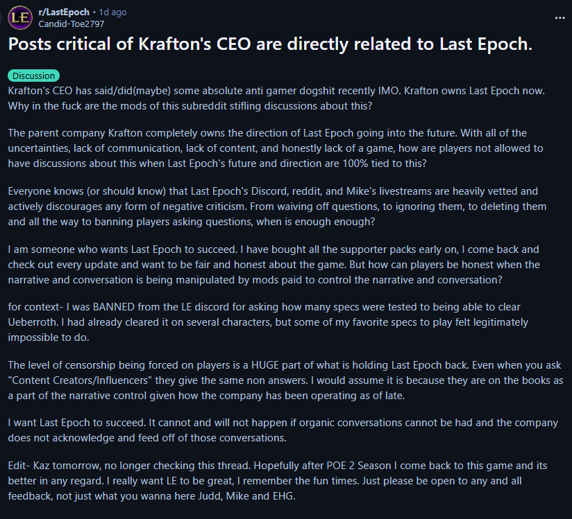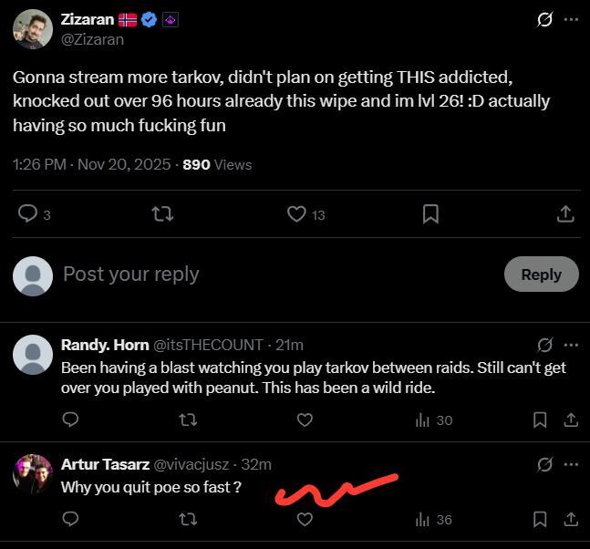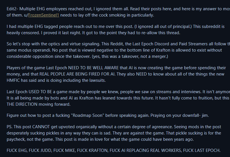 А ну и ещё забыл про то, что эти хуесосы в этой лиге что-то сделали с шейдерами и загрузкой в новый инстанс, что я (и судя по форуму + реддиту не только я) регулярно сижу и смотрю на загрузочный экран по 3 минуты, если тпаться в купленное ХО + 10 минут грузятся анимации у 3х новых боссов. Посты про эту хуйню висят чуть ли не с первого дня, и до сих пор разрабы не удосужились что-то ответить