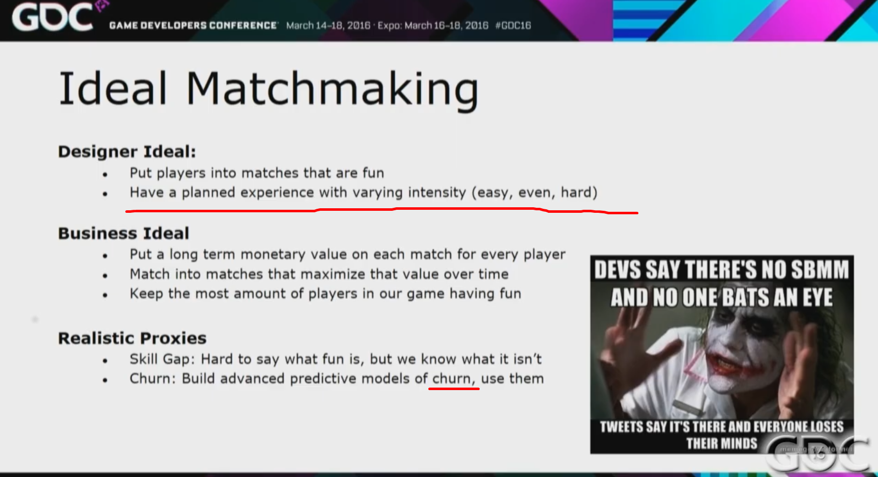Для чего это делается? Цель - создать эмоциональный роллеркостер, как в казино, где лудики дергают за ручку слотового автомата, только тут мы нажимаем "Find Match". А также увеличить в разы количество игр, требуемое для достижения своего ранга, чтобы дольше удерживать игроков в игре. Джош Менке в презентации делает особый упор на предотвращение оттока (churn) игроков.