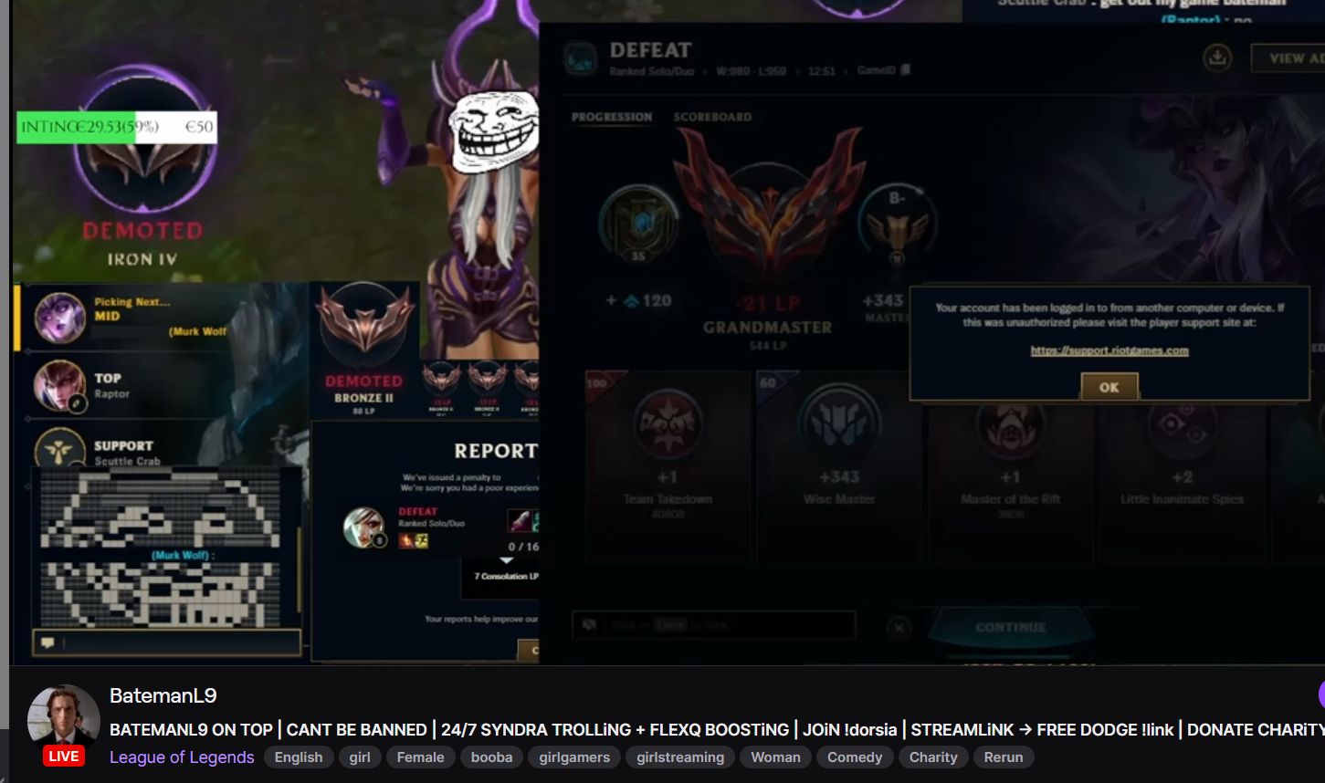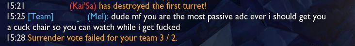 А то, что животные с бота прересрались в первые 3 минуты, в то время, как у врагов слажнное дуо с войсчатом - это тоже случайность. В итоге животина на кейтлин фиданула 1-6 до 15-й минуты и просто прожала кнопку выхода. После этого на 20-й и 25-й минутах тварина реконнектилась, очевидно, чекая, не закончили ли мы матч и, видя, что нет - ливала обратно.