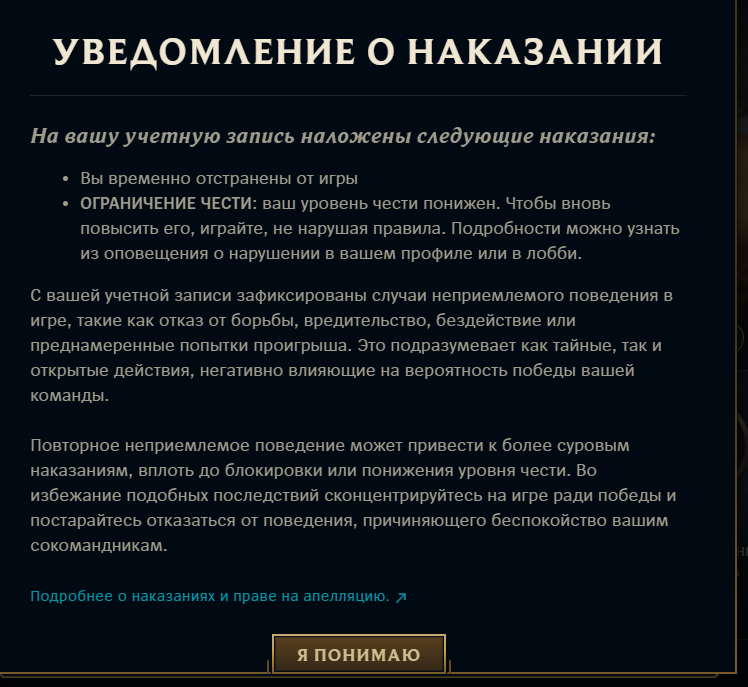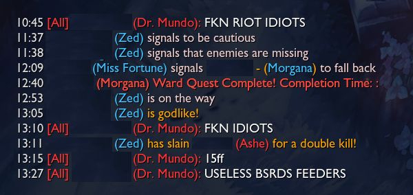 Не, это, конечно, приятно для разнообразия, когда в 1 из 20 игра в тильт загоняют тиммейты врага и он всю игру спамит капсом в олл чат. Но я за гораздо более мягкие высказывания получил неделю мута + сброс хонора с 4-го уровня на 2-й. А насчет этого мундо не было никаких уведомлений о наказании.