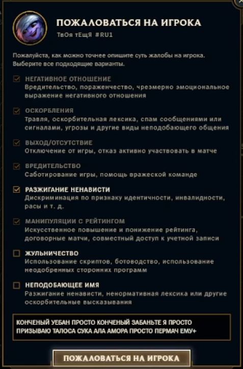 я в ахуе. почему сриоты ничего с этим не делают? я никого не оскорблял, я обсуждаю игру и то как игроки играют в неё. почему я не могу пользоваться чатом из-за того что какая-то обиженка закинула репорт на меня потому что я назвал его криворуким инвалидом? и почему сриот это поощряют мне что блядь чат отключить у себя чтоб не получать репортов? но это же важная вещь в игре, пингов иногда недостаточно