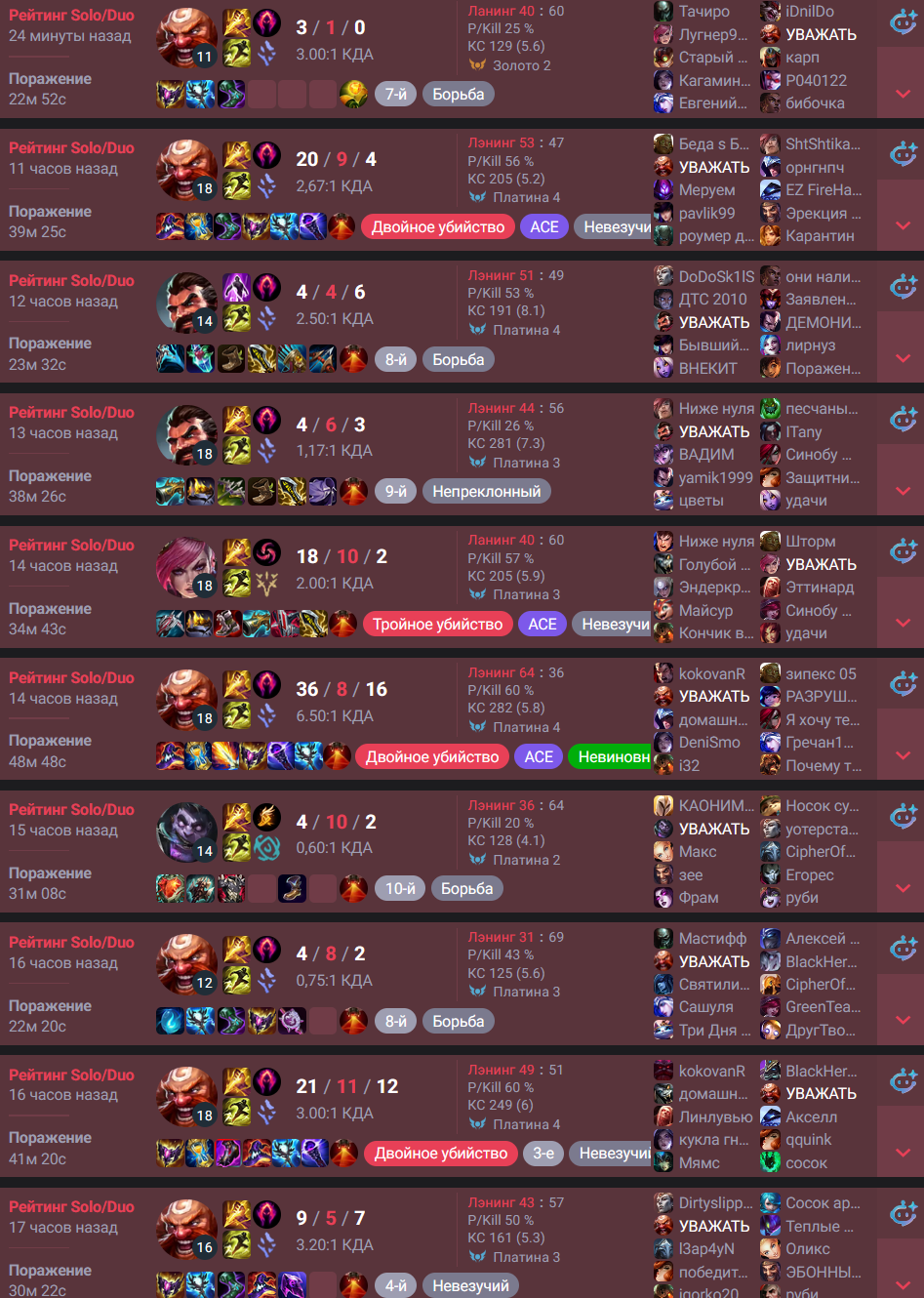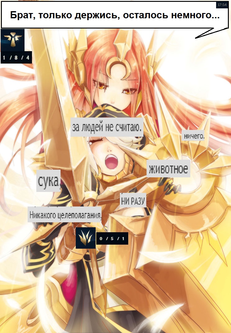 Мдеее. До абсурда доходит в плане лутания уебищ в команду. Вражеский топер может фидить 3-10, но иметь выше левел, чем моё чмо. Вражеский адкал может идти 2-10, но умудриться настакать нужное количество стаков. Враги могут сосать до 27-й минуты, но потом со счета 48-25 резко откамбекаться, выиграть файт у барона, а потом и у элдера. Причём 4 пидараса не в состоянии чем-то одним заняться, либо элдера зафокусить, либо вражескую команду отогнать. Литералли у сабхуманов абонемент на мозг закончился с 27-й минуты. Ихи и ганкаешь, им и линии бейбиситтишь, им и обьекты все даешь. Не, все равно мало, достаточно не дать еще сверху 2 обьекта, отогнав от каждого по 5 рыл, они сольются.