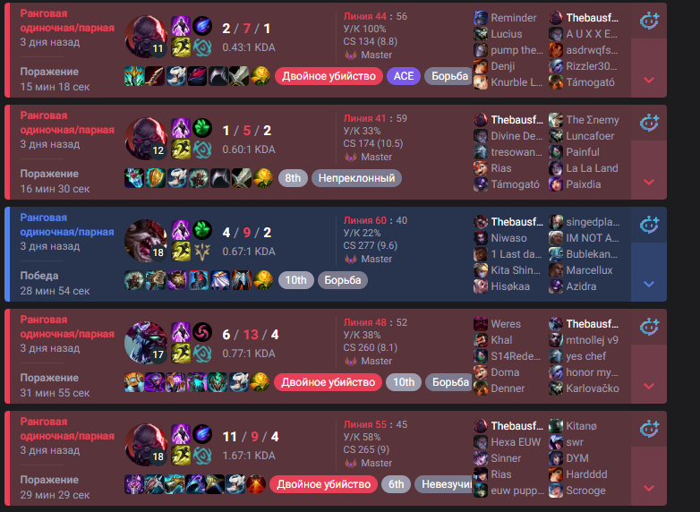 Докладываюсь вам что я таки сыграл первую ранкед игру на самире. Все сложилось крайне удачно. И тимадауны 0 7 в этот раз были в другой команде и в целом вражеский тимкомп был не самый худший для самиры. Очень сложно было против мастера т.к. мне в него нужно фулл комбуху аккуратно прожать а ему по всем кнопкам жахнуть наведя на меня прицел. У него в мидгейме был бешеный урон и он мог кушкой доджнуть вешку ешку = остаюсь без стаков = умираю. Только с вардилкой убивал. Новый самирамейнер
