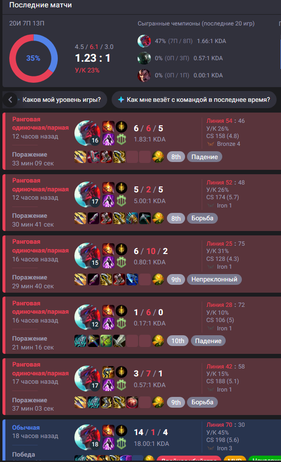 Такой пиздец, у меня буквально в каждой игре срито пулят две-три линии обосраные, а оставшаяся просто ровная, и снимают по 30 лп просто за что нахуй? я понял с эмеральда вылетел там за -0 лп типа теперь докручивают минус лп дополнительно, но я уже в п3 блять, а они не останавливаются и продолжают по 30 лп снимать, ахуеть. Вот эта поебота абсолютно совершенно искуственная тянется нахуй уже игр 10-15, просто сритоблядь решила ну все пиздуй с эмеральда будешь сидеть хз где ну щас в голдянку упаду потом также в эмеральд мне накрутят в ряд фривинов за 15мин и че блять когда нормальная игра начнется, почему я на этих качельках уже блять раз 10 катаюсь? Туда-сюда с эмеральда в платину и обратно.
