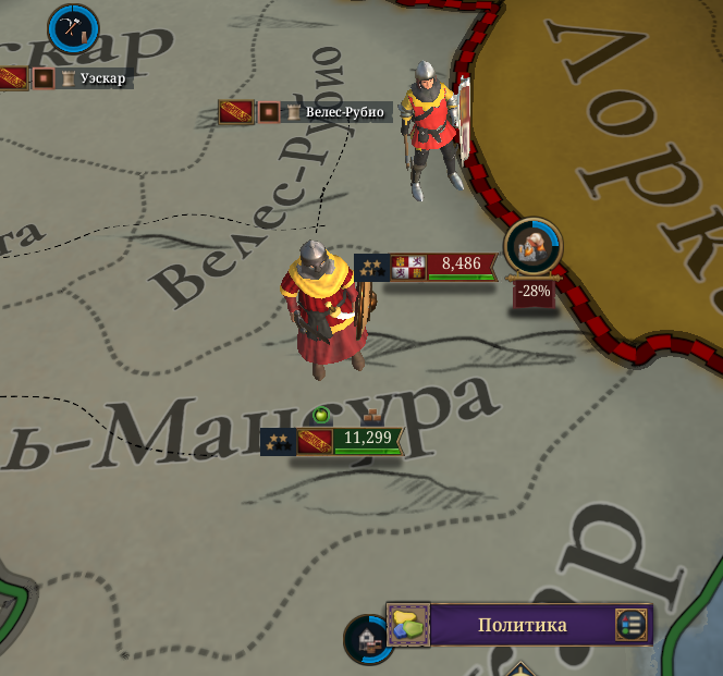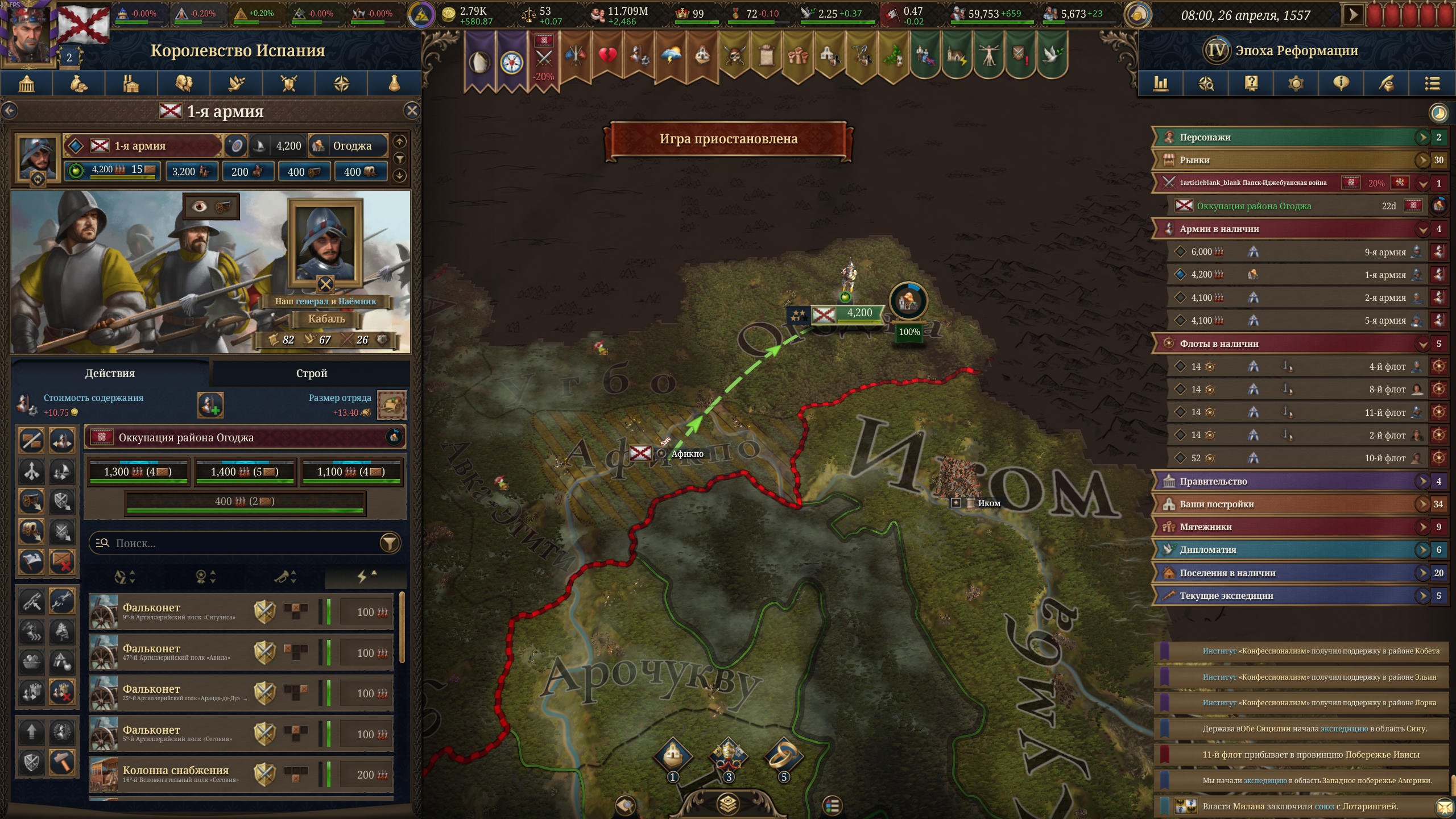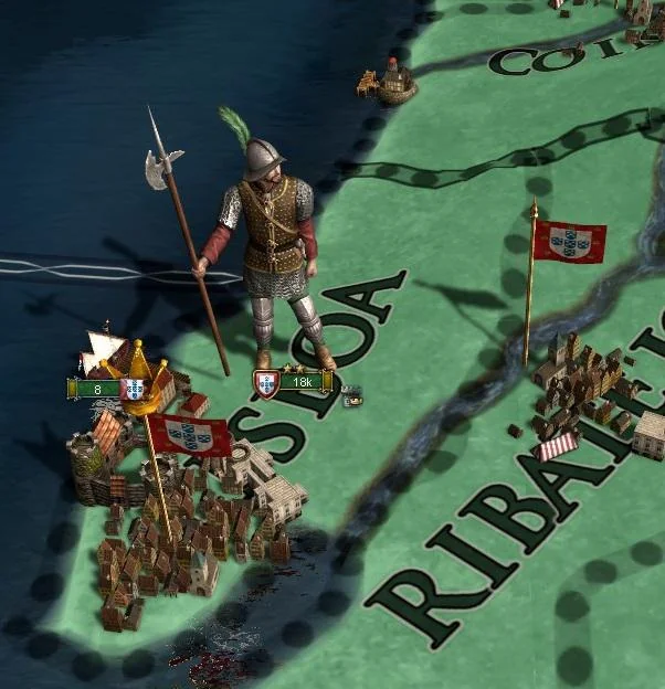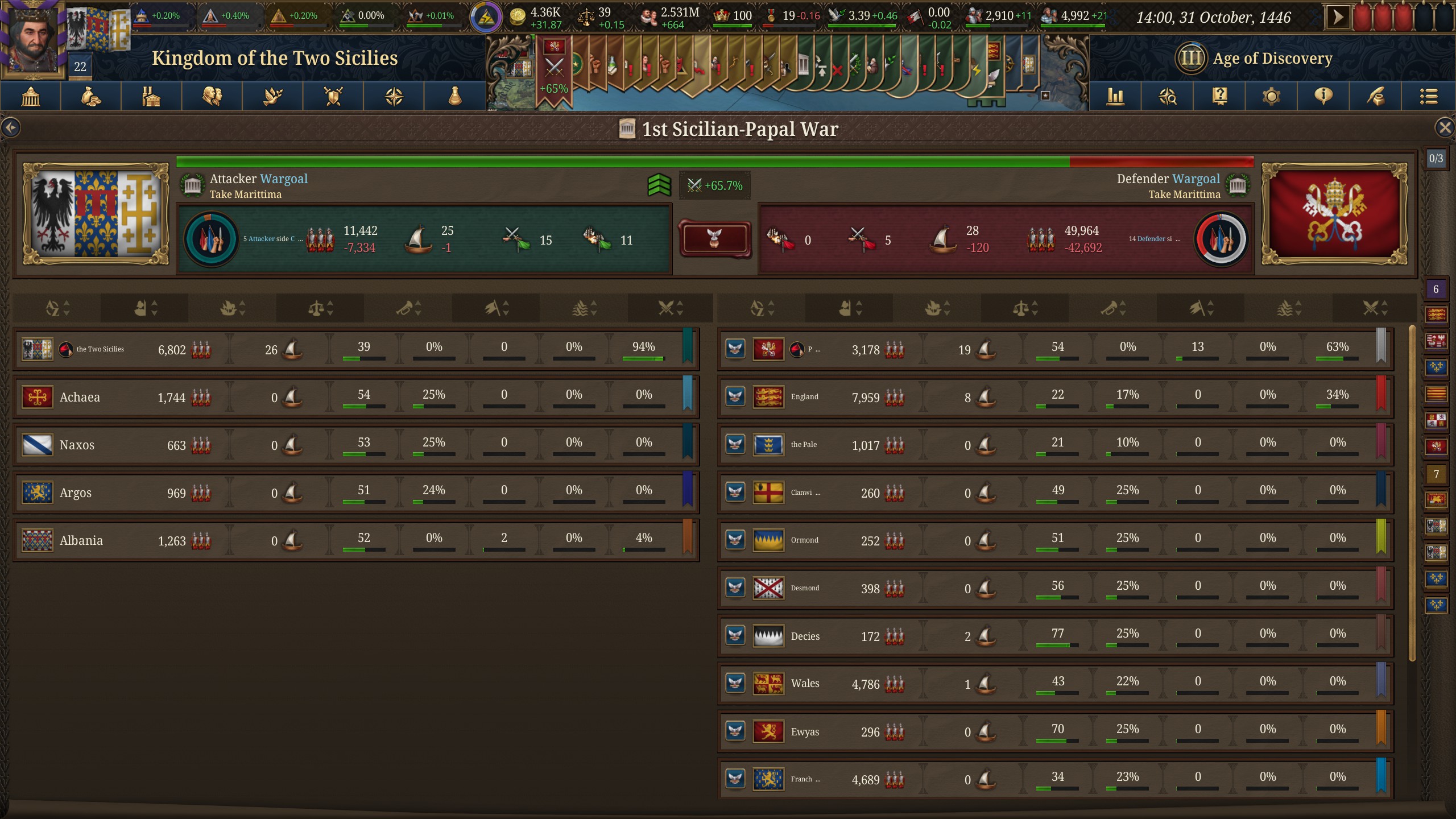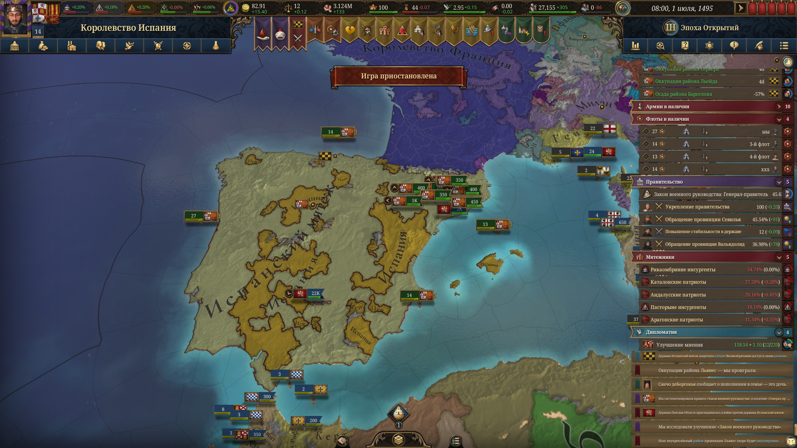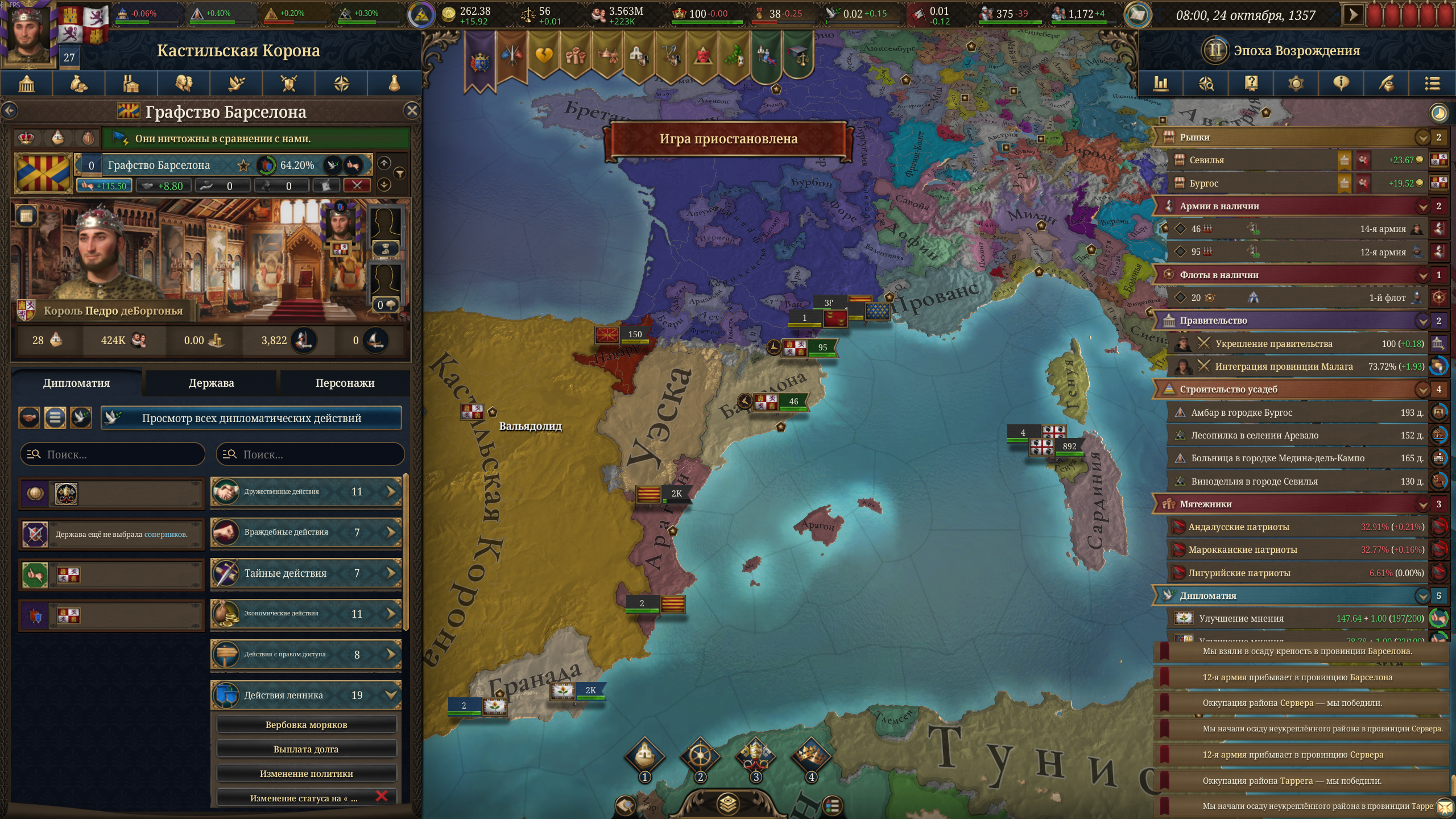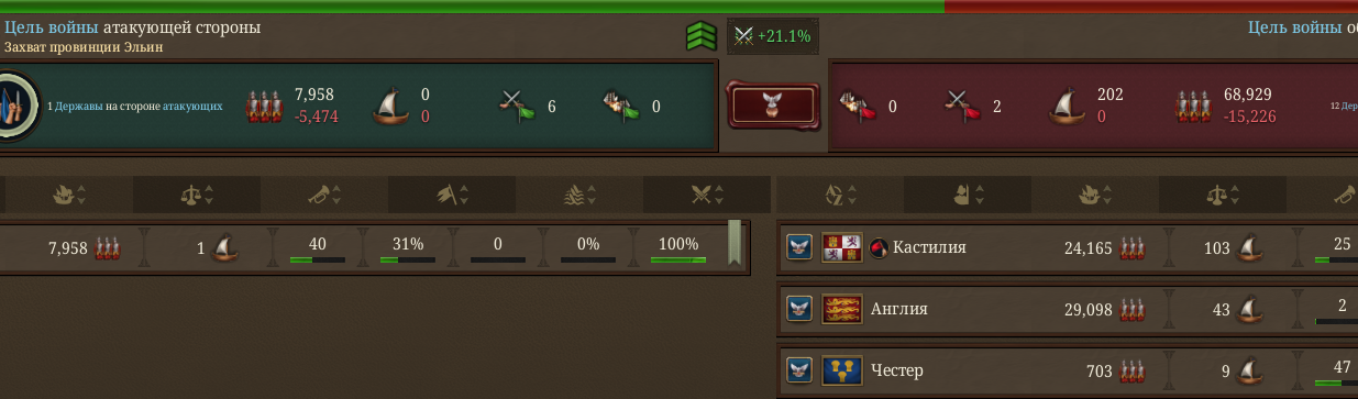 Потестил варианты войны на наемниках с Кастилией и они все сосут. В лучше случае набиралось 50% варскора, но кастилец не сдавался потому что у него базово 50к+ армия ополчения, а у меня доступно в лучшем случае 16к наемников. Пробовал два варианта наемников, через каталонских арбалетчиков по 150 человек в отряде и через тяжеконей по 50. Тяжекони люто сосут, в первом же бою отксило половина армии, а восстановления численности наемников как в еу4 нет - наемники конечный ресурс, у них нет рекрутов. Билд через арбалетчиков и прочую пехоту лучше, удавалось побеждать первые 3-4 боя с потерями х2 у кастильца, но мои потери невосстановимы, а его потери легко замещаются дополнительным ополчением.