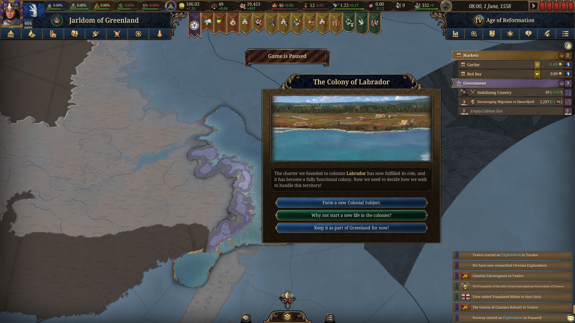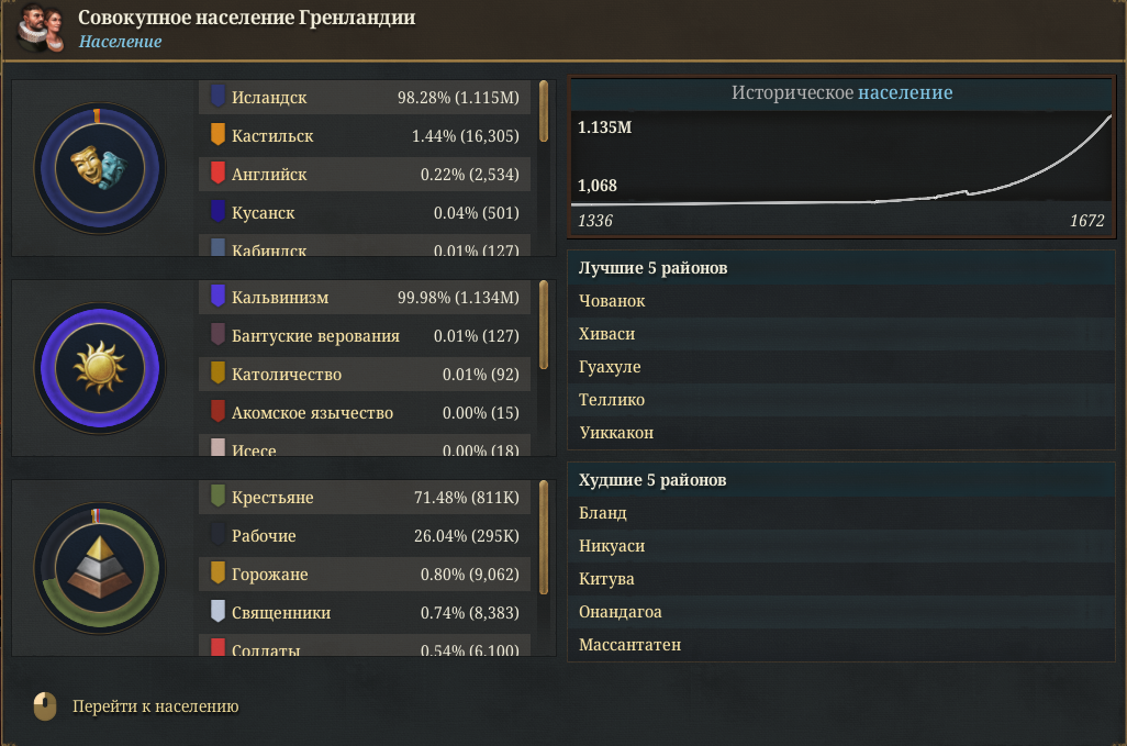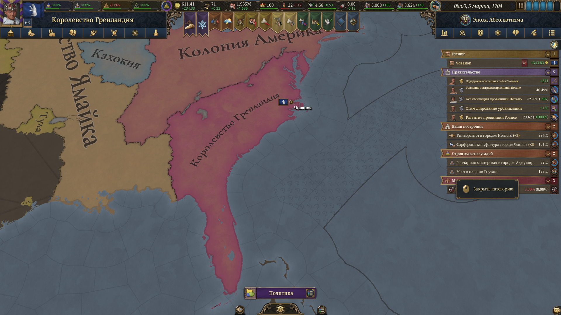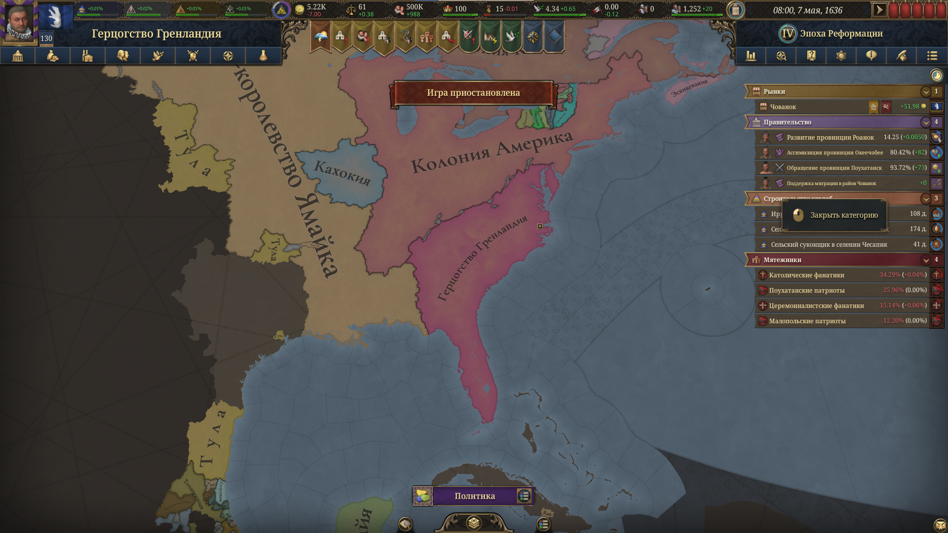 Захотел вручную рынок покрутить и сел на Гренландию почиллить чисто. Но без Йуханобесия не может пройти ни дня, поэтому как оказалось, рынок именно сегодня полностью сломали. А ещё то ли Йухан поломал колонизацию, то ли там тултип просто неправильно прописан, то ли всё поломалось именно из-за того что населения у меня было мало, но колониазация перестала работать. Я набрал 5000 человек для самой возможности колонизировать, поставил доколонить южную оконечность Гренландии и всё. 0% прогресса. Писало, что нет ни одного попа больше 1000 человек которых можно сконвертить в колонистов, хотя это не так. Где-то через 70 лет прокнул ивент на переезд жён, и колония сама собой за пару лет набралась по ивенту. После этого я получил корки и половина населения из столицы сбежала в уже полностью закоренную колонию подчиняясь сложно понять каким импульсам. Не помогали даже проставленные советники на промоут иммиграции в столицу, люди всё равно оттуда бежали. В какой-то момент в южной провке стало больше людей чем в столичном регионе. После этого я прожал колонию на северную провку и... колонизация опять поломалась и даёт 0 прогресса.