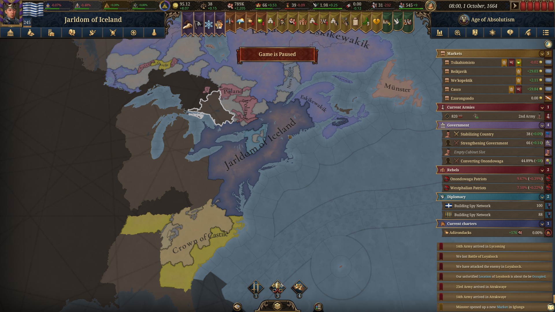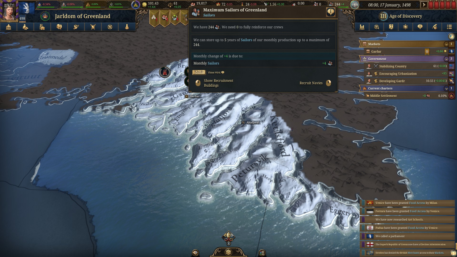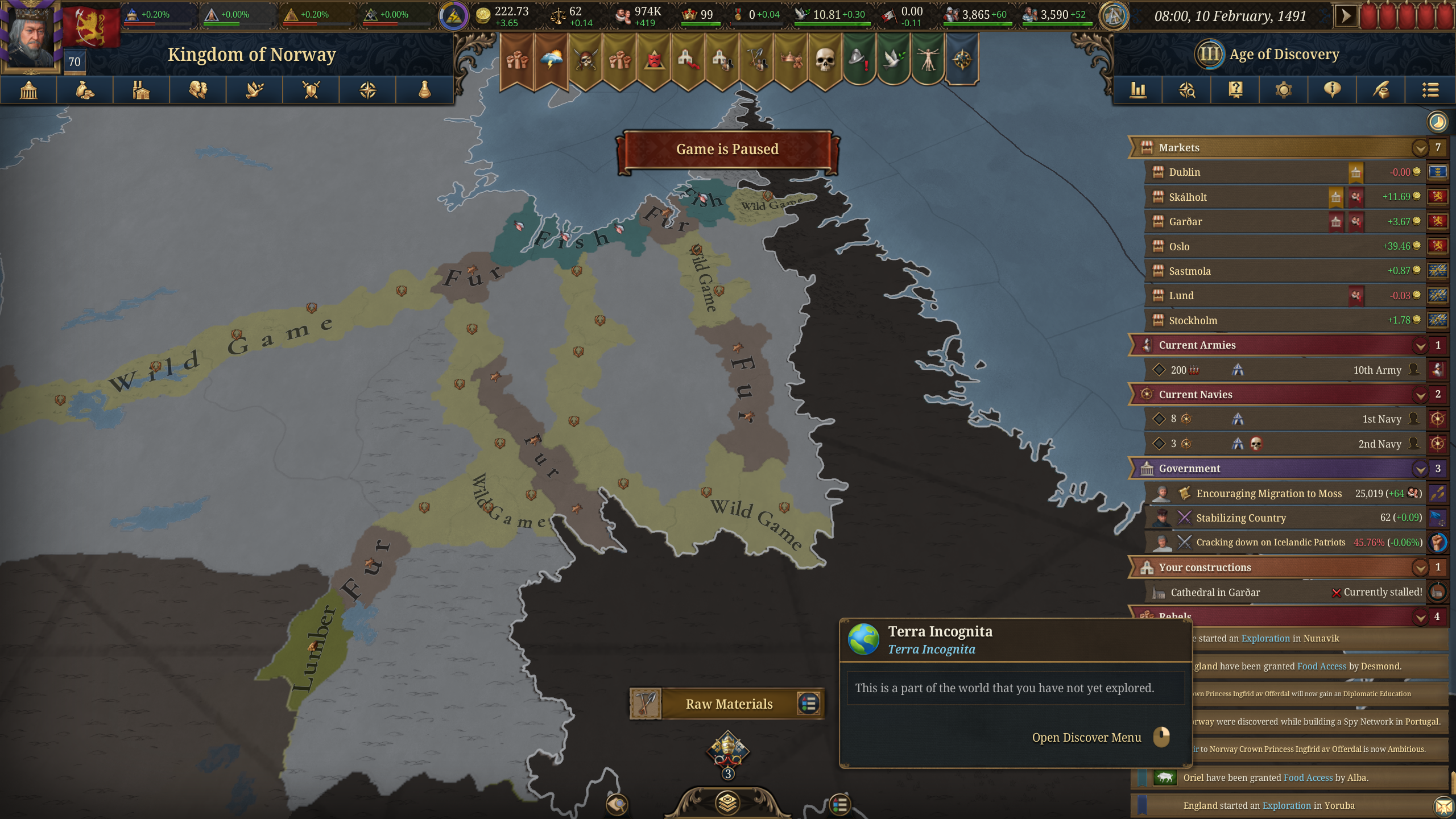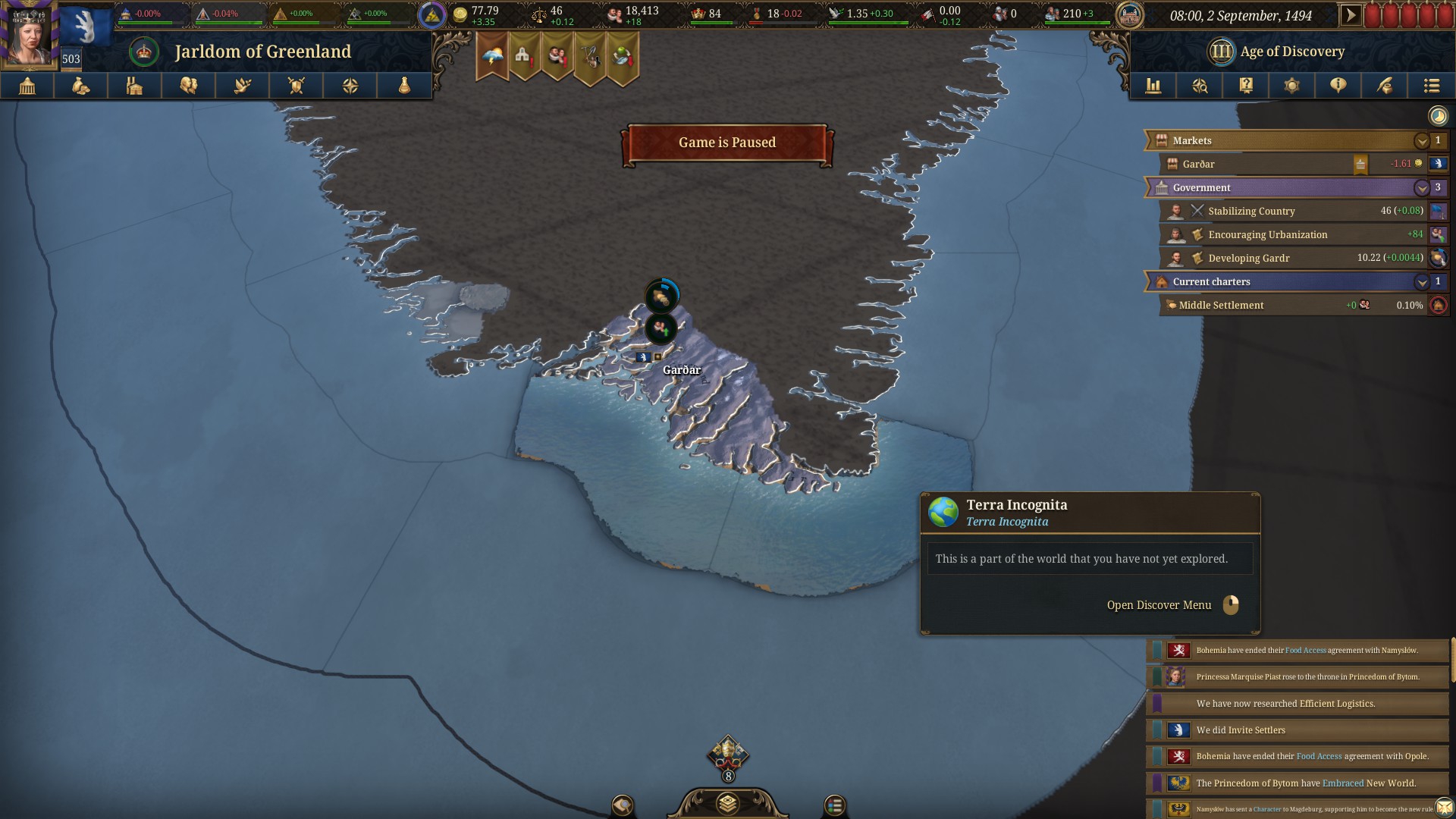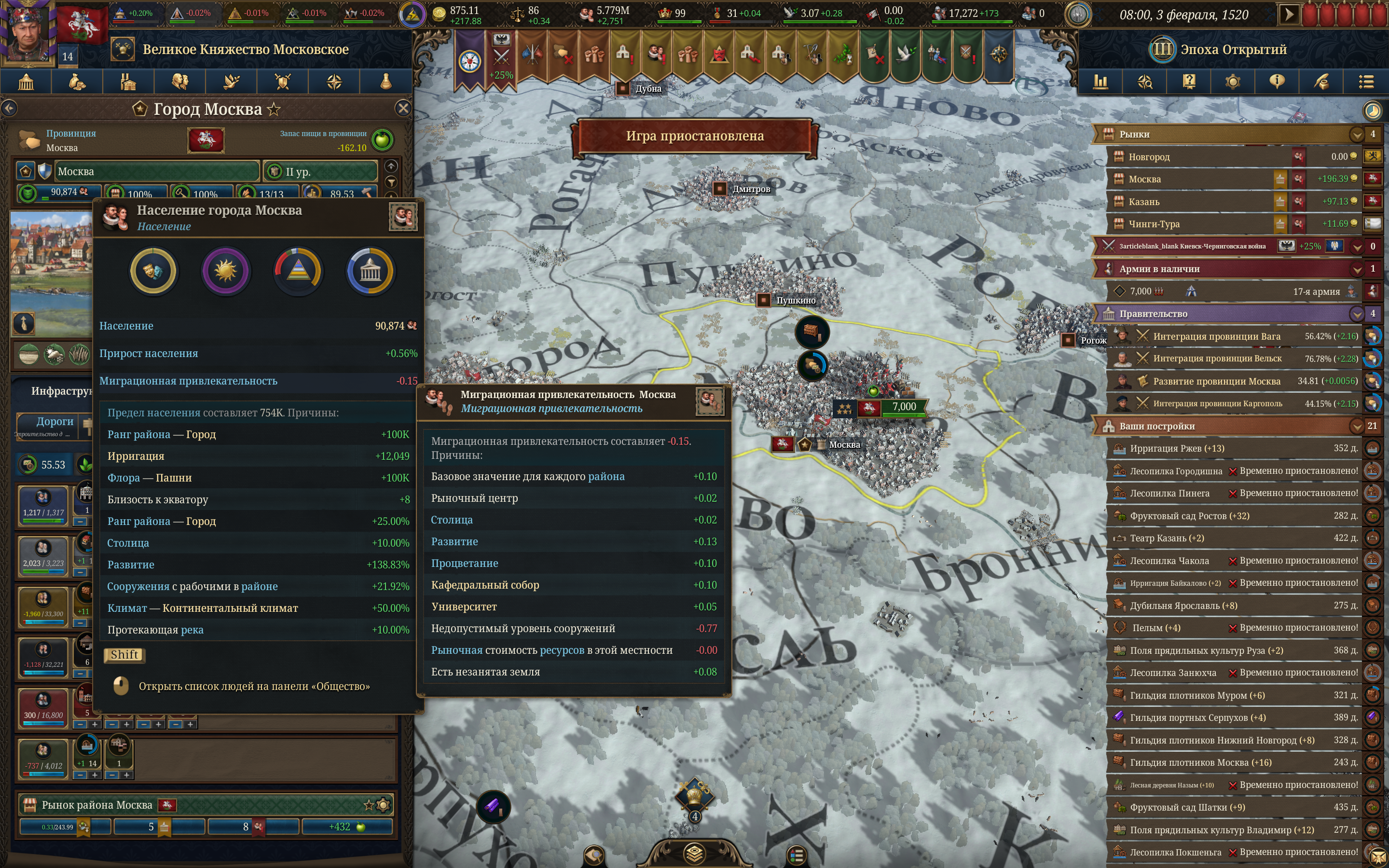 Захотел вручную рынок покрутить и сел на Гренландию почиллить чисто. Но без Йуханобесия не может пройти ни дня, поэтому как оказалось, рынок именно сегодня полностью сломали. А ещё то ли Йухан поломал колонизацию, то ли там тултип просто неправильно прописан, то ли всё поломалось именно из-за того что населения у меня было мало, но колониазация перестала работать. Я набрал 5000 человек для самой возможности колонизировать, поставил доколонить южную оконечность Гренландии и всё. 0% прогресса. Писало, что нет ни одного попа больше 1000 человек которых можно сконвертить в колонистов, хотя это не так. Где-то через 70 лет прокнул ивент на переезд жён, и колония сама собой за пару лет набралась по ивенту. После этого я получил корки и половина населения из столицы сбежала в уже полностью закоренную колонию подчиняясь сложно понять каким импульсам. Не помогали даже проставленные советники на промоут иммиграции в столицу, люди всё равно оттуда бежали. В какой-то момент в южной провке стало больше людей чем в столичном регионе. После этого я прожал колонию на северную провку и... колонизация опять поломалась и даёт 0 прогресса.