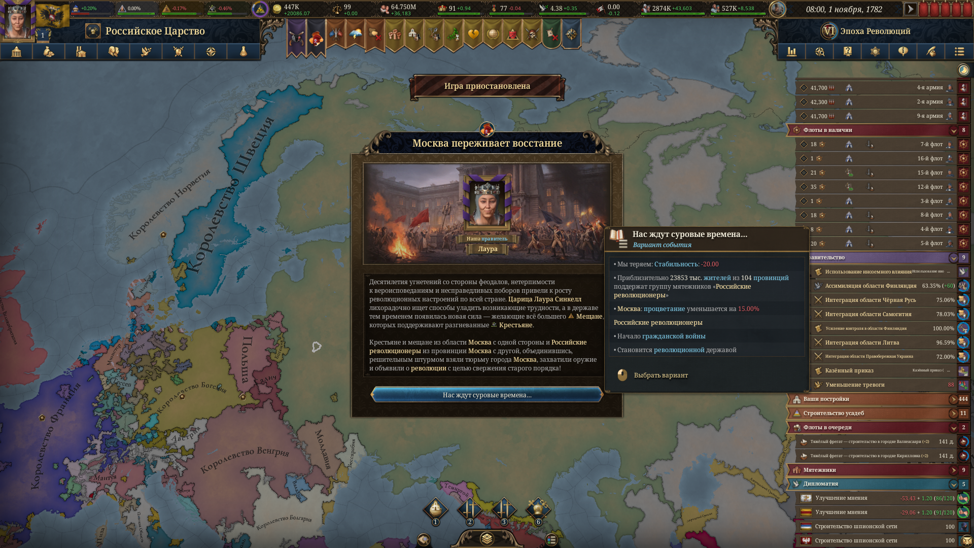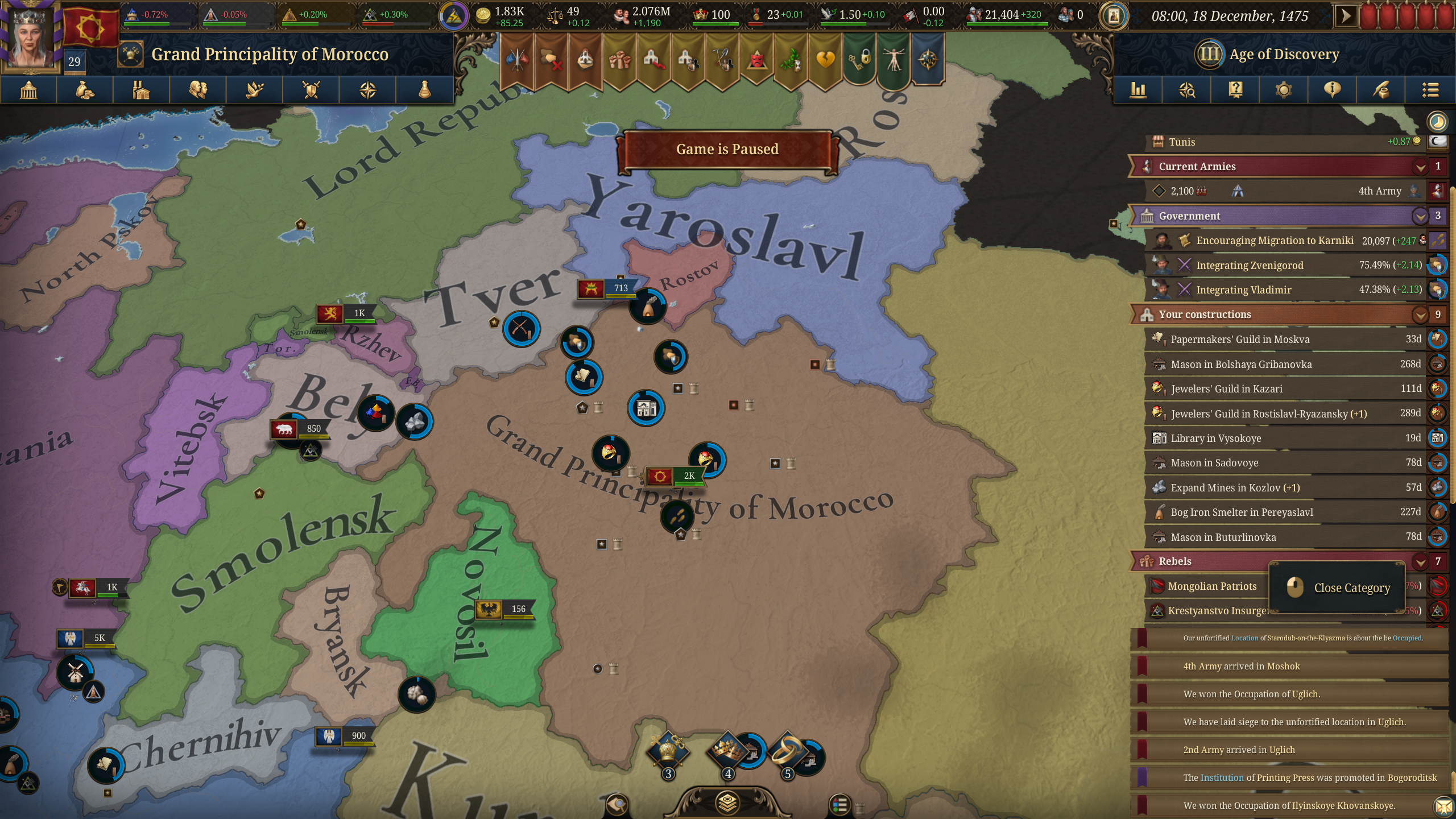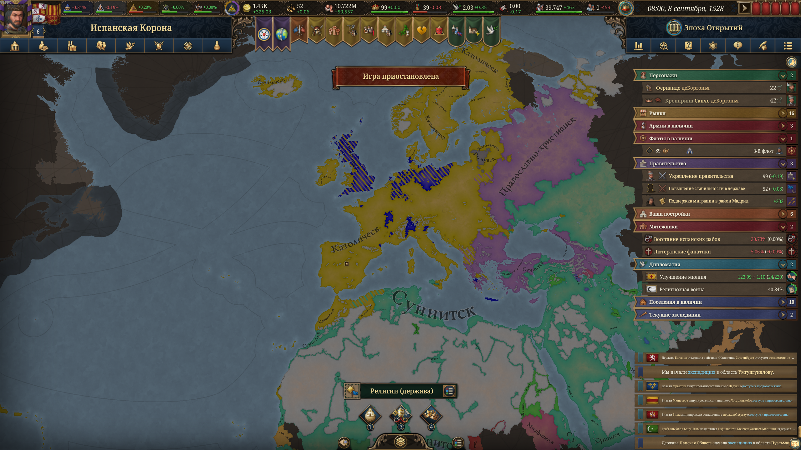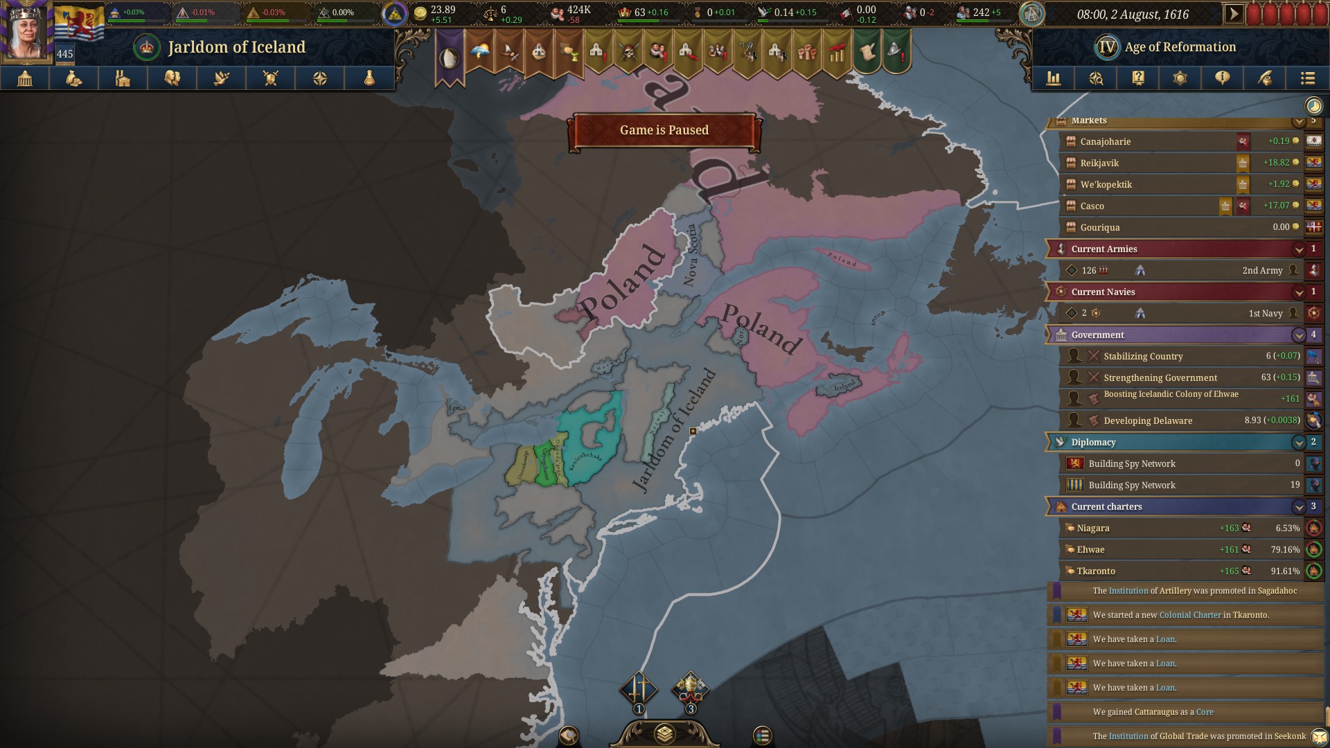 Захотел вручную рынок покрутить и сел на Гренландию почиллить чисто. Но без Йуханобесия не может пройти ни дня, поэтому как оказалось, рынок именно сегодня полностью сломали. А ещё то ли Йухан поломал колонизацию, то ли там тултип просто неправильно прописан, то ли всё поломалось именно из-за того что населения у меня было мало, но колониазация перестала работать. Я набрал 5000 человек для самой возможности колонизировать, поставил доколонить южную оконечность Гренландии и всё. 0% прогресса. Писало, что нет ни одного попа больше 1000 человек которых можно сконвертить в колонистов, хотя это не так. Где-то через 70 лет прокнул ивент на переезд жён, и колония сама собой за пару лет набралась по ивенту. После этого я получил корки и половина населения из столицы сбежала в уже полностью закоренную колонию подчиняясь сложно понять каким импульсам. Не помогали даже проставленные советники на промоут иммиграции в столицу, люди всё равно оттуда бежали. В какой-то момент в южной провке стало больше людей чем в столичном регионе. После этого я прожал колонию на северную провку и... колонизация опять поломалась и даёт 0 прогресса.