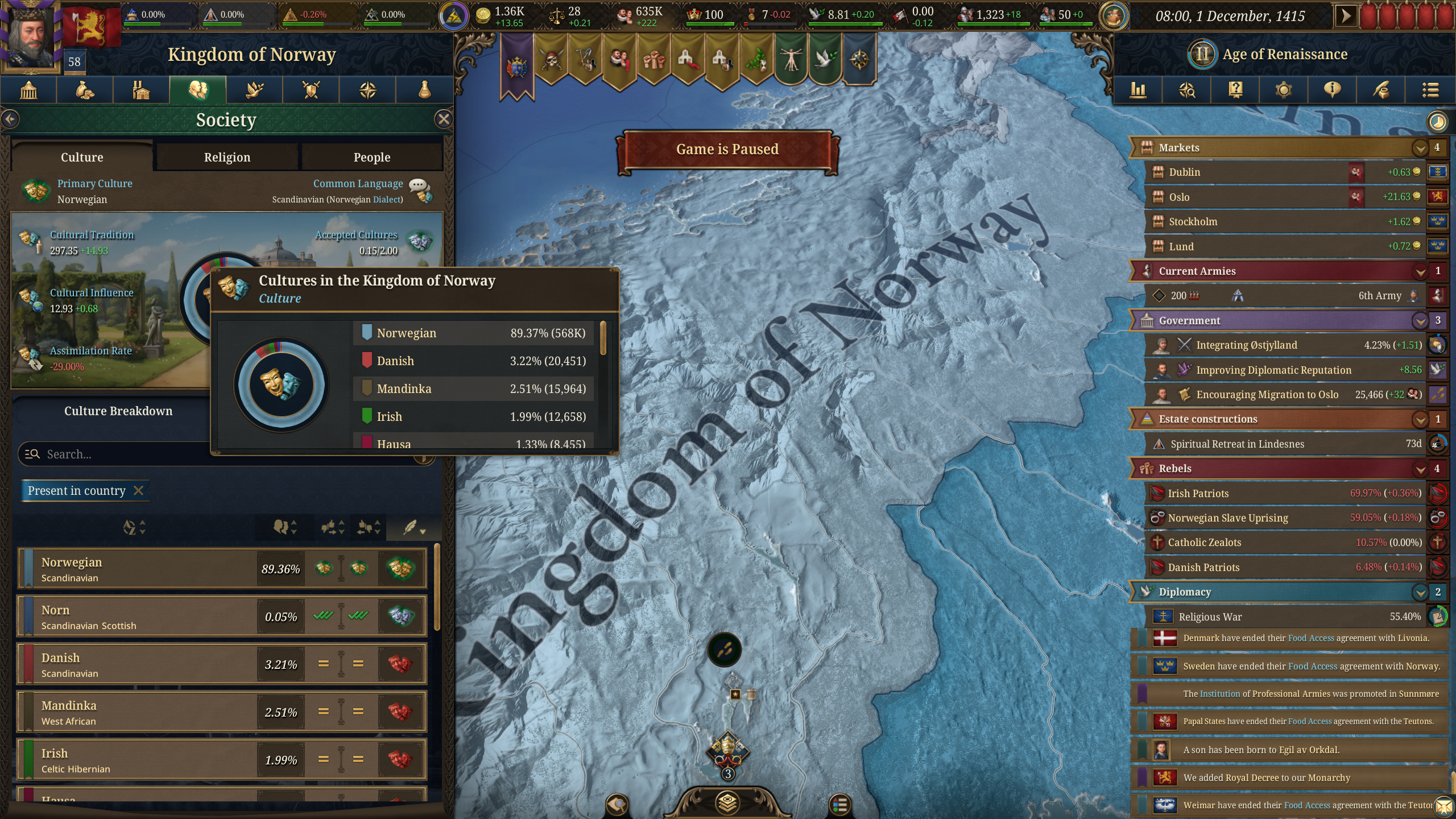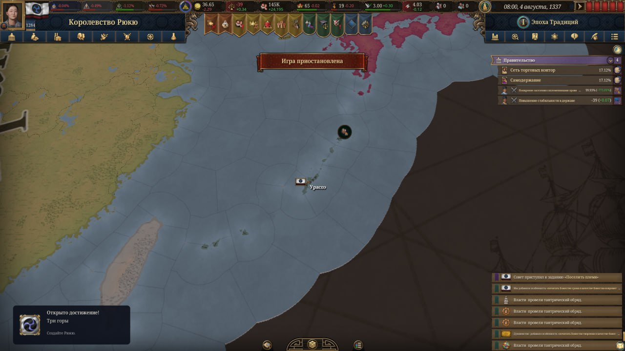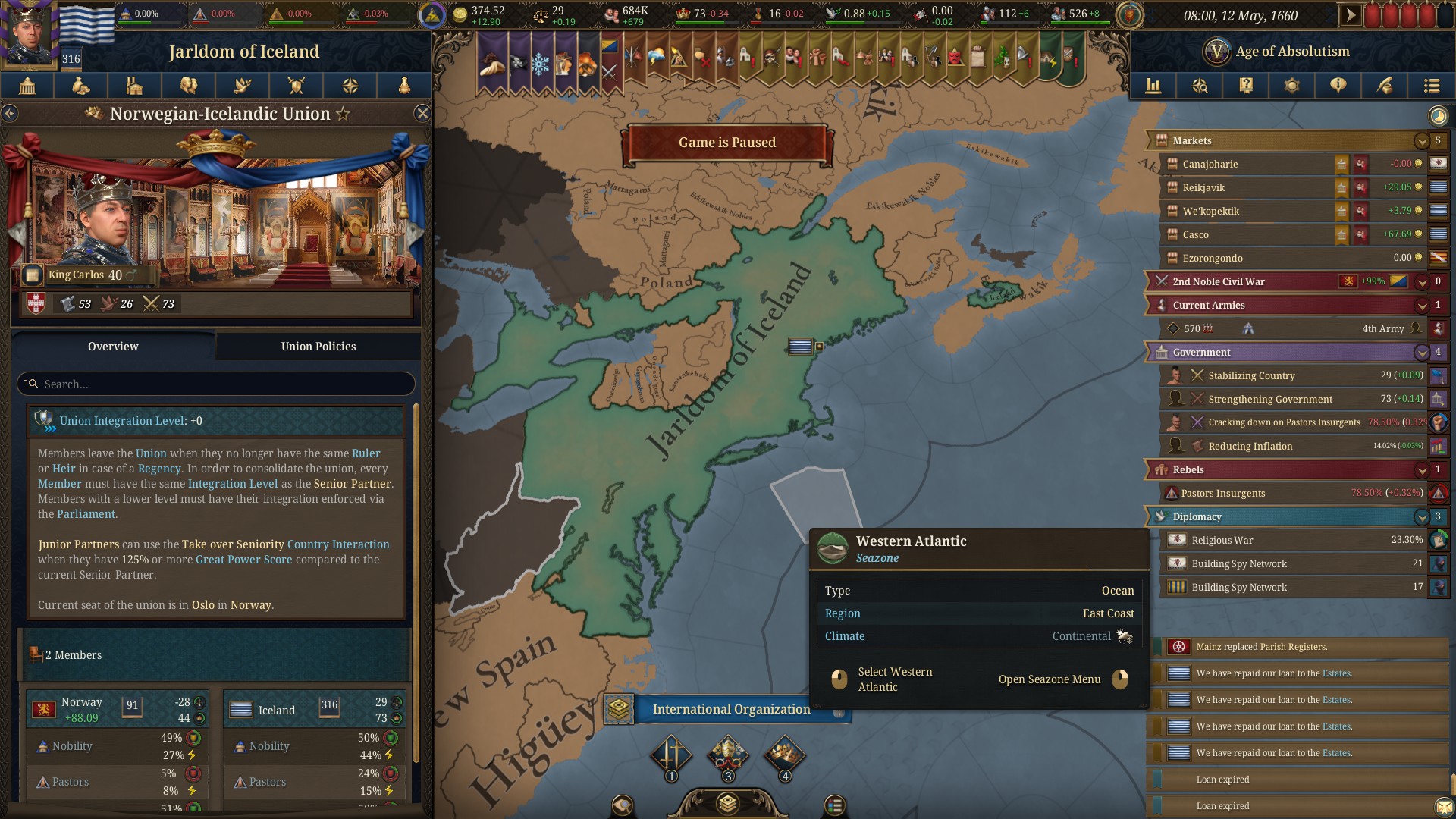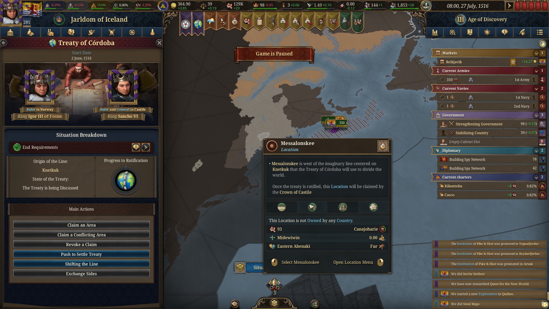 Захотел вручную рынок покрутить и сел на Гренландию почиллить чисто. Но без Йуханобесия не может пройти ни дня, поэтому как оказалось, рынок именно сегодня полностью сломали. А ещё то ли Йухан поломал колонизацию, то ли там тултип просто неправильно прописан, то ли всё поломалось именно из-за того что населения у меня было мало, но колониазация перестала работать. Я набрал 5000 человек для самой возможности колонизировать, поставил доколонить южную оконечность Гренландии и всё. 0% прогресса. Писало, что нет ни одного попа больше 1000 человек которых можно сконвертить в колонистов, хотя это не так. Где-то через 70 лет прокнул ивент на переезд жён, и колония сама собой за пару лет набралась по ивенту. После этого я получил корки и половина населения из столицы сбежала в уже полностью закоренную колонию подчиняясь сложно понять каким импульсам. Не помогали даже проставленные советники на промоут иммиграции в столицу, люди всё равно оттуда бежали. В какой-то момент в южной провке стало больше людей чем в столичном регионе. После этого я прожал колонию на северную провку и... колонизация опять поломалась и даёт 0 прогресса.