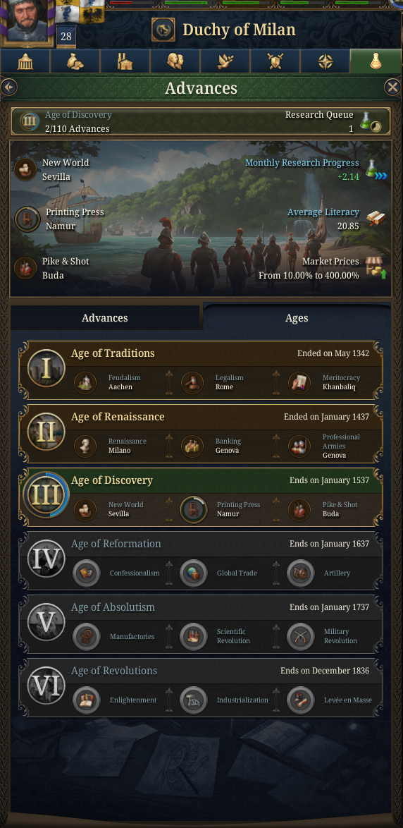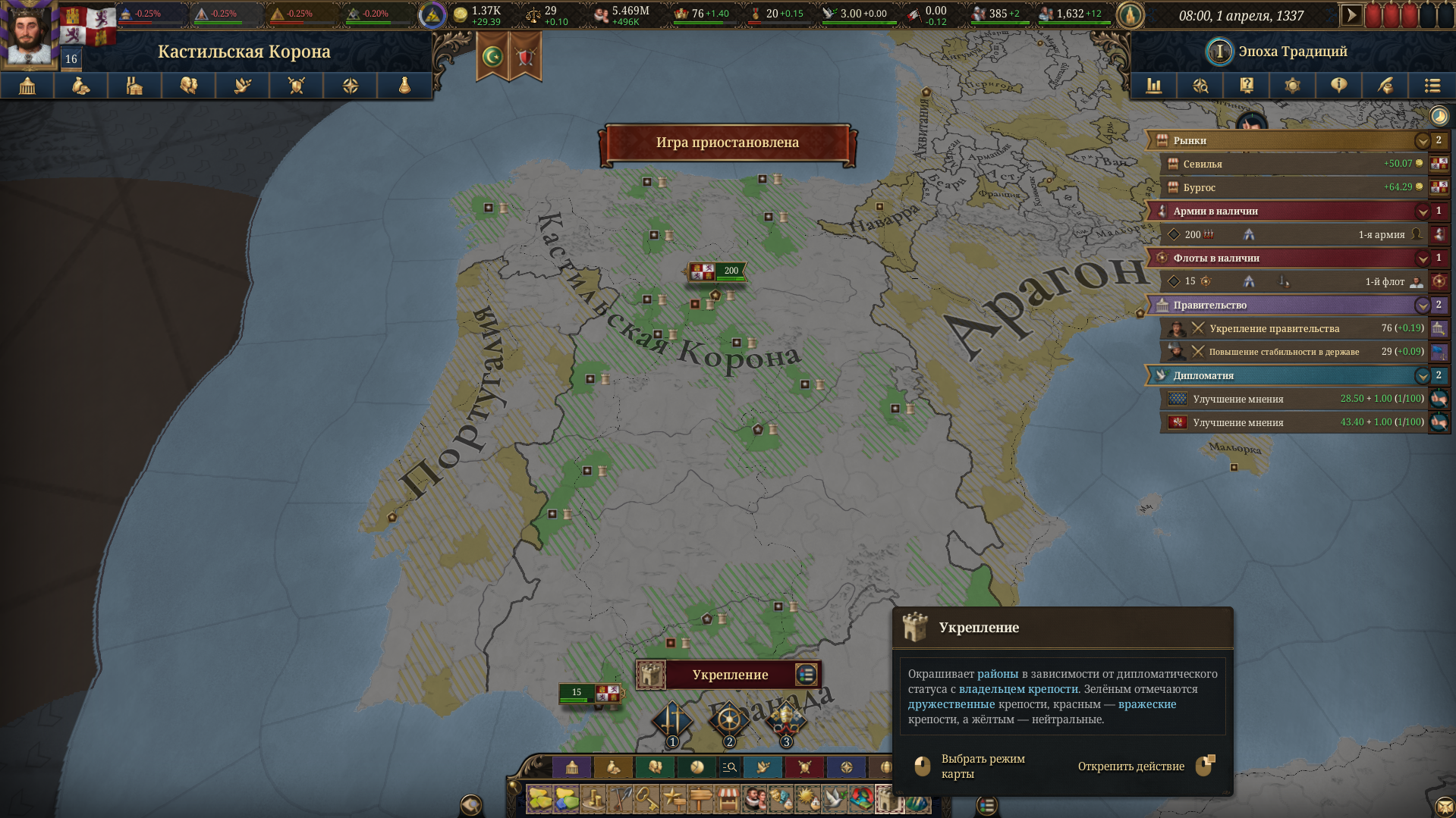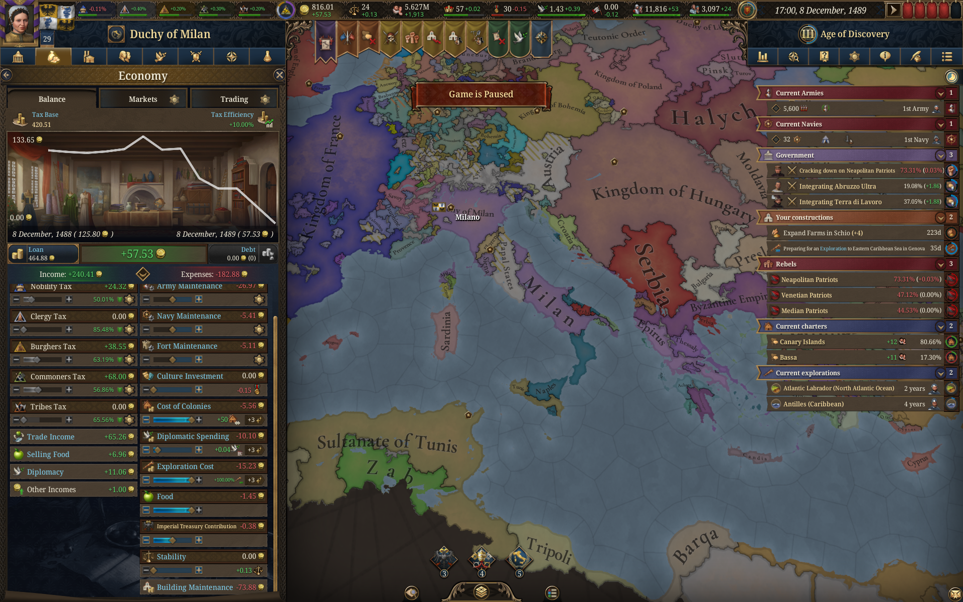 Короче, моя первая катка за Милан, похоже подошла к концу. Изначально у меня был план: 1. Построить домики и сделать денег; 2. Собрать регион Италии (дальше протекать не хотел); 3. Попробовать погонять индейцев и посмотреть на колонизацию.