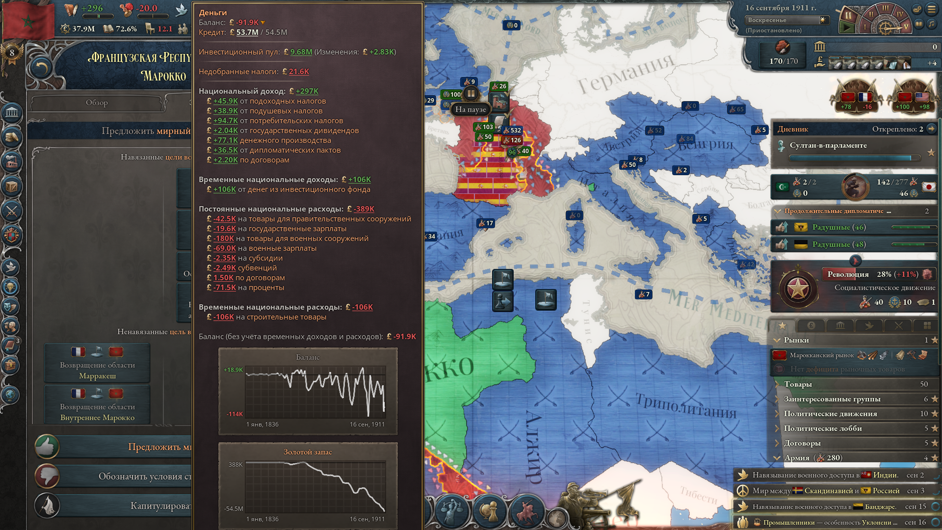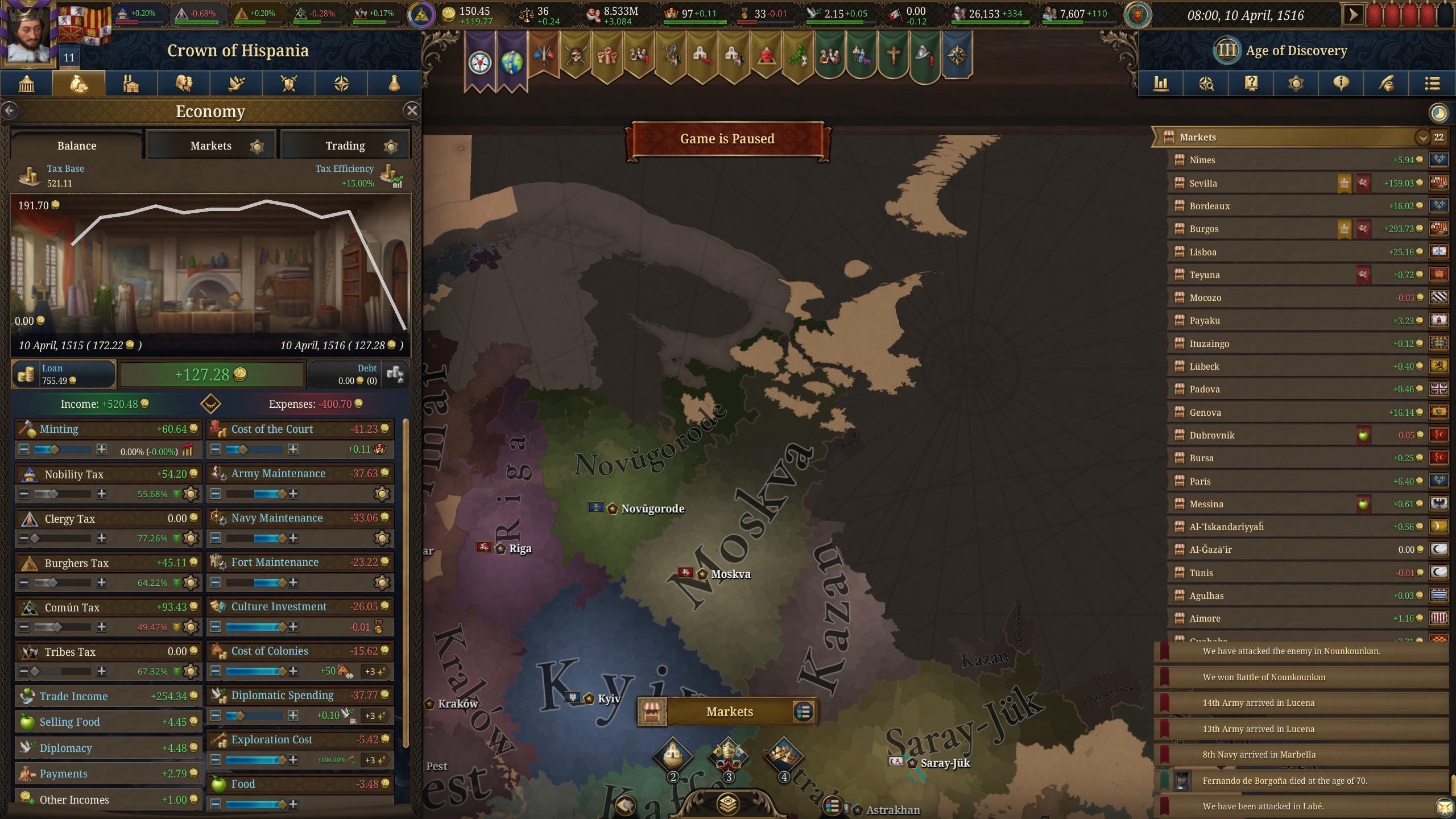 Я не могу больше ни красить - все вокруг в союзе а мои союзники типо Испании и Франции тупо не хотят за меня воевать, ни вывести экономику из крутого пике (например, сделать контроль на юге), мне говорили строить рынки везде, я их построил в итоге трачу почти 9 монет на их содержание ни колонизировать плюс аноны в треде писали что колонизация не приносит денег только отсос