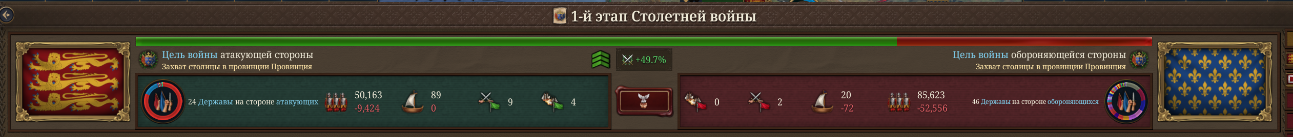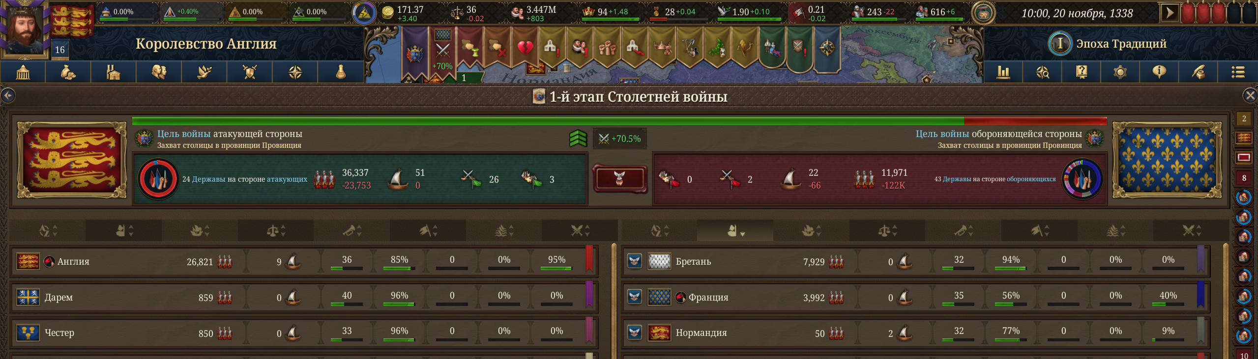 Я в текущей партии дважды воевал с Францией в течение 14 века: в первый раз кое-как вышел на мир, правда, отдав кучу денег, доступ к продовольствию и тд, но не отдав ни пяди земли; во второй раз я вообще их размотал, поставив на бабки, спасибо Пиренеям и Папе-союзнику за это.