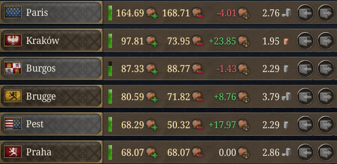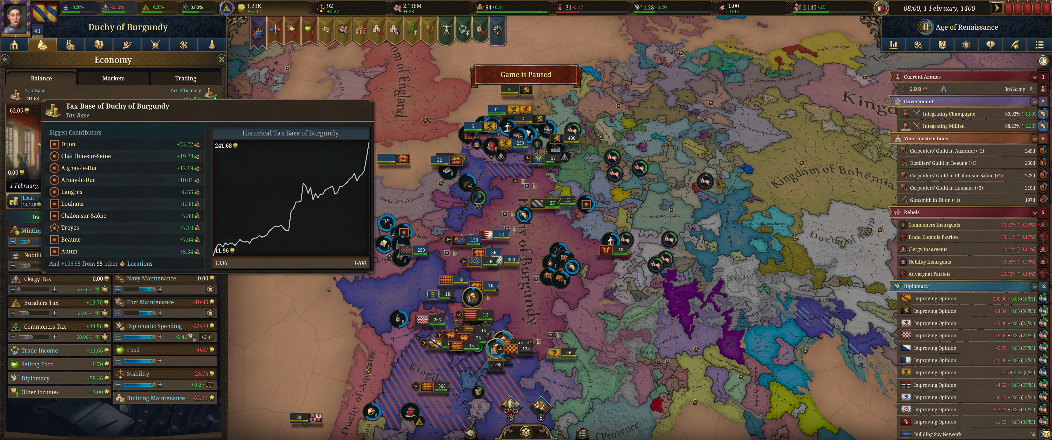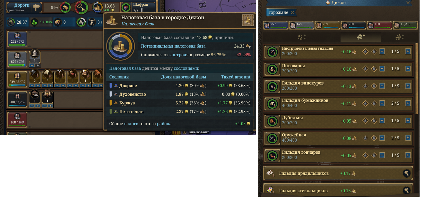 Есть два города в Бургундии, Артём и Дижон. В обоих городах почти одинаковое количество горожан, но в Артёме больше контроля (потому что столица - 100, в Дижоне 56) и чуть лучше домики по доходу. ОДНАКО, в Артёме налоговая база горожан в два раза хуже налоговой базы в Дижоне где меньше контроля и чуть хуже домики.