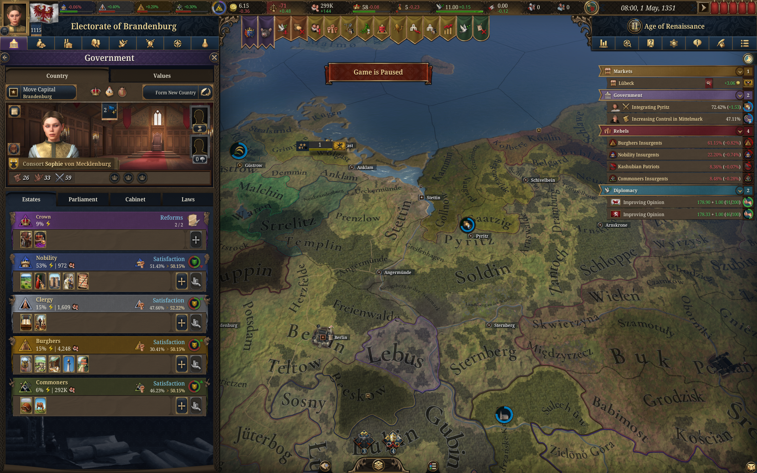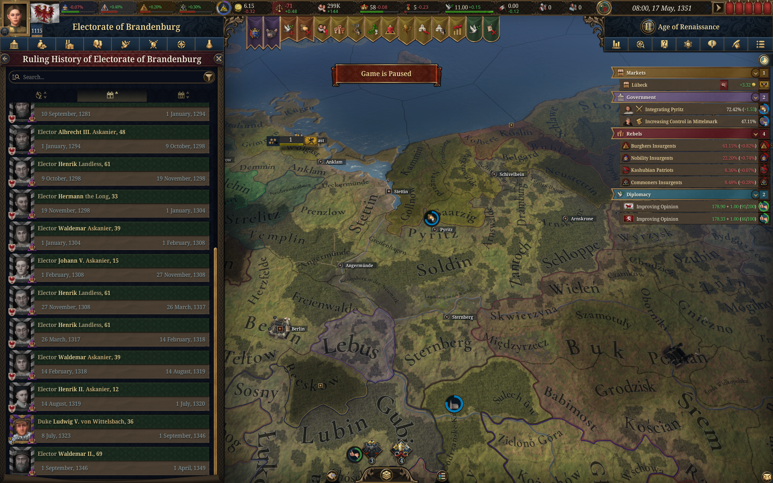 >>50455486 Скорее всего я реально иначе заменеджил страну нормально отконтролив сословия и налоги с них, а ты нет. Потому что у меня все вассалы присоединены были, все шахты построены и я даже захватил серебро у Майсена и золота у Плауэна соседнего.