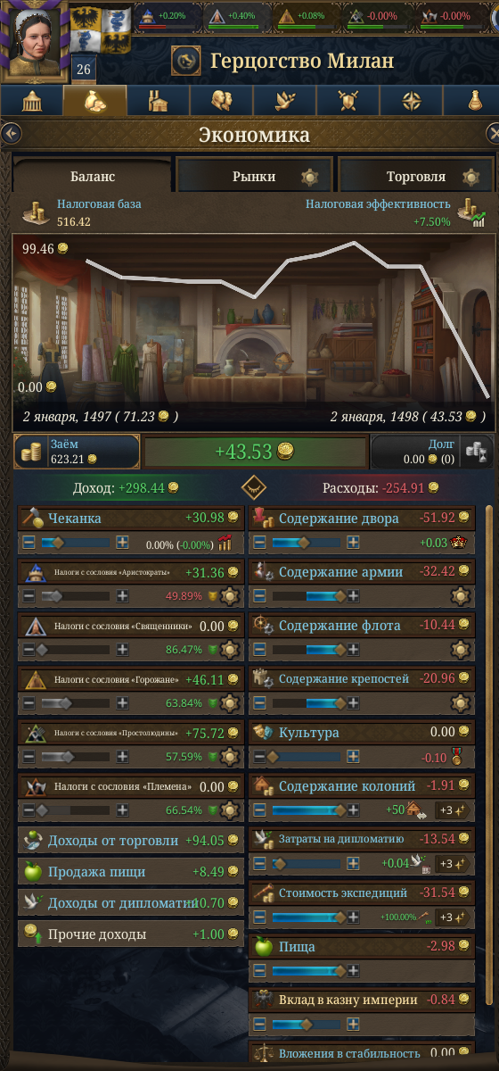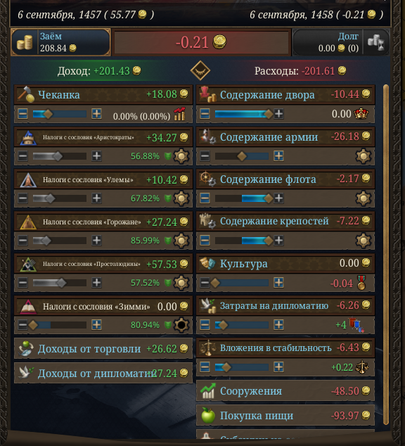 >>50478607 Это не экономия, это твои деньги, которые в силу некоторых причин оказались у сословий. Они пропукиваются на постройку дорог из села говново в село зажопинск, идут на поддержку восстаний, на постройку еще больше усиливающих сословия домиков. Так что, если ты не в начале игры, когда особо вариантов нет, я бы так не радовался. У них должен быть доход чуть выше расходов.