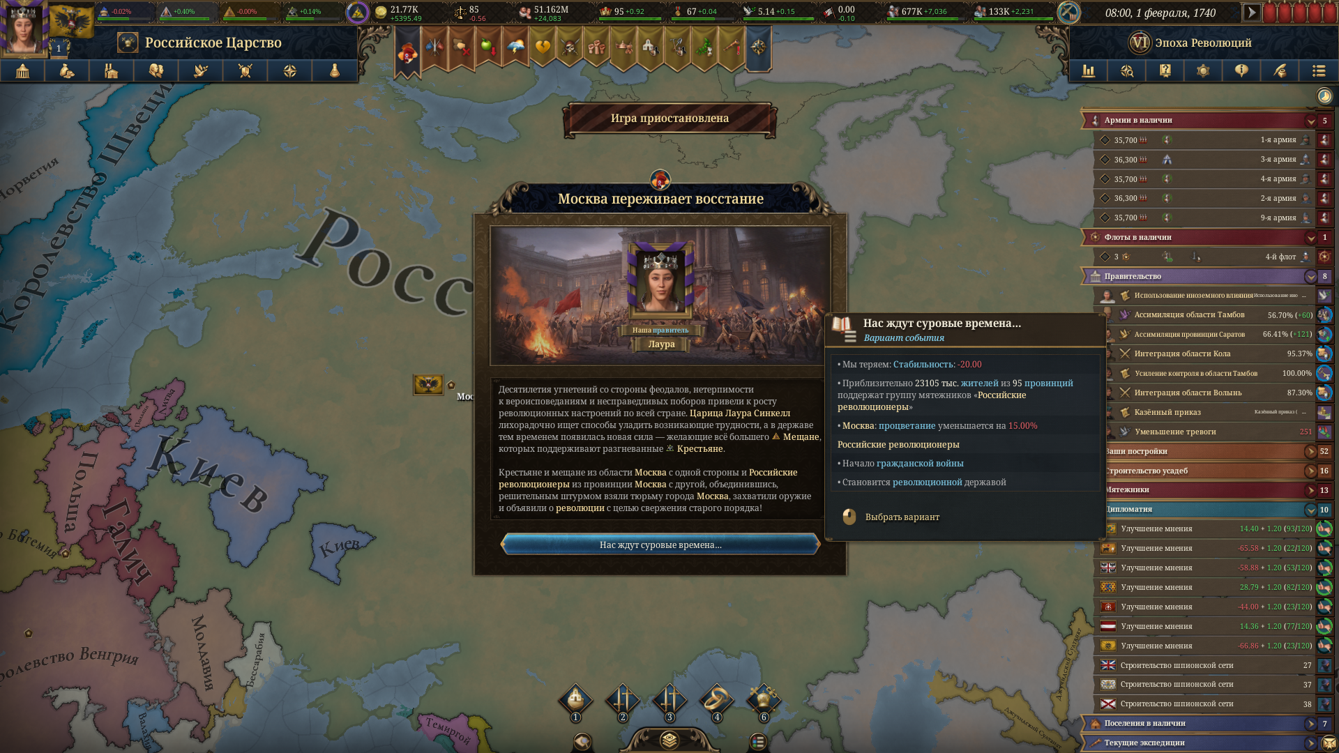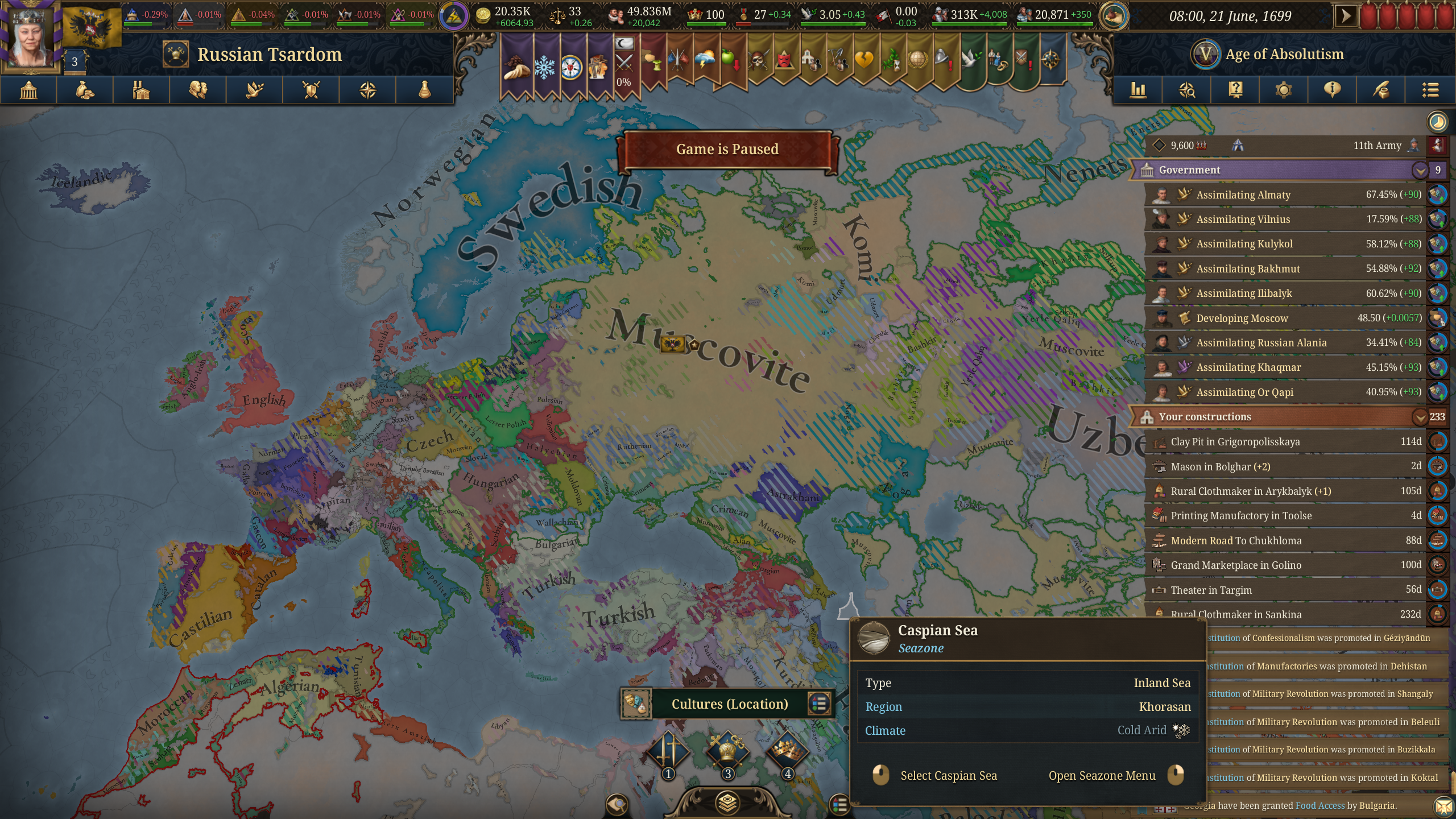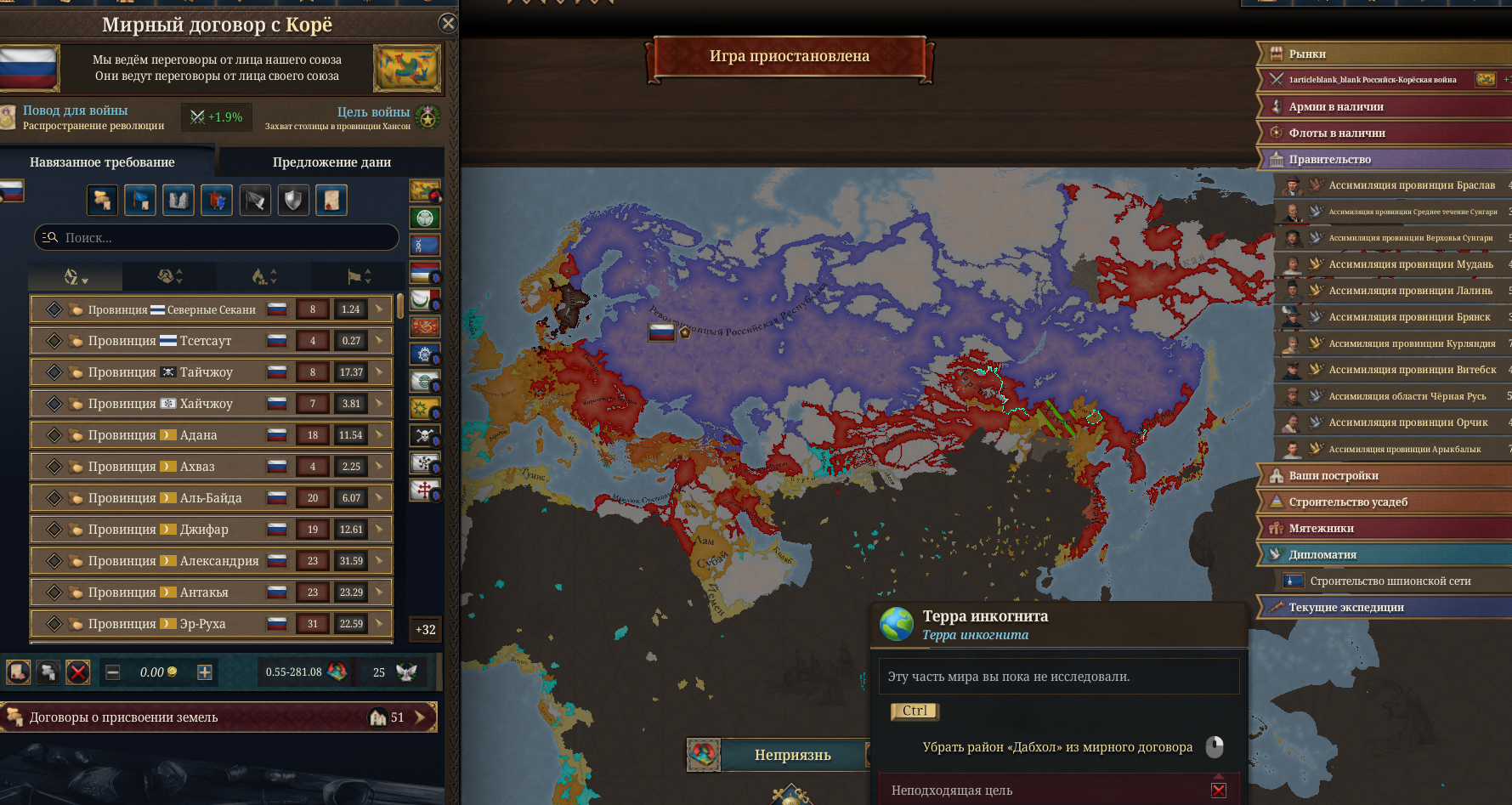 >>50477383 Примерно так это выглядит на карте контроля, для понимания. Можно конечно покрасить все от польши до китая, размазывая доход по степям с 20% импакта, но институтов будешь ждать по 100 лет. Советники не бесконечные, и пока ты интегрируешь провинцию, другие не ассимилируются, не конвертятся, развитие там не повышается. Это не говоря о том, что придется каждый год подавлять по 4 восстания.
