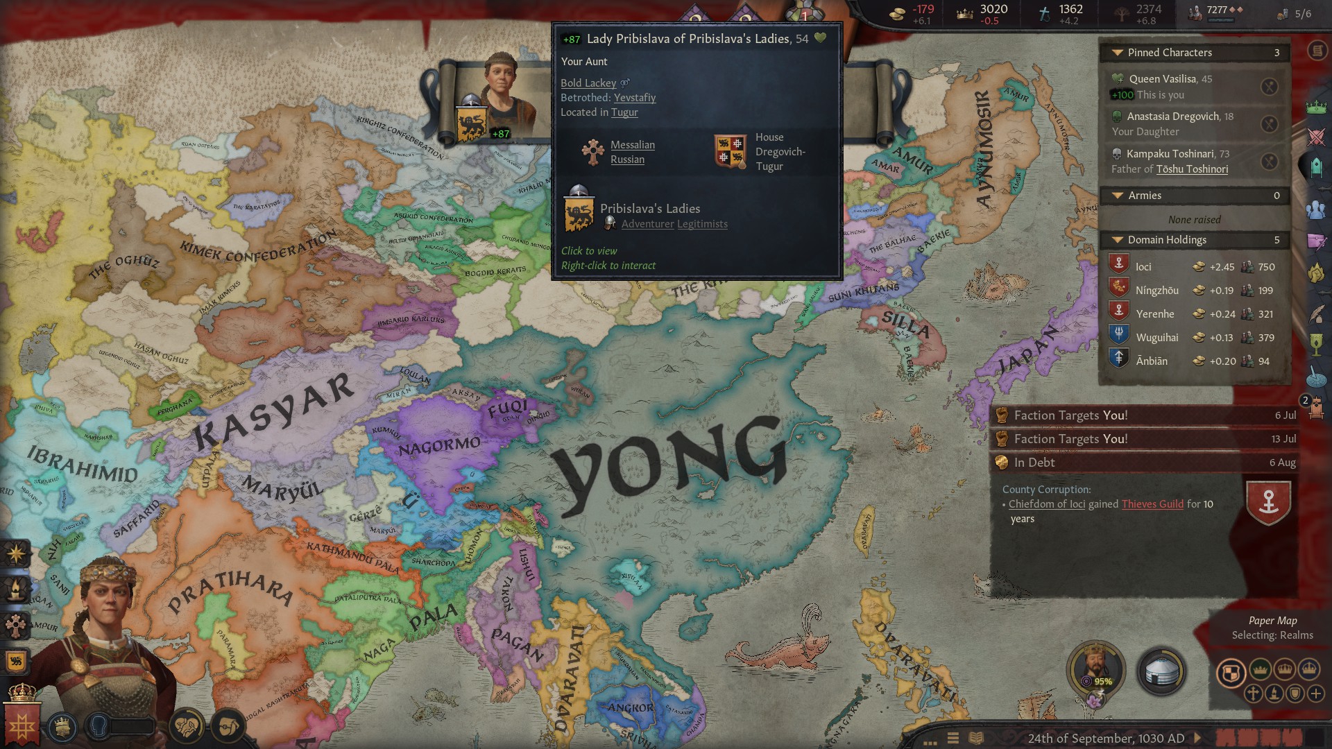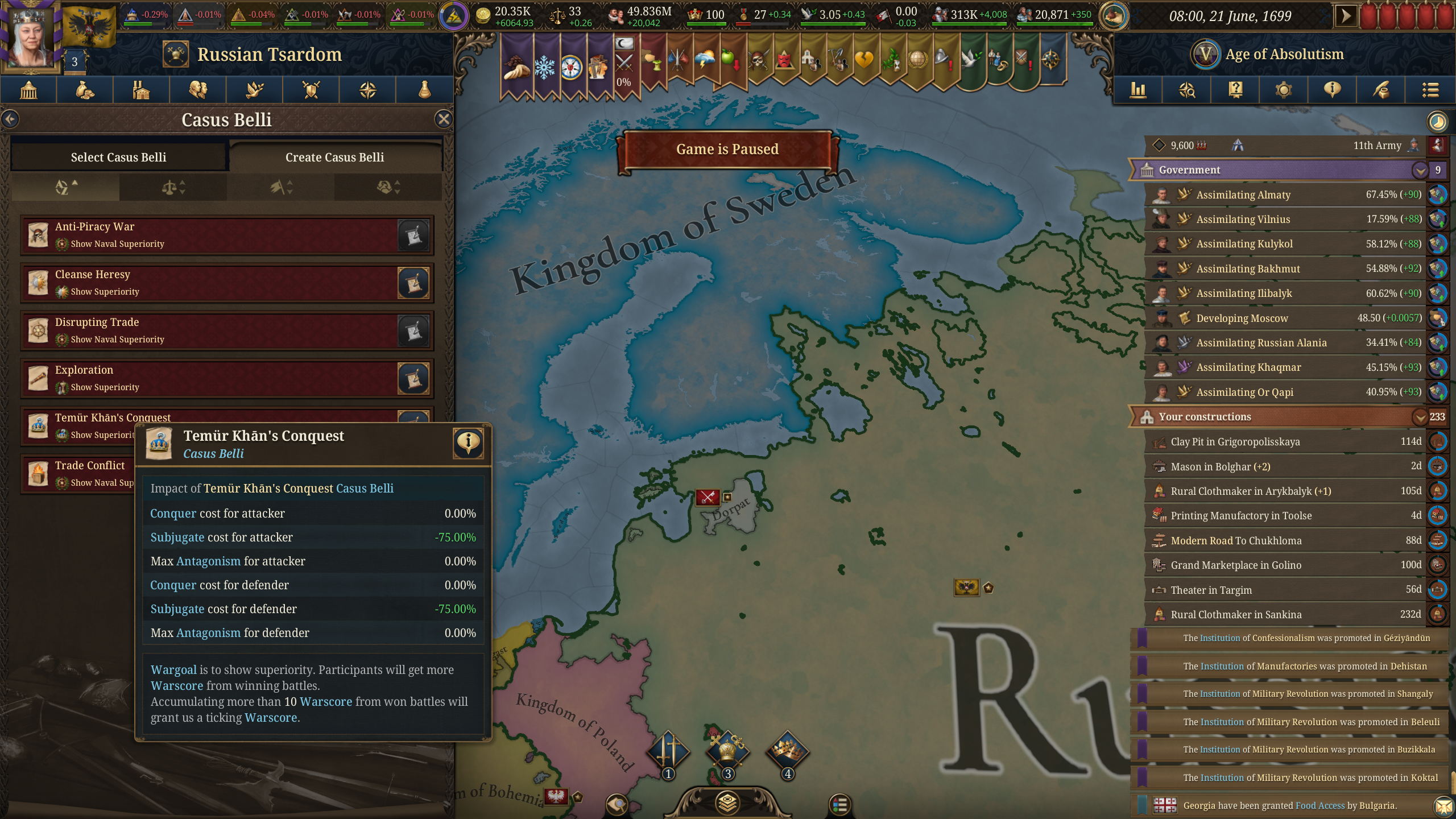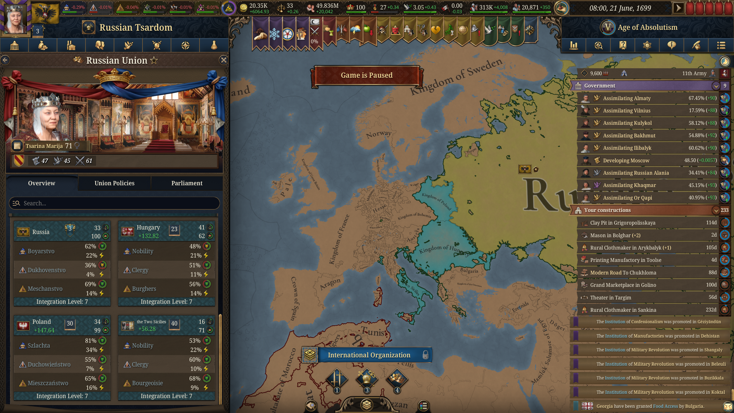 >>50477383 Примерно так это выглядит на карте контроля, для понимания. Можно конечно покрасить все от польши до китая, размазывая доход по степям с 20% импакта, но институтов будешь ждать по 100 лет. Советники не бесконечные, и пока ты интегрируешь провинцию, другие не ассимилируются, не конвертятся, развитие там не повышается. Это не говоря о том, что придется каждый год подавлять по 4 восстания.