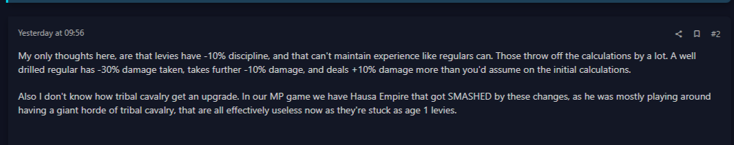>>50479001 >Надо треть армии делать обозом. во1) разве так не было исторически? что на одного рыцаря на поле боя по 5-6 человек работали во2) есть технологии которые уменьшают потребления еды армией и возможно этот юнит будет дальше апгрейдится увеличивая кол-во еды