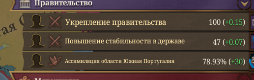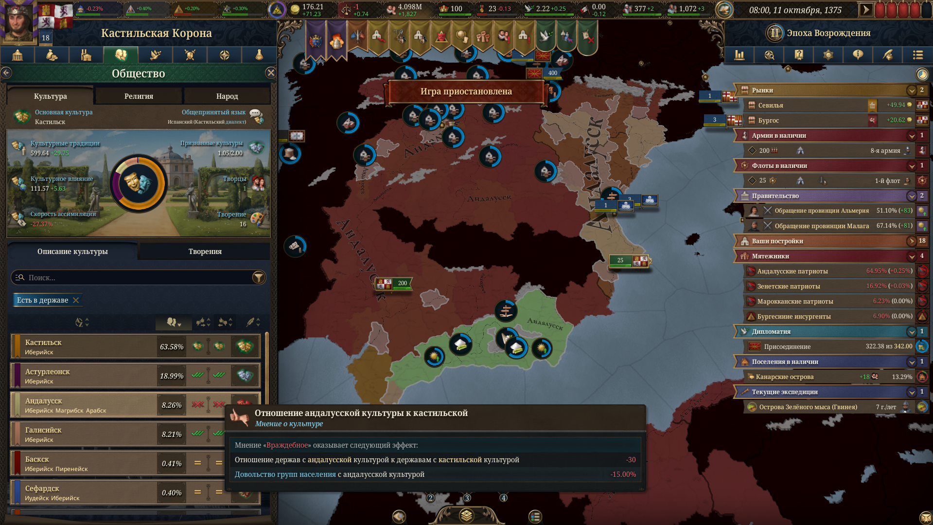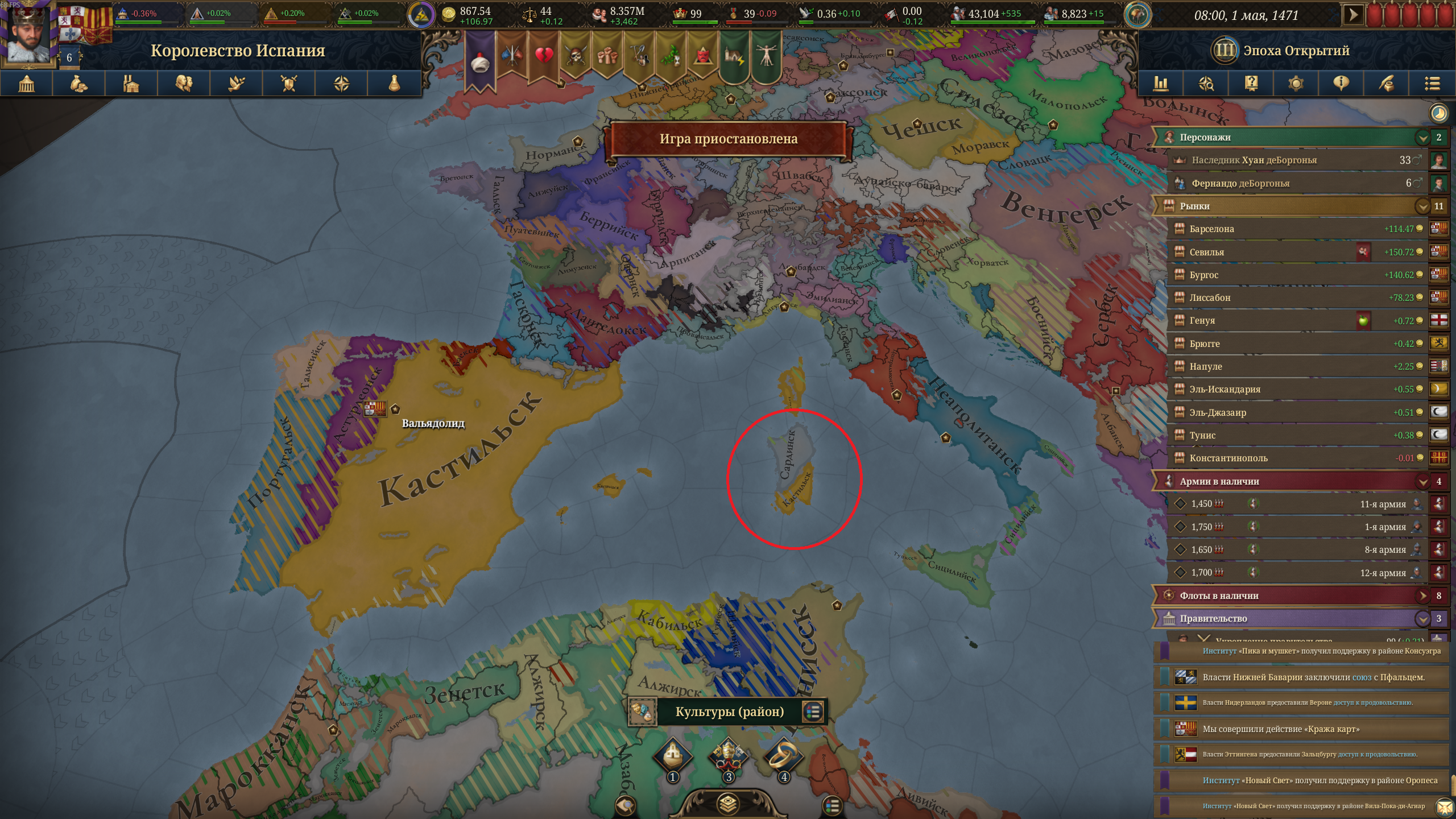 Не знаете, по какой причине Королевство Сардиния (мой вассал) скидывает "культурное принуждение"? Уже в третий раз. Корсика легко перекрасилась, марокканские вассалы перекрашиваются, но сардинцы упорно сопротивляются. Придворный язык — испанский. Мнение положительное.