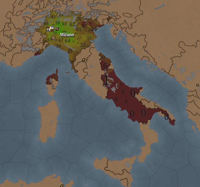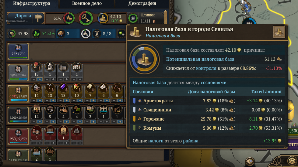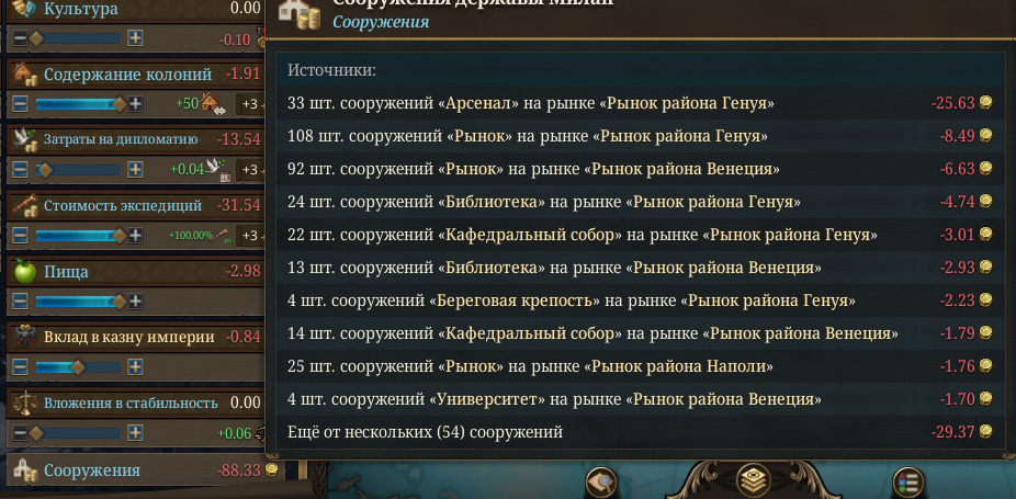 Ты тотально проебал контроль, ты хоть что-то делал для него? Дороги? Бейлифы? Порты? Кабинетные задачи? Переноси столицу в рим, чтобы было равноудалено. Где твоя ассимиляция и интеграция? Кабинет должен въебывать нонстоп. Расходы на мусор ебнутые, кучу дерьма можно срезать. Доход 40 монет ни о чем, даже говно. Италия богата аграрными землями, побережьями и мягким климатом. Это значит, что у тебя должно быть еды жопой ешь и бонус к городам по населению. Где твои застройки?