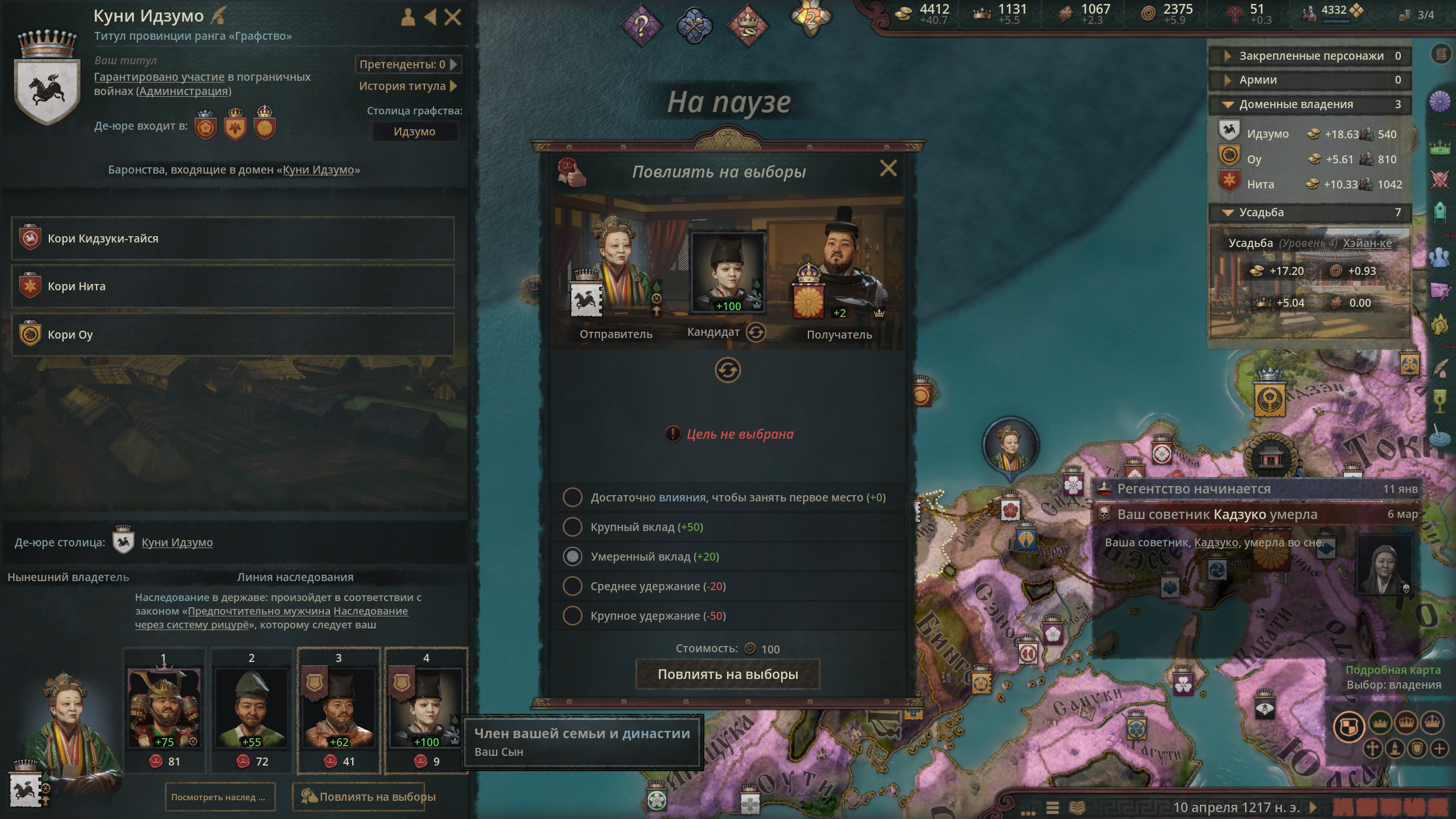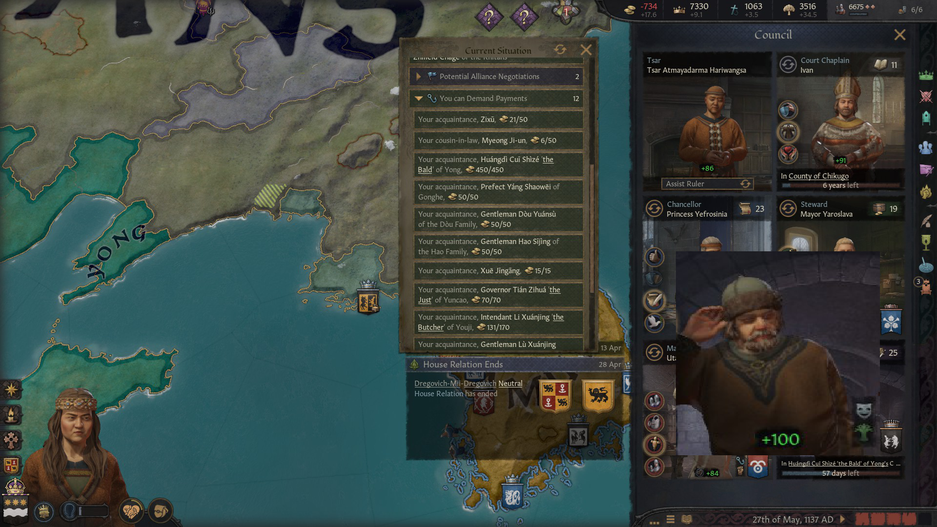 >>50478342 >Ещё надо своих чаров расплождать как в симсах. Кликай по советнику и ищи ему жену. Честно говоря, я заебался кликать. Первые сто лет кликал, а потом плюнул. Итог на вашем экране.