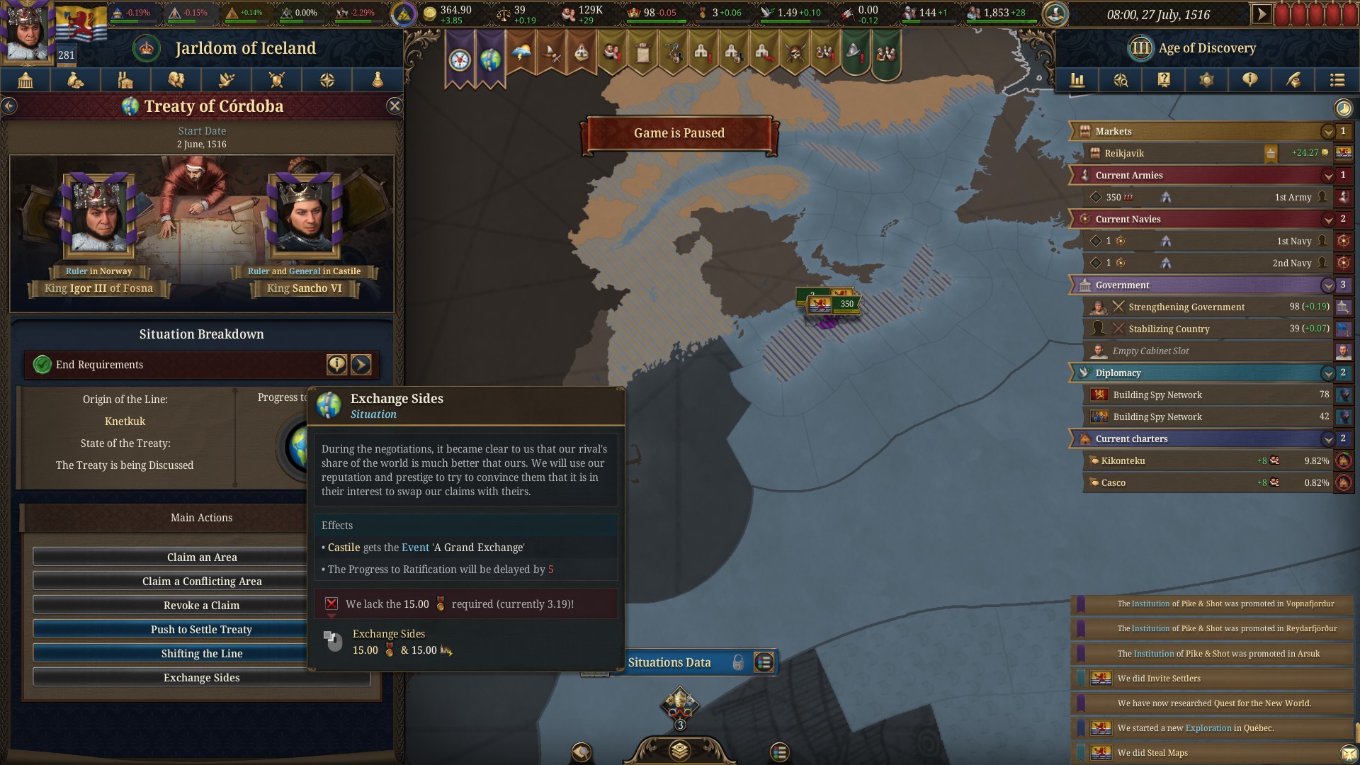 Мы с Англией заключили тордесильясский договор, а спустя некоторое время она перекатилась в лютеранство, и в договоре остался я один. Пока договор действует, ни одна другая католическая страна, включая самого великого маляра Папу, не может колонить. Кто там жаловался на договор? Это же кек. Главное успеть закрасить все берега.