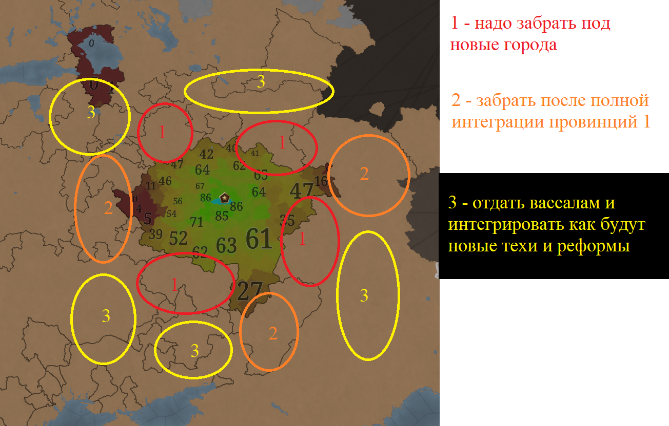 1. В пределах радиуса 2-3 провинции от город строим рго до пердела 2. От этих застроенных провок строим к столице дороги 3. Строим Москвабад из столицы и окружающих провок, делаем все это городами и застраиваем домиками с учетом доступных в провинции рго (если есть глина строим гончарку, после гончарки строим селитру потому что гончарка там юзается, после селитры пушки и ружья, а для пушек и ружей нужны инструменты, а для них дерево, а если инструменты значит и оружие, а для оружия уголь итд) 4. Ни в коем случае не забываем про еду, тоже очень важно отстраивать хорошие провки с едой, например с злаками и скотом у которых по 8 еды. Строим в таких провках сх деревни, ирригацию и прочие домики производящие, либо увеличивающие производство еды.