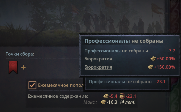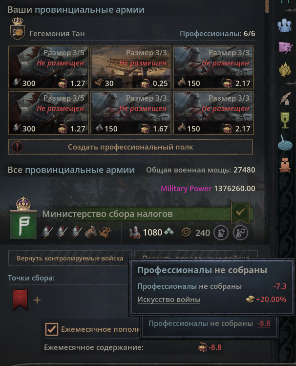 Вот вам лайфхак. Можно дробить профессионалов по 1 отряду и раскидывать по всей стране чтобы везде был бонус от присутствия армии. Как я понял нет значения какого размера армия, главное чтобы была.