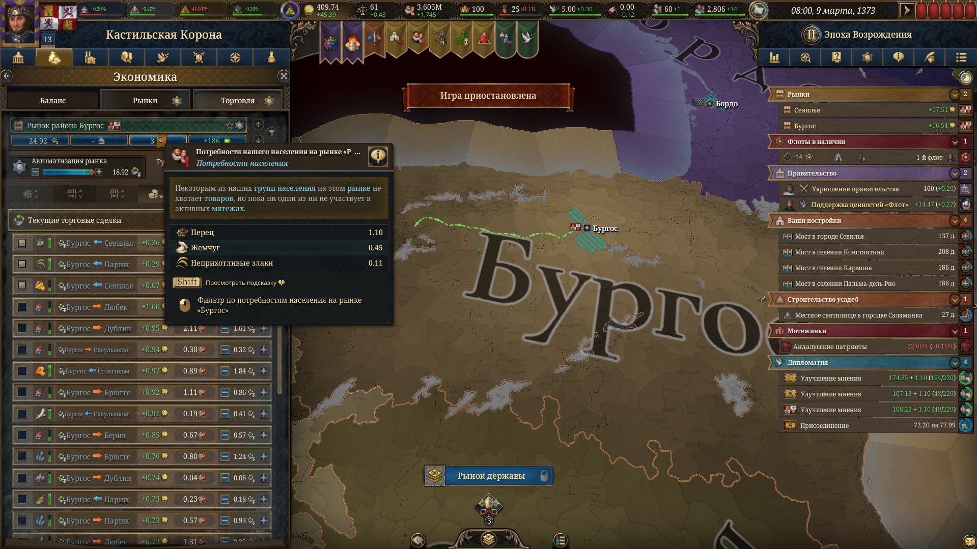 >>50455453 >В этой части у тебя 20-50% инкама это трейд Я играл за Богемию и у Богемии миллионы золота и серебра, которые скупает весь мир. К 1444 у меня было 6 городов (не городков, а именно городов) и штук 10 городков, везде были фулл рынки плюс вся страна в торговых деревнях, выданы две привилегии на +10% потенциала. В итоге трейд приносил 100 монет, налоги 700.