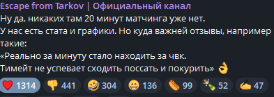 >>50458514 > никто об этом ничего не сказал. Потому что щас есть другая большая проблема - пиздецовые долгие загрузки. Вот я новичок, вкатился в тарков сейчас - 6 минут ждал, пока рейд найдёт. Потом 3 минуты ждал игроков. Потом катка закончилась - ждал ещё 2-3 минуты, пока загрузится главное меню. И это всё только одна катка. Хуевая игра, которая заставляет тратить так много времени на ожидание. Какой бы тарков не был, но эта хуйня отбивает желание играть. но всё же ещё дам шанс