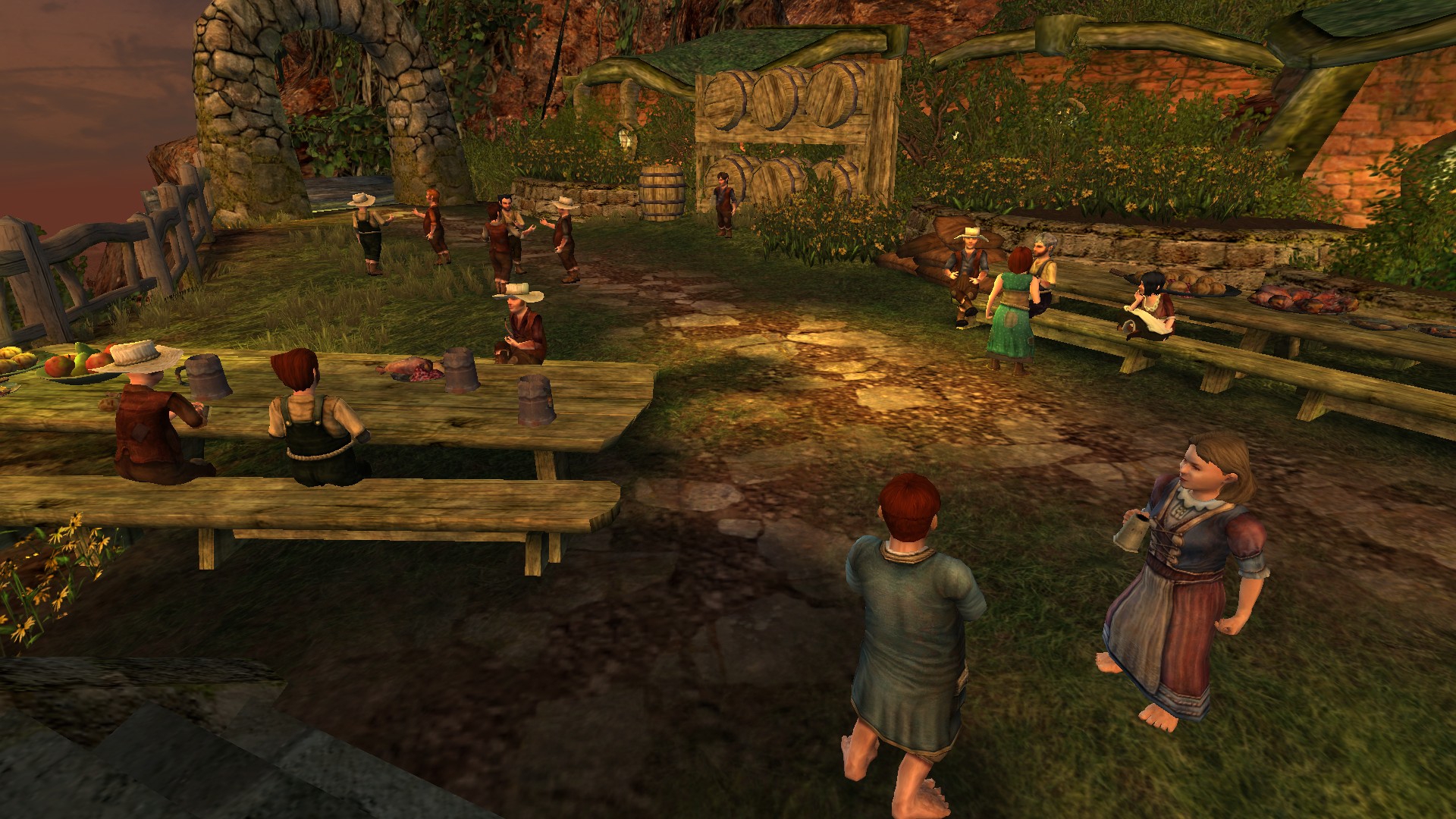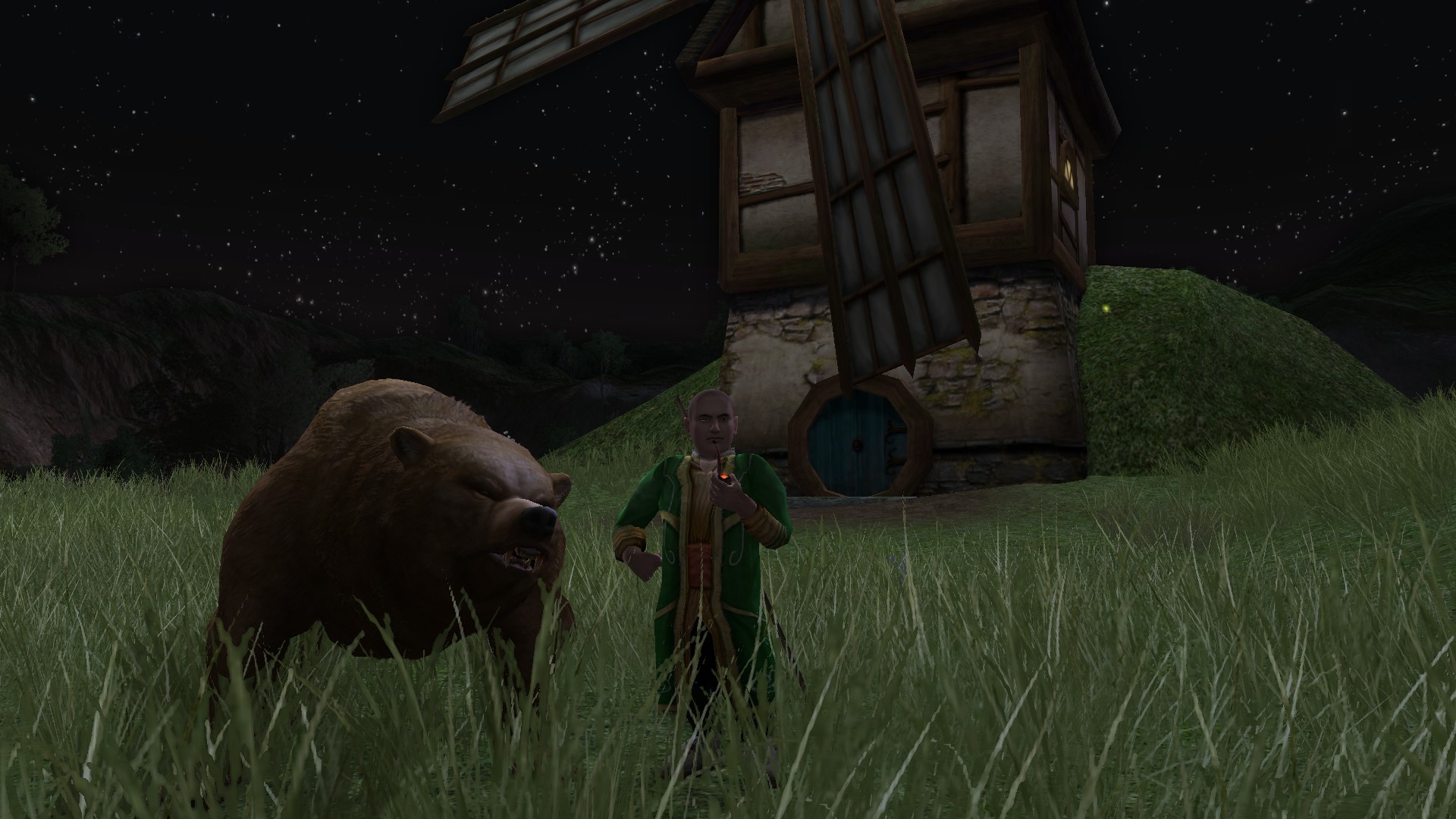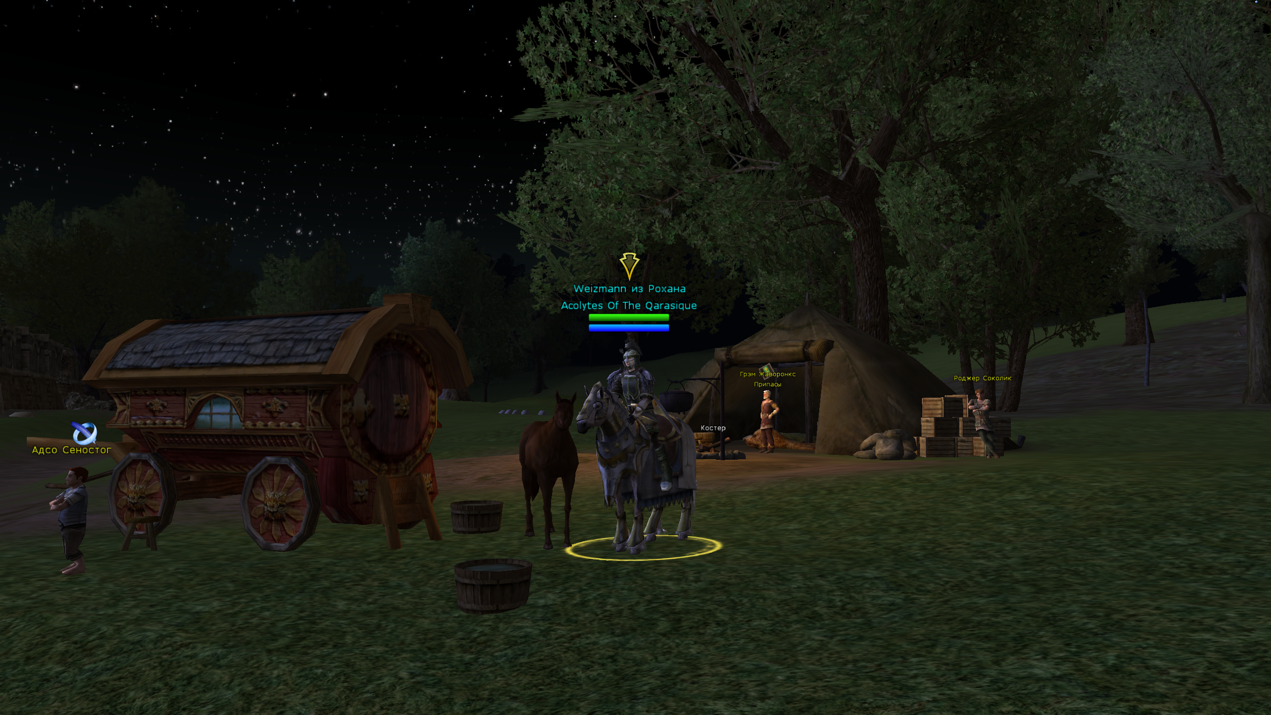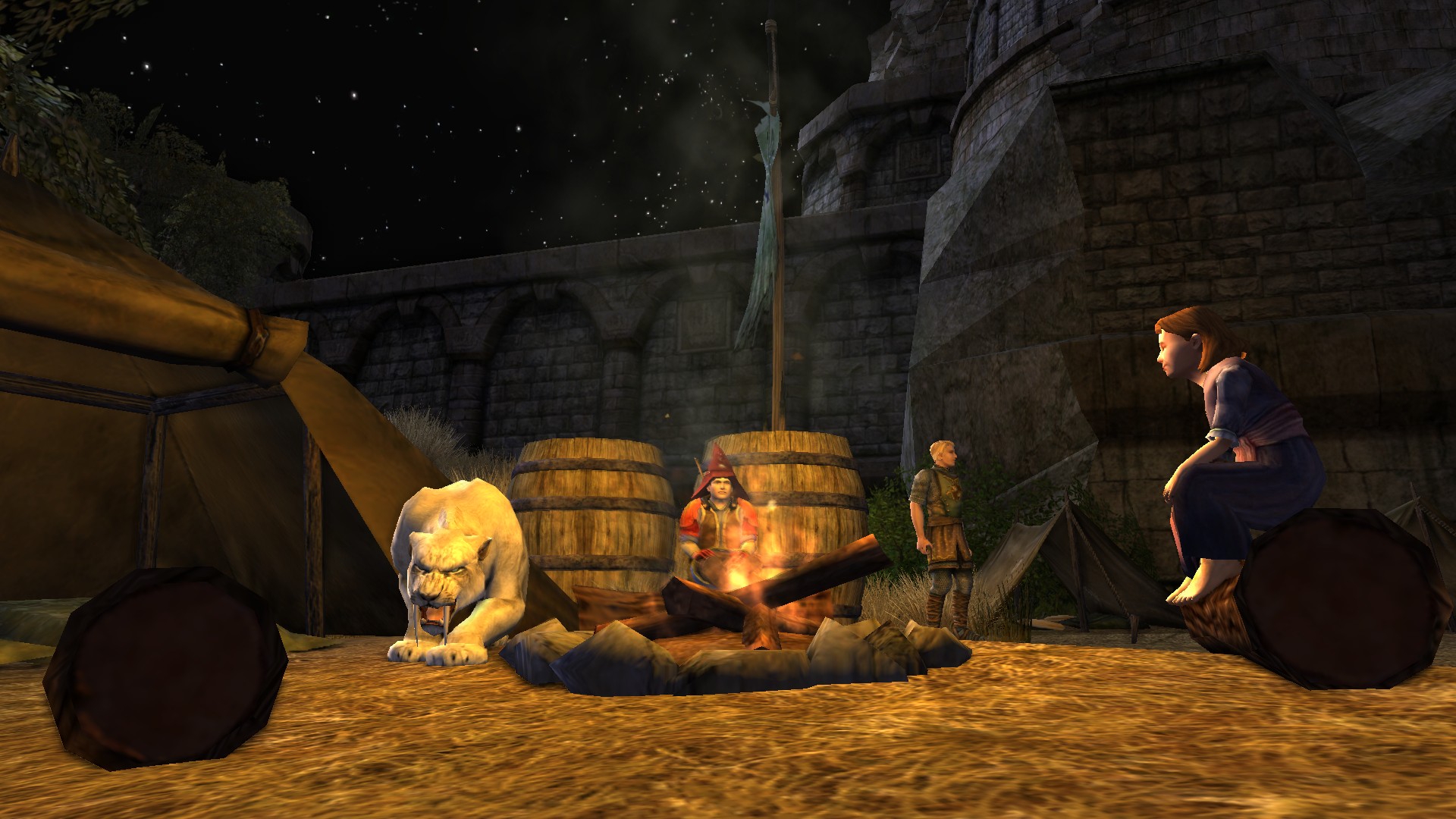 Зашёл посидеть у костра в лагере Адсо. Ну, просто перед сном насладиться этим великолепным миром. Сидим-сидим. Вроде хорошо: костёр, палатки, звёзды, Луна. Ай, думаю, погнали в Вековечный лес - один раз живём! Захотелось острых ощущений, видите ли. Сначала даже мило... Мол, думаешь, пугнут немного и отпустят. Только, вот, чем дальше в лес... Волки, блин, лаза живая какая-то или что, пауки вроде, даже и не разглядел - бежал без особой оглядки Но какая же милейшая игра: наваляли пауки какие-то в тёмном лесу, а пришёл в себя в милейшей, добрейшей, безопаснейшей деревне. Только дома у меня тут нет и думал заночевать где-нибудь в безопасном месте, но чтобы меня не было видно. Только один гном быстро всё понял и позвал в гости - ночую под крышей, хотя и походно-палаточная романтика тоже весьма неплоха