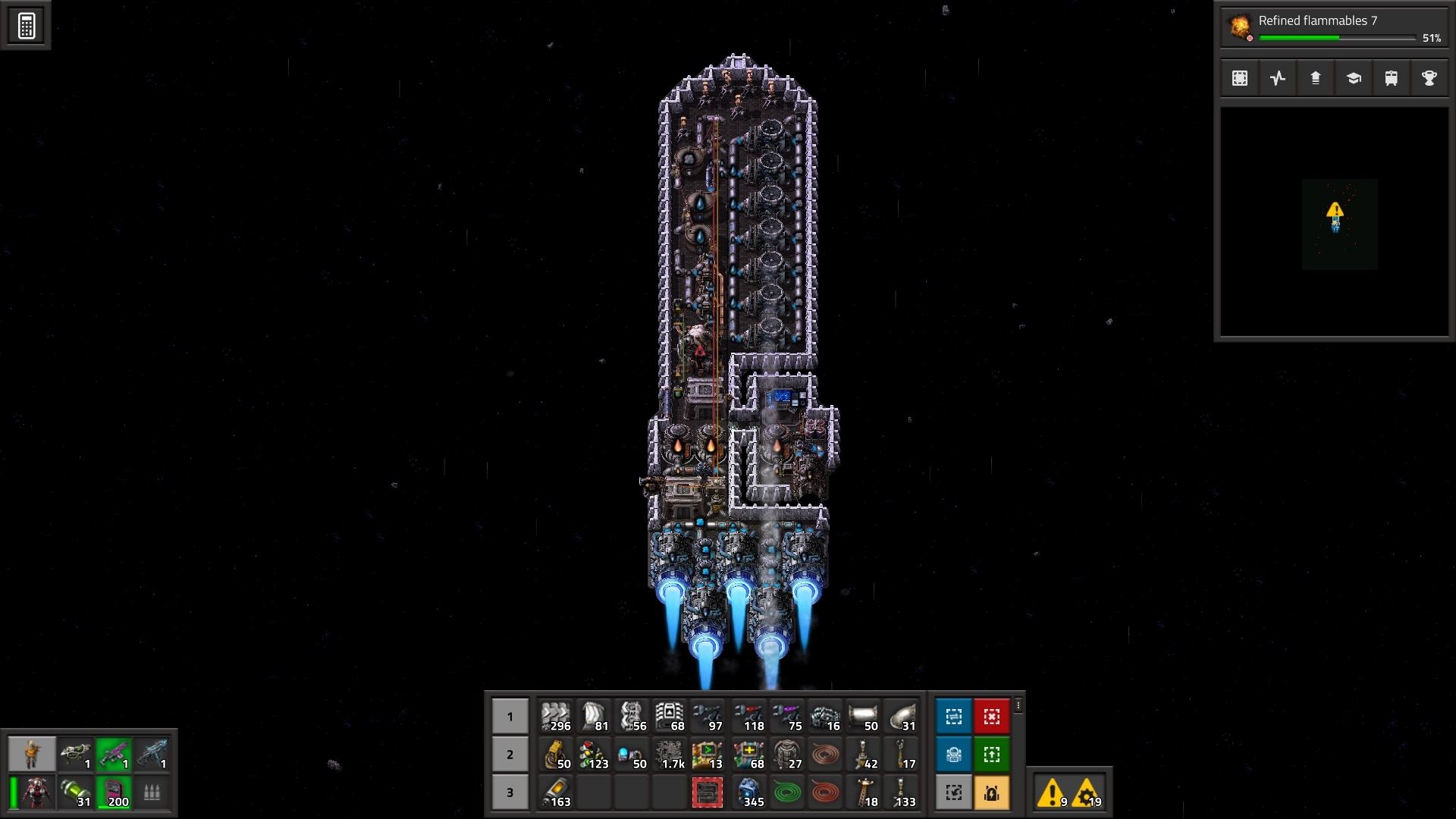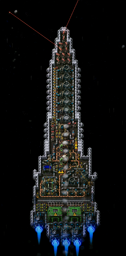 Пробую сделать корабль в редакторе. Производя 75 красных ракет/мин можно лететь 90км/с. Для повышения скорости нужно переделывать всё производство и делать в несколько раз больше ракет.