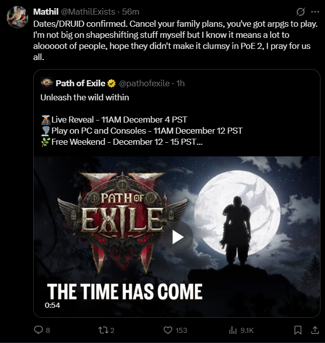 > Here's a list of what we can expect for: > - Druid > - New Weapon (druid themed) > - New Skills > - New Nodes on Passive Skill Tree > - Endgame Improvements > - New Mechanic (League or Core)