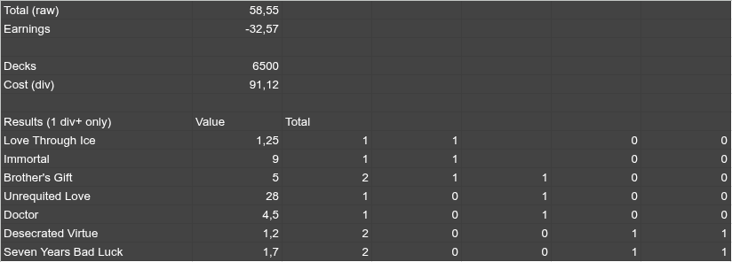 I didn't count cards worth less than a div (such as Sephirot or Divine Beauty), so while I clearly lost money, I actually lost less than 32 divs, closer to 25 (eyeballed with Wealthy Exile).
